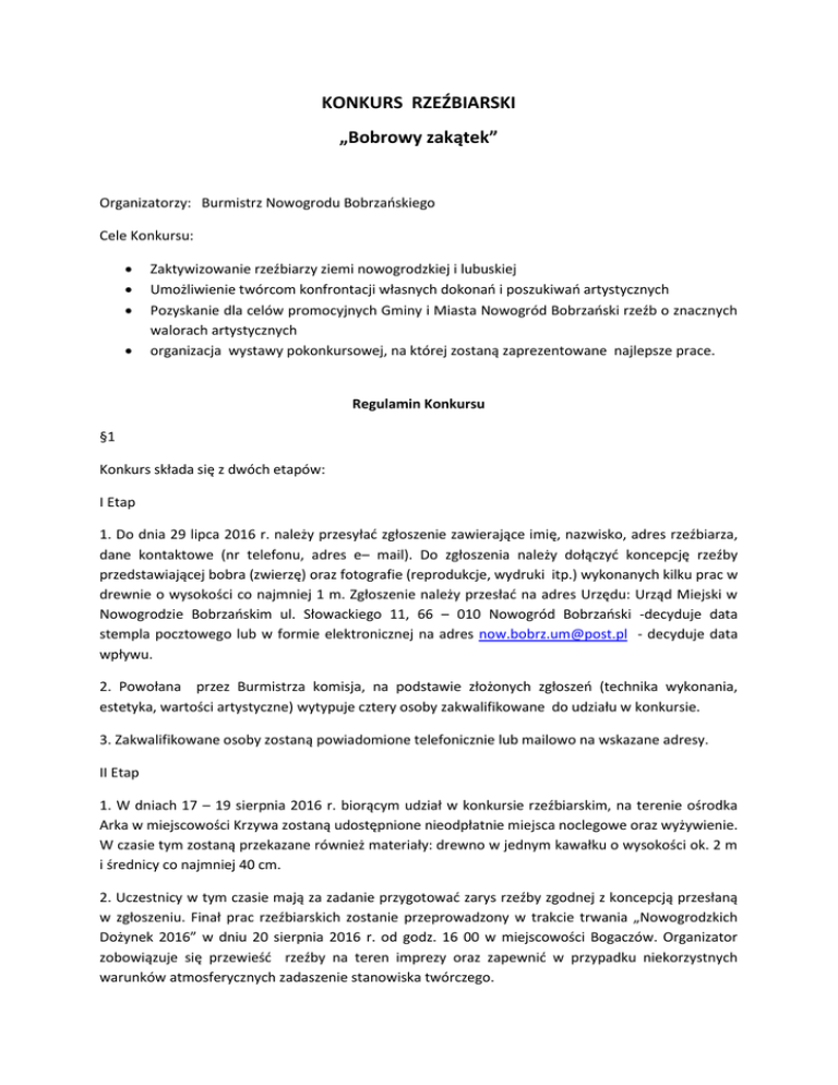 KONKURS RZEŹBIARSKI „Bobrowy zakątek” Organizatorzy: Burmistrz Nowogrodu Bobrzańskiego Cele Konkursu: Zaktywizowanie rzeźbiarzy ziemi nowogrodzkiej i lubuskiej Umożliwienie twórcom konfrontacji własnych dokonań i poszukiwań artystycznych Pozyskanie dla celów promocyjnych Gminy i Miasta Nowogród Bobrzański rzeźb o znacznych walorach artystycznych organizacja wystawy pokonkursowej, na której zostaną zaprezentowane najlepsze prace. Regulamin Konkursu §1 Konkurs składa się z dwóch etapów: I Etap 1. Do dnia 29 lipca 2016 r. należy przesyłać zgłoszenie zawierające imię, nazwisko, adres rzeźbiarza, dane kontaktowe (nr telefonu, adres e– mail). Do zgłoszenia należy dołączyć koncepcję rzeźby przedstawiającej bobra (zwierzę) oraz fotografie (reprodukcje, wydruki itp.) wykonanych kilku prac w drewnie o wysokości co najmniej 1 m. Zgłoszenie należy przesłać na adres Urzędu: Urząd Miejski w Nowogrodzie Bobrzańskim ul. Słowackiego 11, 66 – 010 Nowogród Bobrzański -decyduje data stempla pocztowego lub w formie elektronicznej na adres [email protected] - decyduje data wpływu. 2. Powołana przez Burmistrza komisja, na podstawie złożonych zgłoszeń (technika wykonania, estetyka, wartości artystyczne) wytypuje cztery osoby zakwalifikowane do udziału w konkursie. 3. Zakwalifikowane osoby zostaną powiadomione telefonicznie lub mailowo na wskazane adresy. II Etap 1. W dniach 17 – 19 sierpnia 2016 r. biorącym udział w konkursie rzeźbiarskim, na terenie ośrodka Arka w miejscowości Krzywa zostaną udostępnione nieodpłatnie miejsca noclegowe oraz wyżywienie. W czasie tym zostaną przekazane również materiały: drewno w jednym kawałku o wysokości ok. 2 m i średnicy co najmniej 40 cm. 2. Uczestnicy w tym czasie mają za zadanie przygotować zarys rzeźby zgodnej z koncepcją przesłaną w zgłoszeniu. Finał prac rzeźbiarskich zostanie przeprowadzony w trakcie trwania „Nowogrodzkich Dożynek 2016” w dniu 20 sierpnia 2016 r. od godz. 16 00 w miejscowości Bogaczów. Organizator zobowiązuje się przewieść rzeźby na teren imprezy oraz zapewnić w przypadku niekorzystnych warunków atmosferycznych zadaszenie stanowiska twórczego. 3. Wykonane dzieło nie powinno być niższe niż 1,5 m i wykorzystywać maksymalnie potencjał przekazanego drewna. Prace konkursowe oceni Komisja powołana przez Burmistrza. 4. Wykonane prace przechodzą na własność Organizatora. 5. Przewidziane są nagroda główna pieniężna w wysokości 1120zł brutto (1008 zł netto po pomniejszeniu o należny podatek) i 3 wyróżnienia po 560zł brutto (504 zł netto po pomniejszeniu o należny podatek). Zastrzega się możliwość innego podziału nagród przez jury. 6. Wyniki konkursu ogłoszone zostaną na stronie www.nowogrodbobrz.pl oraz w trakcie trwania Dożynek. internetowej Organizatora – §2 Tematem przewodnim jest hasło „Bobrowy zakątek”, którego ideą jest zainspirowanie twórców do wykonania rzeźb bobra – zwierzęcia identyfikującego miasto i gminę Nowogród Bobrzański. Materiał – drewno dostarczone zostanie nieodpłatnie przez Organizatora. §3 Uczestnikami konkursu mogą być osoby pełnoletnie z całej Polski. §4 Uroczyste wręczenie nagród dla autorów prac zwycięskich odbędzie się podczas imprezy „Bieg Bobra” w dniu 27 sierpnia 2016 r. w Nowogrodzie Bobrzańskim. §5 Prace wykonane w ramach konkursu zostaną wyeksponowane na wystawie pokonkursowej oraz jako elementy dekoracyjne witające mieszkańców i gości naszego bobrzanego regionu. §6 Biorąc udział w konkursie uczestnik wyraża zgodę na zastosowanie się do niniejszego regulaminu. Wszelkie spory wynikłe ze stosowania i interpretacji regulaminu, a także z uczestnictwa w konkursie rozstrzygane będą przez Organizatora. §7 Organizator zastrzega sobie prawo do nieodpłatnego reprodukowania prac konkursowych w celach reklamowych (w prasie, telewizji, katalogach i plakatach wystaw oraz we wszelkich innych wydawnictwach i mediach). Poprzez swoje zgłoszenie do konkursu rzeźbiarskiego, każdy uczestnik wyraża zgodę na wykorzystanie przez Organizatora swojej pracy oraz danych osobowych do celów marketingowych. Organizator zapewni uczestnikom konkursu prawo wglądu do własnych danych osobowych oraz ich korekty. Dane uczestników zostaną wykorzystane przez Organizatora wyłącznie w celach przeprowadzenia i promocji konkursu i będą wykorzystywane zgodnie z ustawą z dnia 29.08.1997 r. o ochronie danych osobowych. SERDECZNIE ZAPRASZAMY DO UDZIAŁU W KONKURSIE !