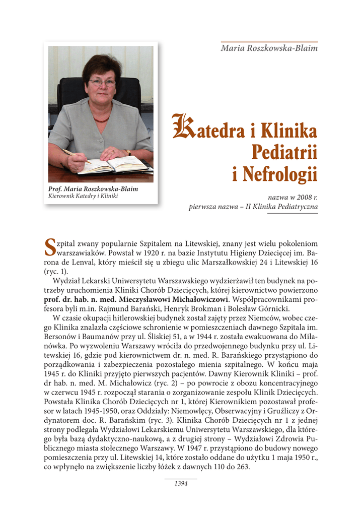 Maria Roszkowska-Blaim Katedra i Klinika Pediatrii i Nefrologii Prof. Maria Roszkowska-Blaim Kierownik Katedry i Kliniki nazwa w 2008 r. pierwsza nazwa – II Klinika Pediatryczna S zpital zwany popularnie Szpitalem na Litewskiej, znany jest wielu pokoleniom warszawiaków. Powstał w 1920 r. na bazie Instytutu Higieny Dziecięcej im. Barona de Lenval, który mieścił się u zbiegu ulic Marszałkowskiej 24 i Litewskiej 16 (ryc. 1). Wydział Lekarski Uniwersytetu Warszawskiego wydzierżawił ten budynek na potrzeby uruchomienia Kliniki Chorób Dziecięcych, której kierownictwo powierzono prof. dr. hab. n. med. Mieczysławowi Michałowiczowi. Współpracownikami profesora byli m.in. Rajmund Barański, Henryk Brokman i Bolesław Górnicki. W czasie okupacji hitlerowskiej budynek został zajęty przez Niemców, wobec czego Klinika znalazła częściowe schronienie w pomieszczeniach dawnego Szpitala im. Bersonów i Baumanów przy ul. Śliskiej 51, a w 1944 r. została ewakuowana do Milanówka. Po wyzwoleniu Warszawy wróciła do przedwojennego budynku przy ul. Litewskiej 16, gdzie pod kierownictwem dr. n. med. R. Barańskiego przystąpiono do porządkowania i zabezpieczenia pozostałego mienia szpitalnego. W końcu maja 1945 r. do Kliniki przyjęto pierwszych pacjentów. Dawny Kierownik Kliniki – prof. dr hab. n. med. M. Michałowicz (ryc. 2) – po powrocie z obozu koncentracyjnego w czerwcu 1945 r. rozpoczął starania o zorganizowanie zespołu Klinik Dziecięcych. Powstała Klinika Chorób Dziecięcych nr 1, której Kierownikiem pozostawał profesor w latach 1945-1950, oraz Oddziały: Niemowlęcy, Obserwacyjny i Gruźliczy z Ordynatorem doc. R. Barańskim (ryc. 3). Klinika Chorób Dziecięcych nr 1 z jednej strony podlegała Wydziałowi Lekarskiemu Uniwersytetu Warszawskiego, dla którego była bazą dydaktyczno-naukową, a z drugiej strony – Wydziałowi Zdrowia Publicznego miasta stołecznego Warszawy. W 1947 r. przystąpiono do budowy nowego pomieszczenia przy ul. Litewskiej 14, które zostało oddane do użytku 1 maja 1950 r., co wpłynęło na zwiększenie liczby łóżek z dawnych 110 do 263. 1394 Katedra i Klinika Pediatrii i Nefrologii Ryc. 1. Szpital pediatryczny przy ul. Litewskiej przed II wojną światową. Od września 1950 r. Klinika Chorób Dziecięcych nr 1 zmieniła strukturę organizacyjną – powstał zespół Klinik Pediatrycznych, do których włączono istniejące Oddziały. Skład jednostek organizacyjnych przedstawiał się wtedy następująco: I Klinika Pediatryczna – Kierownik: prof. dr hab. n. med. Rajmund Barański, uruchomiona z dniem 1 stycznia 1951 r.; II Klinika Pediatryczna – Kierownik: prof. dr hab. n. med. Mieczysław Michałowicz (ryc. 2). W ramach organizacji nauki i szkolnictwa wyższego 24 października 1949 r. Minister Zdrowia utworzył AkaRyc. 2. demię Lekarską w Warszawie, która następnie – 3 marca Prof. Mieczysław 1950 r. – została przemianowana na Akademię MedyczMichałowicz Kierownik Kliniki Chorób ną, w której skład weszły wszystkie szpitale kliniczne. Dziecięcych w latach W latach 1950-1952 prowadzono prace nad przebudo1920-1950 i II Kliniki wą budynku Klinik Pediatrycznych przy ul. Litewskiej Pediatrycznej w latach 1951-1959 16, nadbudowane zostało IV piętro, centralna kuchnia i stołówka pracownicza. W latach 1954-1958 w miejscu byłego budynku przy ul. Marszałkowskiej 24 postawiono nowy gmach, do którego przeniesiono Zakład Radiologii Pediatrycznej, Oddział Obserwacji, Oddział Laryngologii oraz Poliklinikę Specjalistyczną. 1 stycznia 1955 r. zespół Klinik Pediatrycznych przy ul. Litewskiej 16 został zorganizowany w Państwowy Szpital Kliniczny nr 4 podporządkowany Akademii Medycznej. W II Klinikce Pediatrycznej było wtedy 130 łóżek. 1395 Dzieje I Wydziału Lekarskiego Akademii Medycznej w Warszawie Po odtworzeniu Kliniki Dziecięcej przy ul. Litewskiej kierunki jej działalności wyznaczała, razem z prof. Michałowiczem (ryc. 5), prof. Teofila Lewenfisz-Wojnarowska. Rozwijali oni zagadnienia chorób metabolicznych u dzieci, z których w ciągu kilku lat wyłoniła się nefrologia dziecięca. W początkowym okresie problemy nefrologii dziecięcej koncentrowały się na patofizjologii układu moczowego. Szpital przy Litewskiej w tym okresie miał dwie Kliniki kierowane przez prof. T. Lewenfisz-Wojnarowską (ryc. 6) i prof. R. Barańskiego. W Klinice prof. Ryc. 3. Barańskiego do rozwoju nefrologii dziecięcej przyczyProf. Rajmund Barański nił się prof. dr hab. n. med. Marian Wojnarowski (ryc. 7) Kierownik Oddziału i prof. dr hab. n. med. Irena Krzeska (ryc. 8). Niemowlęcego, Obserwacyjnego, Gruźliczego Zespół zainteresowany nefrologią w Klinice prof. Lew latach 1945-1950 wenfisz-Wojnarowskiej tworzyła dr n. med. Maria Siei I Kliniki Pediatrycznej niawska, która pracę w Klinice Pediatrycznej w Szpitaw latach 1951-1951 lu przy Litewskiej rozpoczęła w 1952 r. po przeniesieniu z Kliniki Pediatrycznej we Wrocławiu kierowanej przez prof. dr hab. n. med. Hannę Hirszfeldową. 22 lutego 1973 r. zarządzeniem Ministra Zdrowia i Opieki Społecznej powołano Instytut Pediatrii, którego bazę stanowiły Państwowy Szpital Kliniczny AM im. prof. M. Michałowicza w Warszawie oraz Państwowy Szpital Kliniczny nr 3 AM w Warszawie przy ul. Działdowskiej 1. Kierownictwo Instytutu Pediatrii objął prof. dr hab. n. med. Bolesław Górnicki (ryc. 9), Wicedyrektorem Instytutu ds. Nauki i Dydaktyki została prof. dr hab. n. med. Halina Zapaśnik-Kobierska, a Wicedyrektorem ds. Lecznictwa i Usług doc. dr hab. n. med. Mirosława Głowacka-Ruszczak. W skład Instytutu Pediatrii weszła Katedra i II Klinika Pediatrii – Klinika Nefrologii z 80 łóżkami i Stacją Dializ, której Kierownikiem od 1979 r. była prof. dr hab. n. med. Maria Sieniawska (ryc. 10). W październiku 1980 r. zlikwidowano Kliniki Ogólnopediatryczne (I, II, III), a powstała m.in. Klinika Nefrologii. W roku 1986 powołano Oddział 