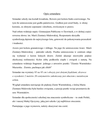 Opis sztandaru Sztandar szkoły ma kształt kwadratu. Rewers jest koloru biało-czerwonego. Na tym tle umieszczone jest godło państwowe. Godłem jest orzeł biały, w złotej koronie, ze złotymi szponami i dziobem, zwróconym w prawo. Nad orłem widnieje napis: Gimnazjum Publiczne w Dywitach, a w dolnej części rewersu słowa: im. Marii Zientary-Malewskiej. Rozpostarte skrzydła symbolizują dążenie do najwyższego lotu, gotowość do pokonywania przeszkód i trudności. Awers jest koloru granatowego i żółtego. Na jego tle umieszczono twarz Marii Zientary-Malewskiej – patronki szkoły. Poetka umieszczona w centrum zdaje się wyłaniać z koron leśnych drzew. Zieleń ukazuje niezwykłe piękno okolicznej roślinności. Kolor żółty podkreśla ciepło i związek z naturą. Na sztandarze widnieje fragment jednego z utworów poetki: "Ziemio WarmińskoMazurska. Ziemio, pachnąca jak chleb" Sztandar ma wymiary 95 na 95 cm i obszyty jest złotymi frędzlami, drzewce o wysokości 2 metrów 20 centymetrów zakończony jest okuciem z metalowym orłem. Wygląd sztandaru nawiązuje do pięknej Ziemi Warmińskiej, z którą Maria Zientara-Malewska była bardzo związana, a poezja poetki wciąż przemawia do serc Warmiaków. Sztandar dla społeczności szkolnej ma znaczenie symboliczne – to znak Polski, ale i naszej Małej Ojczyzny, jaką jest szkoła i jej najbliższe otoczenie. Pamiętając o jego wymowie, należy okazywać mu cześć.