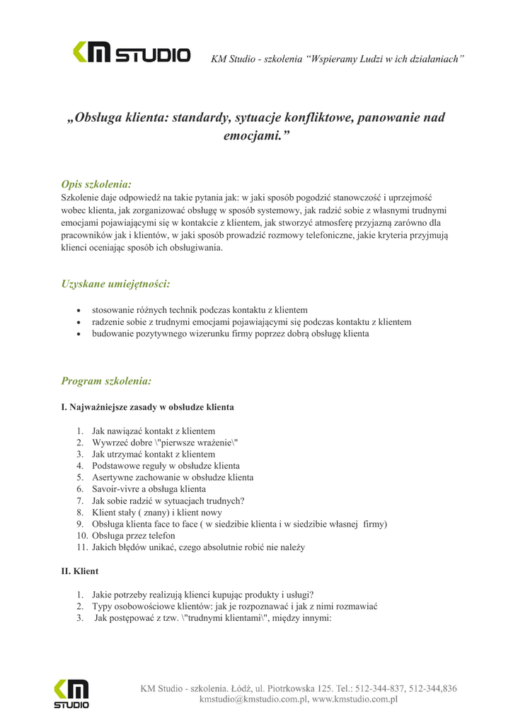 „Obsługa klienta: standardy, sytuacje konfliktowe, panowanie nad emocjami.” Opis szkolenia: Szkolenie daje odpowiedź na takie pytania jak: w jaki sposób pogodzić stanowczość i uprzejmość wobec klienta, jak zorganizować obsługę w sposób systemowy, jak radzić sobie z własnymi trudnymi emocjami pojawiającymi się w kontakcie z klientem, jak stworzyć atmosferę przyjazną zarówno dla pracowników jak i klientów, w jaki sposób prowadzić rozmowy telefoniczne, jakie kryteria przyjmują klienci oceniając sposób ich obsługiwania. Uzyskane umiejętności: stosowanie różnych technik podczas kontaktu z klientem radzenie sobie z trudnymi emocjami pojawiającymi się podczas kontaktu z klientem budowanie pozytywnego wizerunku firmy poprzez dobrą obsługę klienta Program szkolenia: I. Najważniejsze zasady w obsłudze klienta 1. 2. 3. 4. 5. 6. 7. 8. 9. 10. 11. Jak nawiązać kontakt z klientem Wywrzeć dobre \"pierwsze wrażenie\" Jak utrzymać kontakt z klientem Podstawowe reguły w obsłudze klienta Asertywne zachowanie w obsłudze klienta Savoir-vivre a obsługa klienta Jak sobie radzić w sytuacjach trudnych? Klient stały ( znany) i klient nowy Obsługa klienta face to face ( w siedzibie klienta i w siedzibie własnej firmy) Obsługa przez telefon Jakich błędów unikać, czego absolutnie robić nie należy II. Klient 1. Jakie potrzeby realizują klienci kupując produkty i usługi? 2. Typy osobowościowe klientów: jak je rozpoznawać i jak z nimi rozmawiać 3. Jak postępować z tzw. \"trudnymi klientami\", między innymi: - postawa roszczeniowa - postawa arogancka - klient, który krzyczy - klient niezdecydowany III. Sprzedawca/menager 1. Mocne i słabe strony uczestników jako osób obsługujących klientów ( jak tę wiedzę wykorzystać w praktyce) 2. Jak mówić, żeby nas słuchano? 3. Jak słuchać, żeby od nas kupowano? 4. Zasady prezentacji handlowej 5. Zasady autoprezentacji w kontakcie z klientem 6. Tworzenie indywidualnych planów rozwoju dla osób pracujących z klientami IV. W szkoleniach zamkniętych: opracowywanie Profesjonalnego Kodeksu Obsługi Klienta (PKOK) opartego na misji i filozofii firmy Metodologia: Podczas szkolenia wykorzystujemy następujące metody szkoleniowe: mini wykłady w Power Point gry zespołowe i ćwiczenia w grupach dyskusja na forum odgrywanie ról praca z kamerą i analiza uzyskanego materiału mini filmiki szkoleniowe Informacje organizacyjne: Ilość godzin szkolenia: 12 godzin / 2dni Godziny szkolenia: 9:15-15:15 Miejsce szkolenia: Łódź, ul Piotrkowska 125 – KM Studio - szkolenia