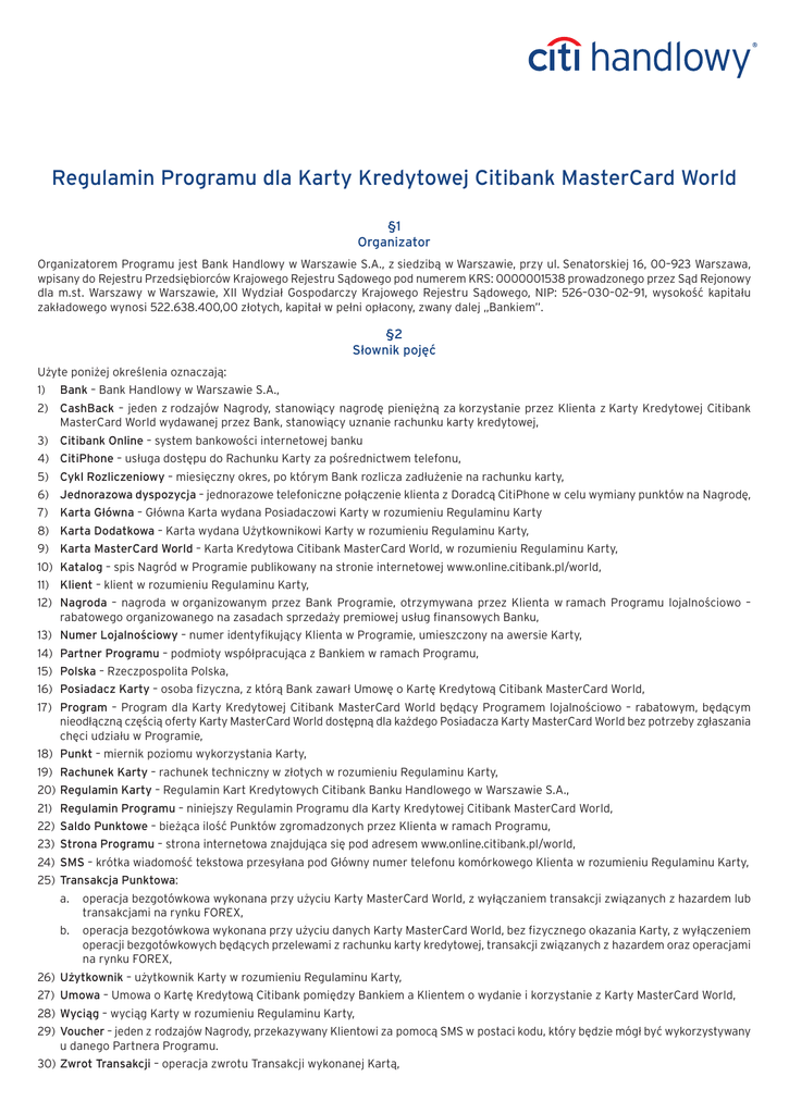 Regulamin Programu dla Karty Kredytowej Citibank MasterCard World §1 Organizator Organizatorem Programu jest Bank Handlowy w Warszawie S.A., z siedzibą w Warszawie, przy ul. Senatorskiej 16, 00–923 Warszawa, wpisany do Rejestru Przedsiębiorców Krajowego Rejestru Sądowego pod numerem KRS: 0000001538 prowadzonego przez Sąd Rejonowy dla m.st. Warszawy w Warszawie, XII Wydział Gospodarczy Krajowego Rejestru Sądowego, NIP: 526–030–02–91, wysokość kapitału zakładowego wynosi 522.638.400,00 złotych, kapitał w pełni opłacony, zwany dalej „Bankiem”. §2 Słownik pojęć Użyte poniżej określenia oznaczają: 1) Bank – Bank Handlowy w Warszawie S.A., 2) CashBack – jeden z rodzajów Nagrody, stanowiący nagrodę pieniężną za korzystanie przez Klienta z Karty Kredytowej Citibank MasterCard World wydawanej przez Bank, stanowiący uznanie rachunku karty kredytowej, 3) Citibank Online – system bankowości internetowej banku 4) CitiPhone – usługa dostępu do Rachunku Karty za pośrednictwem telefonu, 5) Cykl Rozliczeniowy – miesięczny okres, po którym Bank rozlicza zadłużenie na rachunku karty, 6) Jednorazowa dyspozycja – jednorazowe telefoniczne połączenie klienta z Doradcą CitiPhone w celu wymiany punktów na Nagrodę, 7) Karta Główna – Główna Karta wydana Posiadaczowi Karty w rozumieniu Regulaminu Karty 8) Karta Dodatkowa – Karta wydana Użytkownikowi Karty w rozumieniu Regulaminu Karty, 9) Karta MasterCard World – Karta Kredytowa Citibank MasterCard World, w rozumieniu Regulaminu Karty, 10) Katalog – spis Nagród w Programie publikowany na stronie internetowej www.online.citibank.pl/world, 11) Klient – klient w rozumieniu Regulaminu Karty, 12) Nagroda – nagroda w organizowanym przez Bank Programie, otrzymywana przez Klienta w ramach Programu lojalnościowo – rabatowego organizowanego na zasadach sprzedaży premiowej usług finansowych Banku, 13) Numer Lojalnościowy – numer identyfikujący Klienta w Programie, umieszczony na awersie Karty, 14) Partner Programu – podmioty współpracująca z Bankiem w ramach Programu, 15) Polska – Rzeczpospolita Polska, 16) Posiadacz Karty – osoba fizyczna, z którą Bank zawarł Umowę o Kartę Kredytową Citibank MasterCard World, 17) Program – Program dla Karty Kredytowej Citibank MasterCard World będący Programem lojalnościowo – rabatowym, będącym nieodłączną częścią oferty Karty MasterCard World dostępną dla każdego Posiadacza Karty MasterCard World bez potrzeby zgłaszania chęci udziału w Programie, 18) Punkt – miernik poziomu wykorzystania Karty, 19) Rachunek Karty – rachunek techniczny w złotych w rozumieniu Regulaminu Karty, 20) Regulamin Karty – Regulamin Kart Kredytowych Citibank Banku Handlowego w Warszawie S.A., 21) Regulamin Programu – niniejszy Regulamin Programu dla Karty Kredytowej Citibank MasterCard World, 22) Saldo Punktowe – bieżąca ilość Punktów zgromadzonych przez Klienta w ramach Programu, 23) Strona Programu – strona internetowa znajdująca się pod adresem www.online.citibank.pl/world, 24) SMS – krótka wiadomość tekstowa przesyłana pod Główny numer telefonu komórkowego Klienta w rozumieniu Regulaminu Karty, 25) Transakcja Punktowa: a. operacja bezgotówkowa wykonana przy użyciu Karty MasterCard World, z wyłączaniem transakcji związanych z hazardem lub transakcjami na rynku FOREX, b. operacja bezgotówkowa wykonana przy użyciu danych Karty MasterCard World, bez fizycznego okazania Karty, z wyłączeniem operacji bezgotówkowych będących przelewami z rachunku karty kredytowej, transakcji związanych z hazardem oraz operacjami na rynku FOREX, 26) Użytkownik – użytkownik Karty w rozumieniu Regulaminu Karty, 27) Umowa – Umowa o Kartę Kredytową Citibank pomiędzy Bankiem a Klientem o wydanie i korzystanie z Karty MasterCard World, 28) Wyciąg – wyciąg Karty w rozumieniu Regulaminu Karty, 29) Voucher – jeden z rodzajów Nagrody, przekazywany Klientowi za pomocą SMS w postaci kodu, który będzie mógł być wykorzystywany u danego Partnera Programu. 30) Zwrot Transakcji – operacja zwrotu Transakcji wykonanej Kartą, §3 Partnerzy Programu dla Karty Kredytowej Citibank MasterCard World 1. Program dotyczy wszystkich Klientów, którzy zawarli Umowę o Kartę Kredytową Citibank oraz są posiadaczami karty Citibank MasterCard World i jest nierozłączną częścią oferty Karty Kredytowej Citibank MasterCard World. 2. Aktualnymi Partnerami Programu są: a. Douglas Polska Sp. z o.o. – sieć perfumerii, b. Multikino S.A. – sieć multipleksów, c. Intersport Polska S.A. – sieć wielkopowierzchniowych sklepów sportowych, d. Merlin.pl S.A. – sklep internetowy, e. H & M Hennes & Mauritz Sp. z o.o. – sieć sklepów odzieżowych, f. P4 Sp. z o.o. – operator telefonii komórkowej Play, g. Pure Health & Fitness Sp. z o.o. – sieć klubów fitness Lista Partnerów Programu jest zmienna. Aktualna Lista Partnerów dostępna jest na stronie www.online.citibank.pl/world. §4 Punkty 1. W ramach Programu Klient gromadzi Punkty wymienne na Nagrody z Katalogu. 2. Posiadacz Karty posiada możliwość sprawdzenia Salda Punktów w każdym momencie kontaktując się z CitiPhone lub logując się do Citibank Online. Punkty przyznawane są za każdą Transakcję Punktową wykonaną Kartą MasterCard World, która obciążyła Rachunek Karty. Bank przyznaje Punkty zgodnie z następującymi zasadami: a. 1 Punkt za każde 5 PLN jakie obciążyło Rachunek Karty w ramach jednej Transakcji Punktowej oraz b. 1 Punkt dodatkowo za każde 5 PLN jakie obciążyło Rachunek Karty w ramach jednej Transakcji Punktowej wykonanej u Partnera Programu, jeśli transakcja taka została wykonana w sklepach Partnera w Polsce, c. 1000 Punktów bonusowych za wykonanie pierwszej Transakcji Punktowej Kartą Główną, 3. Punkty bonusowe, o których mowa w punkcie 2 c. naliczane są jednorazowo oraz nie są naliczane Klientom, którzy dokonal