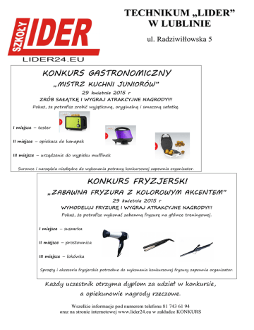 TECHNIKUM „LIDER” W LUBLINIE ul. Radziwiłłowska 5 KONKURS GASTRONOMICZNY „MISTRZ KUCHNI JUNIORÓW” 29 kwietnia 2015 r ZRÓB SAŁĄTKĘ I WYGRAJ ATRAKCYJNE NAGRODY!!! Pokaż, że potrafisz zrobić wyjątkową, oryginalną i smaczną sałatkę. I miejsce – toster II miejsce – opiekacz do kanapek III miejsce – urządzenie do wypieku muffinek Surowce i narzędzia niezbędne do wykonania potrawy konkursowej zapewnia organizator. KONKURS FRYZJERSKI „ZABAWNA FRYZURA Z KOLOROWYM AKCENTEM” 29 kwietnia 2015 r WYMODELUJ FRYZURĘ I WYGRAJ ATRAKCYJNE NAGRODY!!! Pokaż, że potrafisz wykonać zabawną fryzurę na główce treningowej. I miejsce – suszarka II miejsce – prostownica III miejsce – lokówka Sprzęty i akcesoria fryzjerskie potrzebne do wykonania konkursowej fryzury zapewnia organizator. Każdy uczestnik otrzyma dyplom za udział w konkursie, a opiekunowie nagrody rzeczowe. Wszelkie informacje pod numerem telefonu 81 743 61 94 oraz na stronie internetowej www.lider24.eu w zakładce KONKURS