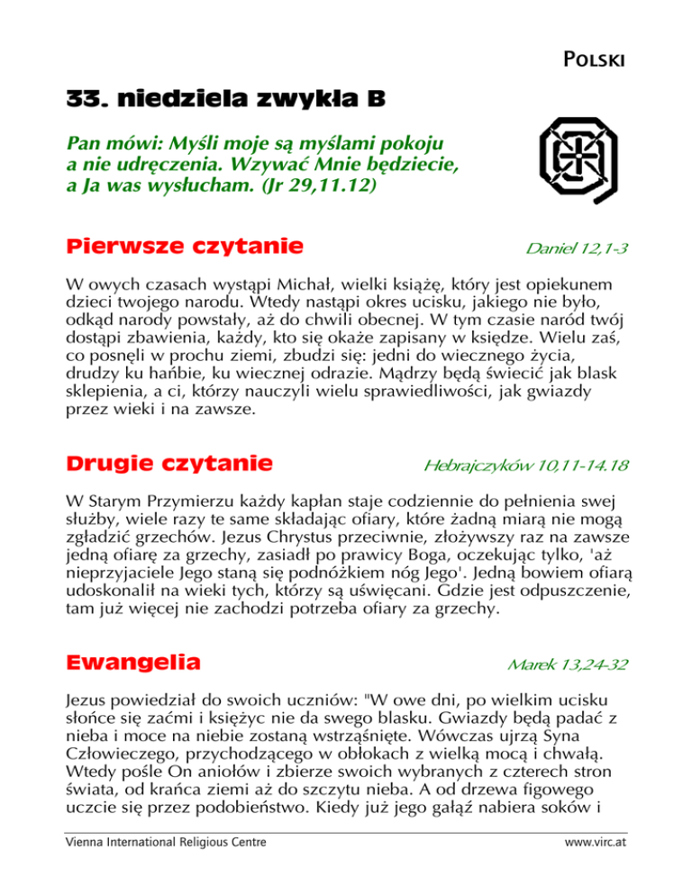 Polski Pan mówi: Myśli moje są myślami pokoju a nie udręczenia. Wzywać Mnie będziecie, a Ja was wysłucham. (Jr 29,11.12) W owych czasach wystąpi Michał, wielki książę, który jest opiekunem dzieci twojego narodu. Wtedy nastąpi okres ucisku, jakiego nie było, odkąd narody powstały, aż do chwili obecnej. W tym czasie naród twój dostąpi zbawienia, każdy, kto się okaże zapisany w księdze. Wielu zaś, co posnęli w prochu ziemi, zbudzi się: jedni do wiecznego życia, drudzy ku hańbie, ku wiecznej odrazie. Mądrzy będą świecić jak blask sklepienia, a ci, którzy nauczyli wielu sprawiedliwości, jak gwiazdy przez wieki i na zawsze. W Starym Przymierzu każdy kapłan staje codziennie do pełnienia swej służby, wiele razy te same składając ofiary, które żadną miarą nie mogą zgładzić grzechów. Jezus Chrystus przeciwnie, złożywszy raz na zawsze jedną ofiarę za grzechy, zasiadł po prawicy Boga, oczekując tylko, 'aż nieprzyjaciele Jego staną się podnóżkiem nóg Jego'. Jedną bowiem ofiarą udoskonalił na wieki tych, którzy są uświęcani. Gdzie jest odpuszczenie, tam już więcej nie zachodzi potrzeba ofiary za grzechy. Jezus powiedział do swoich uczniów: "W owe dni, po wielkim ucisku słońce się zaćmi i księżyc nie da swego blasku. Gwiazdy będą padać z nieba i moce na niebie zostaną wstrząśnięte. Wówczas ujrzą Syna Człowieczego, przychodzącego w obłokach z wielką mocą i chwałą. Wtedy pośle On aniołów i zbierze swoich wybranych z czterech stron świata, od krańca ziemi aż do szczytu nieba. A od drzewa figowego uczcie się przez podobieństwo. Kiedy już jego gałąź nabiera soków i Vienna International Religious Centre www.virc.at wypuszcza liście, poznajecie, że blisko jest lato. Tak i wy, gdy ujrzycie, że to się dzieje, wiedzcie, że blisko jest, we drzwiach. Zaprawdę powiadam wam: Nie przeminie to pokolenie, aż się to wszystko stanie. Niebo i ziemia przeminą, ale moje słowa nie przeminą. Lecz o dniu owym lub godzinie nikt nie wie, ani aniołowie w niebie, ani Syn, tylko Ojciec". Dzisiejszej niedzieli przedstawiane są nam wstrząsające wydarzenia towarzyszące dniu ostatecznemu. Jest to jednak także niedziela nadziei, oczekiwania Boga, Jego przyjścia w chwale. Oba aspekty odzwierciedlają również naszą własną rzeczywistość. Świat, w którym żyjemy, nacechowany jest nie tyle jednością i ogarniającą harmonią, lecz napięciem pomiędzy dobrem i złem, cierpieniem i radością, śmiercią i życiem, wzrastaniem i przemijaniem. Drzewo figowe jest tego obrazem: jak w przyrodzie obserwujemy coroczną śmierć i zmartwychwstanie, tak przeżywamy je również w naszym ludzkim życiu. W niezliczonych formach powrotów stawania się życia na nowo, doświadczamy wierności Boga względem nas. W tym punkcie dotykamy istotnego aspektu naszej wiary, mianowicie Stwórca życia swojego stworzenia pozostaje wierny i dlatego do Niego należy ostatnie słowo. Cała historia świata jest wielkim procesem powstawania i przemijania, rozkwitania i więdnięcia. Bóg jednak nie pozostawia nas samych, bez względu na to, co by się działo. Najbardziej wiarygodnym urzeczywistnieniem tej obietnicy Boga jest sam Jezus. On nie znosi tego napięcia, lecz je podejmuje, wytrzymuje, cierpi i poprzedza nas w drodze do tego miejsca, gdzie wszystkie łzy wysychają i gdzie nie ma już śmierci... Nie poprzedzał nas jednak po to, by zostawić nas na tej drodze mądrymi. On jest ciągle przy nas obecny i możemy w spotkaniu z Nim doświadczać zaczątków wspaniałości Boga. To przekonanie i takie doświadczenie dają naszemu życiu siły i utwierdzają nas w postawie wdzięczności. Wdzięczność za doświadczenie ciągłego umierania i zmartwychwstawania w przeszłości daje nam siły na przyszłość. Gdy w naszym życiu jest obecna obietnica Boga, wówczas nasza przeszłość i przyszłość rozjaśniane są światłem, które promieniuje od Chrystusa, który zwyciężył śmierć. On dał nam obietnicę swojej obecności z nami aż do końca świata, we wszystkie dni, w każdej sytuacji, w której się znajdujemy. Ta obietnica powinna pomóc nam wyostrzyć spojrzenie na teraźniejszość. Jeśli słowa Jezusa są teraźniejszością pośród wszelkiej przemijalności, to wszystkie rzeczy i wydarzenia otrzymują nowy sens, postrzegane są w nowej perspektywie. Powinniśmy mieć silną wiarę w życie, nacechowaną optymizmem. Nie chodzi przy tym ani o teoretyczne poznanie, ani o powierzchowne "jakoś tam będzie". Jako Kościół Jezusa Chrystusa powinniśmy być realnym znakiem nadziei w tym świecie. Świat powinien przez nas i na nas doświadczyć, że istnieje stałość pośród przemijalności i życie pośród śmierci. Wówczas możemy ze spokojnym sercem oczekiwać przemijalności nieba i ziemi. Vienna International Religious Centre [email protected]