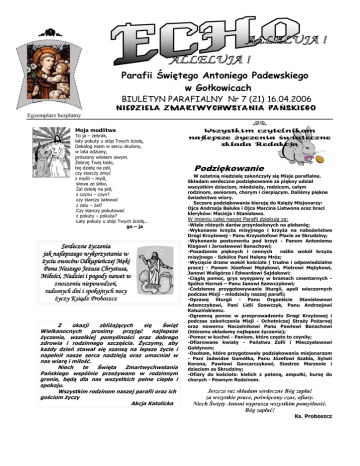 ykw Parafii Świętego Antoniego Padewskiego w Gołkowicach BIULETYN PARAFIALNY Nr 7 (21) 16.04.2006 NIEDZIELA ZMARTWYCHWSTANIA PAŃSKIEGO Egzemplarz bezpłatny Moja modlitwa To ja – żebrak, łaty pokuty u stóp Twych ścielę, Dekalog mam w sercu skulony, w lata odziany, prószony włosem siwym. Żebrzę Twej łaski, łzę dzielę na pół, czy starczy zmyć z myśli – myśl, słowa ze słów, Żal dzielę na pół, z czynu – czyn? czy starczy żałować z żalu – żal? Czy starczy pokutować z pokuty – pokuta? Łaty pokuty u stóp Twych ścielę… go – ja Serdeczne życzenia jak najlepszego wykorzystania w życiu owoców Odkupieńczej Męki Pana Naszego Naszego Jezusa Chrystusa, Chrystusa, Miłości, Nadziei i pogody nawet w znoszeniu niepowodzeń, niepowodzeń, radosnych radosnych dni i spokojnych nocy życzy Ksiądz Proboszcz Z okazji zbliżających się Świąt Wielkanocnych prosimy przyjąć najlepsze życzenia, wszelkiej pomyślności oraz dobrego zdrowia i rodzinnego szczęścia. Życzymy, aby każdy dzień stawał się szansą na lepsze życie i napełnił nasze serca nadzieją oraz umacniał w nas wiarę i miłość. Niech te Święta Zmartwychwstania Pańskiego wspólnie przeżywane w rodzinnym gronie, będą dla nas wszystkich pełne ciepła i spokoju. Wszystkim rodzinom naszej parafii oraz ich gościom życzy Akcja Katolicka aA Wszystkim czytelnikom najlepsze życzenia świąteczne składa Redakcja Podziękowanie W ostatnią niedzielę zakończyły się Misje parafialne. Składam serdeczne podziękowanie za piękny udział wszystkim dzieciom, młodzieży, rodzicom, całym rodzinom, seniorom, chorym i cierpiącym. Daliśmy piękne świadectwo wiary. Szczere podziękowania kieruję do Księży Misjonarzy: Ojca Andrzeja Bałuka i Ojca Marcina Listwona oraz braci kleryków: Macieja i Stanisława. W imieniu całej naszej Parafii dziękuję za: -Wiele różnych darów przyniesionych na plebanię; -Wykonanie krzyża misyjnego i krzyża na nabożeństwo Drogi Krzyżowej - Panu Krzysztofowi Placie ze Skrudziny; -Wykonanie postumentu pod krzyż - Panom Antoniemu Klagowi i Jarosławowi Banachowi; -Posadzenie pięknych i cennych roślin wokół krzyża misyjnego - Szkółce Pani Heleny Mróz; -Wycięcie drzew wokół kościoła ( trudne i odpowiedzialne prace) - Panom Józefowi Mężykowi, Piotrowi Mężykowi, Janowi Waligórze i Edwardowi Sajdakowi; -Ciągłą pomoc, grys wysypany w bramach cmentarnych Spółce Harnaś – Panu Janowi Szewczykowi; -Codzienne przygotowywanie liturgii, apeli wieczornych podczas Misji - młodzieży naszej parafii; -Oprawę liturgii - Panu Organiście Stanisławowi Adamczykowi, Pani Lidii Szewczyk, Panu Andrzejowi Kałuzińskiemu. -Ogromną pomoc w przeprowadzeniu Drogi Krzyżowej i podczas zakończenia Misji - Ochotniczej Straży Pożarnej oraz nowemu Naczelnikowi Panu Pawłowi Banachowi (któremu składamy najlepsze życzenia); -Pomoc w kuchni - Paniom, które często to czyniły; -Ofiarowane kwiaty - Państwu Zofii i Mieczysławowi Gołdynom; -Osobom, które przygotowały podziękowania misjonarzom - Pani Jadwidze Gomółka, Panu Józefowi Szabla, Sylwii Korona, Pawłowi Gancarczykowi, Siostrze Marzenie i dzieciom ze Skrudziny; -Ofiary do kościoła: kielich z pateną, ampułki, bursę do chorych - Pewnym Rodzinom. Jeszcze raz składam serdeczne Bóg zapłać za wszystkie prace, poświęcony czas, ofiary. Niech Święty Antoni wyprasza wszystkim pomyślność. Bóg zapłać! Ks. Proboszcz 2 Wigilia Paschalna centrum Triduum Paschalnego Jak Triduum paschalne jest centrum całego roku kościelnego, tak Wigilia Paschalna stanowi ośrodek Triduum Sacrum. Z tej racji dokumenty Kościoła poświęcają bardzo dużo uwagi jej znaczeniu i celebracji liturgii w noc paschalną, która rozpoczyna już obchód uroczystości Zmartwychwstania Pańskiego i upamiętnia świętą noc Jego powstania z martwych. Kościół nawiązuje w ten sposób do tradycji Paschy żydowskiej, która była figurą prawdziwej Paschy Chrystusa, a więc nocy prawdziwego wyzwolenia, w którą Chrystus skruszywszy więzy śmierci, jako zwycięzca wyszedł z otchłani. Obchód Wigilii Paschalnej jest już świętowaniem Paschy, która jest "uroczystością nad uroczystościami". Wyjątkowe znaczenie uroczystości Paschy wynika stąd, że Zmartwychwstanie Chrystusa jest umocnieniem naszej wiary i nadziei, a przez sakramenty wielkanocne sprawowane tej nocy następuje wszczepienie w paschalne misterium Chrystusa: umarliśmy, zostaliśmy pogrzebani i wskrzeszeni razem z Nim. Liturgia Wigilii Paschalnej posiada również aspekt eschatologiczny, jest oczekiwaniem na przyjście Pana. Bardzo rozbudowana i bogata w treść liturgia Wigilii zawiera w wielkim skrócie całą historię zbawienia, którą Kościół głosi w liturgii słowa, a następnie włącza w nią swoich wiernych przez sakramenty paschalne: chrzest, bierzmowanie i Eucharystię, która jest najpełniej sakramentem paschalnym, czyli upamiętnieniem Ofiary krzyża i obecnością Chrystusa Zmartwychwstałego, jest dopełnieniem chrześcijańskiego wtajemniczenia i przedsmakiem wieczystej Paschy. Dlatego Wigilia Paschalna jest czasem najbardziej stosownym dla sprawowania sakramentów wtajemniczenia chrześcijańskiego, które są sakramentalnym uczestnictwem w śmierci i Zmartwychwstaniu Chrystusa. Odnośnie do czasu rozpoczynania liturgii Wigilii Paschalnej przepisy Kościoła wymagają z całą stanowczością, że nie wolno nigdy jej rozpoczynać "zanim nie zapadnie noc". Od tej zasady nie może być żadnych wyjątków, nieprzestrzeganie tego czasu jest wyraźnym nadużyciem. Zachowanie odpowiedniej pory celebracji obrzędów Triduum paschalnego jest wyrazem zrozumienia jego roli w roku liturgicznym i w życiu chrześcijańskim oraz właściwego pojmowania liturgii, która posługuje się znakami i symbolami. Oprac. Ks. Czesław Krakowiak W naszej Parafii Liturgia Wigilii Paschalnej rozpocznie się o godzinie 21.00. ( s