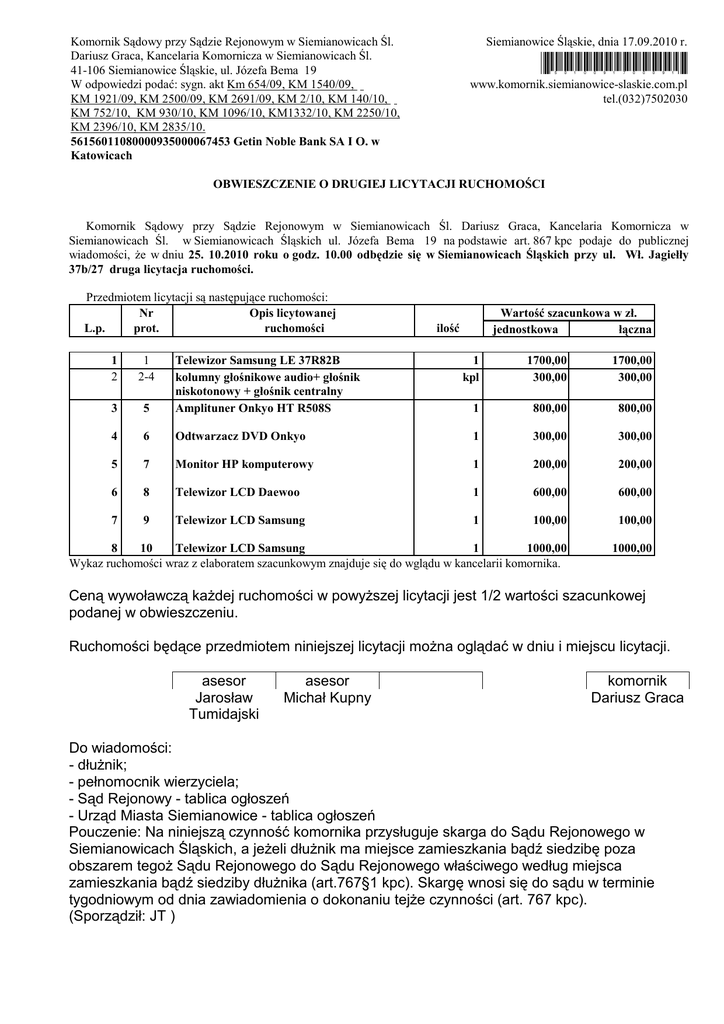 Siemianowice Śląskie, dnia 17.09.2010 r. Komornik Sądowy przy Sądzie Rejonowym w Siemianowicach Śl. Dariusz Graca, Kancelaria Komornicza w Siemianowicach Śl. 41-106 Siemianowice Śląskie, ul. Józefa Bema 19 W odpowiedzi podać: sygn. akt Km 654/09, KM 1540/09, KM 1921/09, KM 2500/09, KM 2691/09, KM 2/10, KM 140/10, KM 752/10, KM 930/10, KM 1096/10, KM1332/10, KM 2250/10, KM 2396/10, KM 2835/10. 56156011080000935000067453 Getin Noble Bank SA I O. w Katowicach *5010091700091* www.komornik.siemianowice-slaskie.com.pl tel.(032)7502030 OBWIESZCZENIE O DRUGIEJ LICYTACJI RUCHOMOŚCI Komornik Sądowy przy Sądzie Rejonowym w Siemianowicach Śl. Dariusz Graca, Kancelaria Komornicza w Siemianowicach Śl. w Siemianowicach Śląskich ul. Józefa Bema 19 na podstawie art. 867 kpc podaje do publicznej wiadomości, że w dniu 25. 10.2010 roku o godz. 10.00 odbędzie się w Siemianowicach Śląskich przy ul. Wł. Jagiełły 37b/27 druga licytacja ruchomości. Przedmiotem licytacji są następujące ruchomości: Nr Opis licytowanej L.p. prot. ruchomości 1 2 1 2-4 3 5 Telewizor Samsung LE 37R82B kolumny głośnikowe audio+ głośnik niskotonowy + głośnik centralny Amplituner Onkyo HT R508S 4 6 5 Wartość szacunkowa w zł. jednostkowa łączna ilość 1 kpl 1700,00 300,00 1700,00 300,00 1 800,00 800,00 Odtwarzacz DVD Onkyo 1 300,00 300,00 7 Monitor HP komputerowy 1 200,00 200,00 6 8 Telewizor LCD Daewoo 1 600,00 600,00 7 9 Telewizor LCD Samsung 1 100,00 100,00 8 10 Telewizor LCD Samsung 1 1000,00 Wykaz ruchomości wraz z elaboratem szacunkowym znajduje się do wglądu w kancelarii komornika. 1000,00 Ceną wywoławczą każdej ruchomości w powyższej licytacji jest 1/2 wartości szacunkowej podanej w obwieszczeniu. Ruchomości będące przedmiotem niniejszej licytacji można oglądać w dniu i miejscu licytacji. asesor Jarosław Tumidajski asesor Michał Kupny komornik Dariusz Graca Do wiadomości: - dłużnik; - pełnomocnik wierzyciela; - Sąd Rejonowy - tablica ogłoszeń - Urząd Miasta Siemianowice - tablica ogłoszeń Pouczenie: Na niniejszą czynność komornika przysługuje skarga do Sądu Rejonowego w Siemianowicach Śląskich, a jeżeli dłużnik ma miejsce zamieszkania bądź siedzibę poza obszarem tegoż Sądu Rejonowego do Sądu Rejonowego właściwego według miejsca zamieszkania bądź siedziby dłużnika (art.767§1 kpc). Skargę wnosi się do sądu w terminie tygodniowym od dnia zawiadomienia o dokonaniu tejże czynności (art. 767 kpc). (Sporządził: JT )