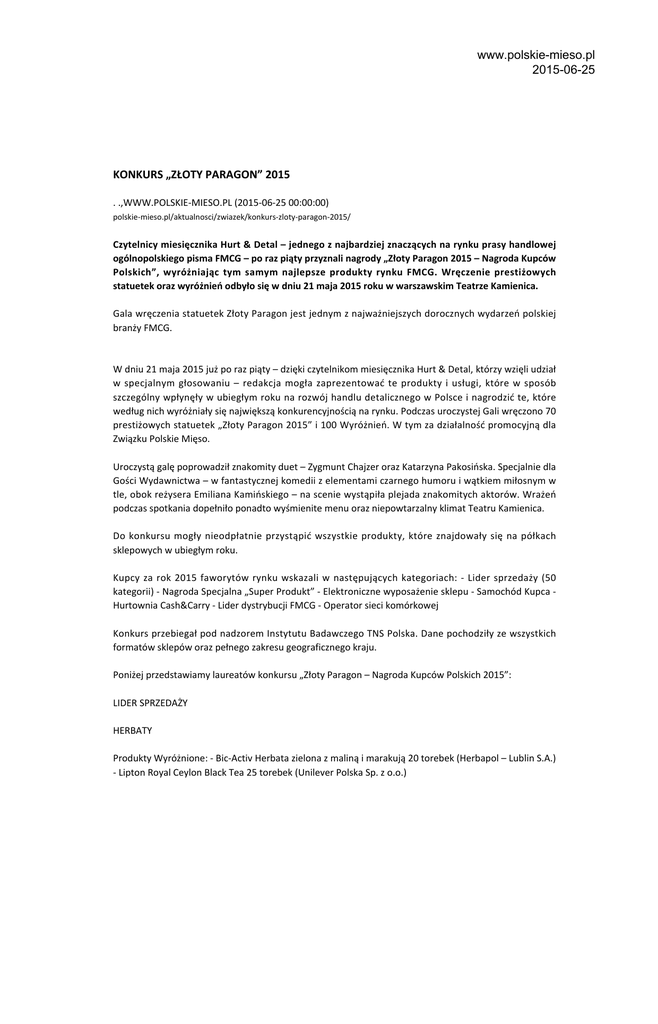 www.polskie-mieso.pl 2015-06-25 KONKURS „ZŁOTY PARAGON” 2015 . .,WWW.POLSKIE-MIESO.PL (2015-06-25 00:00:00) polskie-mieso.pl/aktualnosci/zwiazek/konkurs-zloty-paragon-2015/ Czytelnicy miesięcznika Hurt & Detal – jednego z najbardziej znaczących na rynku prasy handlowej ogólnopolskiego pisma FMCG – po raz piąty przyznali nagrody „Złoty Paragon 2015 – Nagroda Kupców Polskich”, wyróżniając tym samym najlepsze produkty rynku FMCG. Wręczenie prestiżowych statuetek oraz wyróżnień odbyło się w dniu 21 maja 2015 roku w warszawskim Teatrze Kamienica. Gala wręczenia statuetek Złoty Paragon jest jednym z najważniejszych dorocznych wydarzeń polskiej branży FMCG. W dniu 21 maja 2015 już po raz piąty – dzięki czytelnikom miesięcznika Hurt & Detal, którzy wzięli udział w specjalnym głosowaniu – redakcja mogła zaprezentować te produkty i usługi, które w sposób szczególny wpłynęły w ubiegłym roku na rozwój handlu detalicznego w Polsce i nagrodzić te, które według nich wyróżniały się największą konkurencyjnością na rynku. Podczas uroczystej Gali wręczono 70 prestiżowych statuetek „Złoty Paragon 2015” i 100 Wyróżnień. W tym za działalność promocyjną dla Związku Polskie Mięso. Uroczystą galę poprowadził znakomity duet – Zygmunt Chajzer oraz Katarzyna Pakosińska. Specjalnie dla Gości Wydawnictwa – w fantastycznej komedii z elementami czarnego humoru i wątkiem miłosnym w tle, obok reżysera Emiliana Kamińskiego – na scenie wystąpiła plejada znakomitych aktorów. Wrażeń podczas spotkania dopełniło ponadto wyśmienite menu oraz niepowtarzalny klimat Teatru Kamienica. Do konkursu mogły nieodpłatnie przystąpić wszystkie produkty, które znajdowały się na półkach sklepowych w ubiegłym roku. Kupcy za rok 2015 faworytów rynku wskazali w następujących kategoriach: - Lider sprzedaży (50 kategorii) - Nagroda Specjalna „Super Produkt” - Elektroniczne wyposażenie sklepu - Samochód Kupca Hurtownia Cash&Carry - Lider dystrybucji FMCG - Operator sieci komórkowej Konkurs przebiegał pod nadzorem Instytutu Badawczego TNS Polska. Dane pochodziły ze wszystkich formatów sklepów oraz pełnego zakresu geograficznego kraju. Poniżej przedstawiamy laureatów konkursu „Złoty Paragon – Nagroda Kupców Polskich 2015”: LIDER SPRZEDAŻY HERBATY Produkty Wyróżnione: - Bic-Activ Herbata zielona z maliną i marakują 20 torebek (Herbapol – Lublin S.A.) - Lipton Royal Ceylon Black Tea 25 torebek (Unilever Polska Sp. z o.o.) www.polskie-mieso.pl 2015-06-25 Pierwsze miejsce i Złoty Paragon: Minutka herbata czarna ekspresowa 100 torebek (Mokate S.A.) HERBATY FUNKCJONALNE I OWOCOWE Produkty Wyróżnione: - Posti Mięta herbata ziołowa 20 torebek (POSTI S.A.) - Teekanne World of Fruits Superfruits 20 torebek (TEEKANNE Polska Sp. Z o.o.) Pierwsze miejsce i Złoty Paragon: Loyd herbatka owocowa o smaku Maliny i Truskawki 20 torebek (Mokate S.A.) KAWY Produkty Wyróżnione: - Mokate Cappuccino o smaku waniliowym 100 g (Mokate Sp. z o.o.) - Woseba Mocca Fix Gold 250 g (P.P.U.H. WOSEBA Sp. z o.o.) Pierwsze miejsce i Złoty Paragon: Jacobs Krönung kawa mielona 250 g (Mondelez Polska S.A.) WODY Produkty Wyróżnione: - Ustronianka Biała Naturalna Woda Mineralna Niskosodowa 1,5 l (Ustronianka Sp. z o.o.) - Cisowianka Niegazowana Naturalna Woda Mineralna 1,5 l (Polskie Zdroje Sp. z o.o. Sp. k.) Pierwsze miejsce i Złoty Paragon: Żywiec Zdrój woda źródlana niegazowana 1,5 l (Żywiec Zdrój S.A.) NAPOJE Produkty Wyróżnione: - Hortex napój Jabłko – Rabarbar 1,75 l (Hortex Holding S.A.) - Tymbark Napój Jabłko – Gruszka 1 l (MWS Sp. z o.o. Sp. k.) Pierwsze miejsce i Złoty Paragon: Oranżada Hellena czerwona 1,25 l (Colian Sp. z o.o.) SOKI i NEKTARY Produkty Wyróżnione: - Fortuna Nektar owoce południowe bez dodatku cukru 1l (Agros-Nova Sp. z o.o.) - Hortex nektar Czarna Porzeczka 1 l (Hortex Holding S.A.) Pierwsze miejsce i Złoty Paragon: Tymbark sok 100% Multiwitamina 1 l (MWS Sp. z o.o. Sp. k.) SYROPY Produkty Wyróżnione: - Łowicz Syrop z Owoców Jagody 250 ml (Agros –Nova Sp. z o.o.) - Słoneczne Owoce syrop o smaku malinowym 430 ml (VICTORIA CYMES Sp. z o.o.) www.polskie-mieso.pl 2015-06-25 Pierwsze miejsce i Złoty Paragon: Owocowa spiżarnia Malina – syrop owocowy 240 ml (Herbapol – Lublin S.A.) NAPOJE ENERGETYCZNE I IZOTONICZNE Produkty Wyróżnione: - Black Sex Energy 250 ml puszka (FoodCare Sp. z o.o.) - Tiger Restart (MWS Sp. z o.o.) Pierwsze miejsce i Złoty Paragon: Red Bull Sugar Free 250 ml (Red Bull Sp. z o.o.) PRODUKTY ŚNIADANIOWE Produkty Wyróżnione: - Łowicz 100% z owoców Truskawka 220 g (Agros-Nova Sp. z o.o.) - Hochland Gouda ser do smarowania 140 g (Hochland Polska Sp. z o.o.) Pierwsze miejsce i Złoty Paragon: Nestlé Corn Flakes 250 g (CPP Toruń Pacific Sp. z o.o.) DŻEMY, MARMOLADY, POWIDŁA, KONFITURY Produkty Wyróżnione: - Powidła śliwkowe domowe 330 g (Firma Bracia Ubranek Andrzej i Jacek Urbanek Sp. J.) - Dżem truskawkowy Jamar niskosłodzony 280 g (ZPS JAMAR Szczepaniak Sp. J.) Pierwsze miejsce i Złoty Paragon: Łowicz Dżem Truskawkowy Niskosłodzony 280 g (Agros-Nova Sp. z o.o.) MAKARONY Produkty Wyróżnione: - Podravka Makaron Spaghetti 100% Durum 500 g (Podravka Polska Sp. z o.o.) Barilla Penne Rigate n.73 500 g (Barilla Poland Sp. z o.o.) Pierwsze miejsce i Złoty Paragon: Makaron Lubella Pełne Ziarno Pióra, 400 g (Lubella Sp. z o.o. S.K.A.) PRODUKTY SYPKIE Produkty Wyróżnione: - Britta Ryż Biały 400 g (Sawex Sp. z o.o. Foods S.k.) - Cukier Królewski biały 1 kg (SÜDZUCKER Polska S.A.) Pierwsze miejsce i Złoty Paragon: Mąka Szymanowska typ 480 (Polskie Młyny S.A.) MAJONEZY Produkty Wyróżnione: - Majonez stołowy Roleski 280 g (Roleski Sp. J.) - Majonez Napoleoński Mosso 320 ml („MOSSO” Kwaśniewscy Sp. z J.) www.polskie-mieso.pl 2015-06-25 Pierwsze miejsce i Złoty Paragon: Majonez Kielecki 500 ml (WSP „Społem”) KETCHUPY Pr