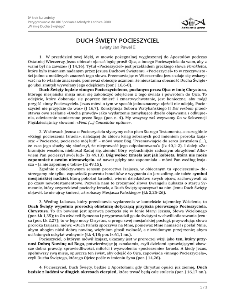 IV krok ku Lednicy Przygotowanie do XIX Spotkania Młodych Lednica 2000 „W imię Ducha Świętego” DUCH ŚWIĘTY POCIESZYCIEL święty Jan Paweł II 1. W przeddzień swej Męki, w mowie pożegnalnej wygłoszonej do Apostołów podczas Ostatniej Wieczerzy, Jezus obiecał: «Ja zaś będę prosił Ojca, a innego Pocieszyciela da wam, aby z wami był na zawsze» (J 14,16). Tytuł «Pocieszyciel» jest przekładem greckiego słowa Parakletos, które było imieniem nadanym przez Jezusa Duchowi Świętemu. «Pocieszyciel» to w rzeczywistości jedno z możliwych znaczeń tego słowa. Przemawiając w Wieczerniku Jezus zdaje się wskazywać na to właśnie znaczenie, ponieważ obiecuje uczniom, że nieustanna obecność Ducha Świętego ukoi smutek wywołany Jego odejściem (por. J 16,6-8). Duch Święty będzie «innym Pocieszycielem», posłanym przez Ojca w imię Chrystusa, którego mesjańska misja musi się zakończyć odejściem z tego świata i powrotem do Ojca. To odejście, które dokonuje się poprzez śmierć i zmartwychwstanie, jest konieczne, aby mógł przyjść «inny Pocieszyciel». Jezus mówi o tym w sposób jednoznaczny: «Jeżeli nie odejdę, Pocieszyciel nie przyjdzie do was» (J 16,7). Konstytucja Soboru Watykańskiego II Dei verbum przedstawia owo zesłanie «Ducha prawdy» jako wydarzenie zamykające dzieło objawienia i odkupienia, odwiecznie zamierzone przez Boga (por. n. 4). My wszyscy zaś wzywamy Go w Sekwencji Pięćdziesiątnicy słowami: «Veni, (…) Consolator optime». 2. W słowach Jezusa o Pocieszycielu słyszymy echo pism Starego Testamentu, a szczególnie «Księgi pocieszenia Izraela», należącej do zbioru ksiąg zebranych pod imieniem proroka Izajasza: «'Pocieszcie, pocieszcie mój lud!' – mówi wasz Bóg. 'Przemawiajcie do serca Jeruzalem (…), że czas jego służby się skończył, że nieprawość jego odpokutowana'» (Iz 40,1-2). I dalej: «Zabrzmijcie weselem, niebiosa! Raduj się, ziemio! Góry, wybuchnijcie radosnym okrzykiem! Albowiem Pan pocieszył swój lud» (Iz 49,13). Bóg wobec Izraela jest jak kobieta, która nie może zapomnieć o swoim niemowlęciu. «A nawet gdyby ona zapomniała – mówi Pan według Izajasza – Ja nie zapomnę o tobie» (Iz 49,15). Zgodnie z obiektywnym sensem proroctwa Izajasza, w obiecanym tu «pocieszeniu» dostrzegamy nie tylko zapowiedź powrotu Izraelitów z wygnania do Jerozolimy, ale także symbol mesjańskiej nadziei, którą pobożni Izraelici, wierni dziedzictwu swych ojców, zachowywali aż po czasy nowotestamentowe. Pozwala nam to zrozumieć słowa Ewangelii Łukasza o starcu Symeonie, który «wyczekiwał pociechy Izraela, a Duch Święty spoczywał na nim. Jemu Duch Święty objawił, że nie ujrzy śmierci, aż zobaczy Mesjasza Pańskiego» (Łk 2,25-26). 3. Według Łukasza, który przedstawia wydarzenia w kontekście tajemnicy Wcielenia, to Duch Święty wypełnia prorocką obietnicę dotyczącą przyjścia pierwszego Pocieszyciela, Chrystusa. To On bowiem jest sprawcą poczęcia się w łonie Maryi Jezusa, Słowa Wcielonego (por. Łk 1,35); to On oświecił Symeona i przyprowadził go do świątyni w chwili ofiarowania Jezusa (por. Łk 2,27); to w Jego mocy Chrystus, u progu swej mesjańskiej posługi, przywołując słowa proroka Izajasza, mówi: «Duch Pański spoczywa na Mnie, ponieważ Mnie namaścił i posłał Mnie, abym ubogim niósł dobrą nowinę, więźniom głosił wolność, a niewidomym przejrzenie; abym uciśnionych odsyłał wolnymi» (Łk 4,18; por. Iz 61,1 nn.). Pocieszyciel, o którym mówił Izajasz, ukazany jest w proroczej wizji jako ten, który przynosi Dobrą Nowinę od Boga, potwierdzając ją «znakami», czyli dziełami sprawiającymi zbawcze dobra prawdy, sprawiedliwości, miłości i wyzwolenia: «pocieszenie» Izraela. A kiedy Jezus, spełniwszy swą misję, opuszcza ten świat, aby odejść do Ojca, zapowiada «innego Pocieszyciela», czyli Ducha Świętego, którego Ojciec pośle w imieniu Syna (por. J 14,26). 4. Pocieszyciel, Duch Święty, będzie z Apostołami; gdy Chrystus opuści już ziemię, Duch będzie z ludźmi w długich okresach cierpień, które trwać będą całe stulecia (por. J 16,17 nn.). 1/3 IV krok ku Lednicy Przygotowanie do XIX Spotkania Młodych Lednica 2000 „W imię Ducha Świętego” Będzie zatem z Kościołem i w Kościele, szczególnie w czasach walk i prześladowań; obiecał to Apostołom sam Jezus w słowach, które przytaczają Ewangelie synoptyczne: «Kiedy was ciągnąć będą do synagog, urzędów i władz, nie martwcie się, w jaki sposób albo czym macie się bronić lub co mówić, bo Duch Święty nauczy was w tej właśnie godzinie, co należy powiedzieć» (Łk 12,11-12; por. Mk 13,11); «nie wy będziecie mówili, lecz Duch Ojca waszego będzie mówił przez was» (Mt 10,20). Słowa te możemy odnieść do prześladowań, jakich doznali Apostołowie oraz wspólnoty chrześcijańskie przez nich założone i kierowane; ale także do tych wszystkich, którzy w całej historii, we wszystkich zakątkach ziemi będą cierpieli za Chrystusa. W każdej epoce, także w czasach najnowszych, wielu ludzi rzeczywiście doznało tej pomocy Ducha Świętego. Wiedzą oni i mogą zaświadczyć, jak wielką radością jest duchowe zwycięstwo, które pozwolił im odnieść Duch Święty. Dzisiaj wie o tym i świadczy cały Kościół. 5. Od samego początku Kościół w Jerozolimie napotyka wiele przeciwności i jest prześladowany. Ale już w Dziejach Apostolskich czytamy: «Kościół cieszył się pokojem w całej Judei, Galilei i Samarii. Rozwijał się i żył bogobojnie, i napełniał się pociechą Ducha Świętego» (Dz 9,31). To obiecany przez Jezusa Duch-Pocieszyciel umacniał Apostołów i innych naśladowców Chrystusa w czasie pierwszych prześladowań i cierpień, nieustannie napełniając Kościół swoją pociechą, i wspierając go także w okresach wytchnienia i pokoju. To Jego dziełem był ów pokój i owo doj