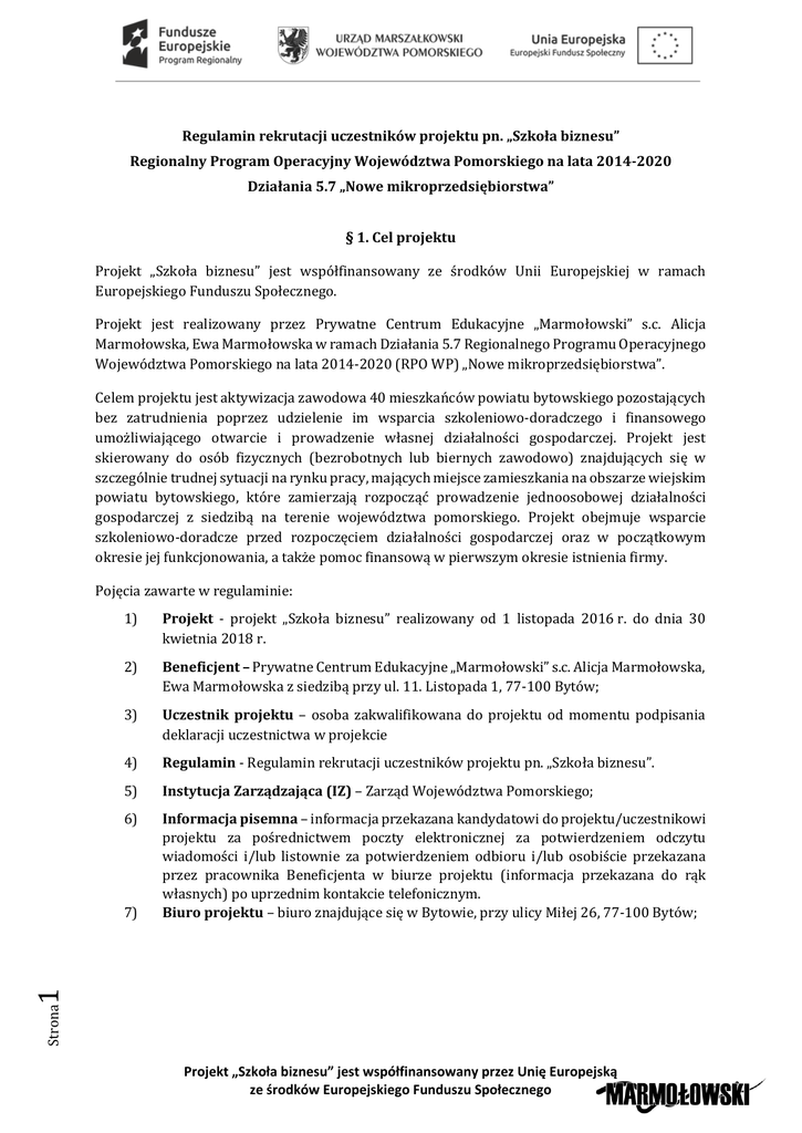 Regulamin rekrutacji uczestników projektu pn. „Szkoła biznesu” Regionalny Program Operacyjny Województwa Pomorskiego na lata 2014-2020 Działania 5.7 „Nowe mikroprzedsiębiorstwa” § 1. Cel projektu Projekt „Szkoła biznesu” jest współfinansowany ze środków Unii Europejskiej w ramach Europejskiego Funduszu Społecznego. Projekt jest realizowany przez Prywatne Centrum Edukacyjne „Marmołowski” s.c. Alicja Marmołowska, Ewa Marmołowska w ramach Działania 5.7 Regionalnego Programu Operacyjnego Województwa Pomorskiego na lata 2014-2020 (RPO WP) „Nowe mikroprzedsiębiorstwa”. Celem projektu jest aktywizacja zawodowa 40 mieszkańców powiatu bytowskiego pozostających bez zatrudnienia poprzez udzielenie im wsparcia szkoleniowo-doradczego i finansowego umożliwiającego otwarcie i prowadzenie własnej działalności gospodarczej. Projekt jest skierowany do osób fizycznych (bezrobotnych lub biernych zawodowo) znajdujących się w szczególnie trudnej sytuacji na rynku pracy, mających miejsce zamieszkania na obszarze wiejskim powiatu bytowskiego, które zamierzają rozpocząć prowadzenie jednoosobowej działalności gospodarczej z siedzibą na terenie województwa pomorskiego. Projekt obejmuje wsparcie szkoleniowo-doradcze przed rozpoczęciem działalności gospodarczej oraz w początkowym okresie jej funkcjonowania, a także pomoc finansową w pierwszym okresie istnienia firmy. Pojęcia zawarte w regulaminie: 1) Projekt - projekt „Szkoła biznesu” realizowany od 1 listopada 2016 r. do dnia 30 kwietnia 2018 r. 2) Beneficjent – Prywatne Centrum Edukacyjne „Marmołowski” s.c. Alicja Marmołowska, Ewa Marmołowska z siedzibą przy ul. 11. Listopada 1, 77-100 Bytów; 3) Uczestnik projektu – osoba zakwalifikowana do projektu od momentu podpisania deklaracji uczestnictwa w projekcie 4) Regulamin - Regulamin rekrutacji uczestników projektu pn. „Szkoła biznesu”. 5) Instytucja Zarządzająca (IZ) – Zarząd Województwa Pomorskiego; 6) Informacja pisemna – informacja przekazana kandydatowi do projektu/uczestnikowi projektu za pośrednictwem poczty elektronicznej za potwierdzeniem odczytu wiadomości i/lub listownie za potwierdzeniem odbioru i/lub osobiście przekazana przez pracownika Beneficjenta w biurze projektu (informacja przekazana do rąk własnych) po uprzednim kontakcie telefonicznym. Biuro projektu – biuro znajdujące się w Bytowie, przy ulicy Miłej 26, 77-100 Bytów; Strona 1 7) Projekt „Szkoła biznesu” jest współfinansowany przez Unię Europejską ze środków Europejskiego Funduszu Społecznego § 2. Uczestnicy projektu 1. Uczestnikiem projektu może być osoba fizyczna, która zamierza rozpocząć prowadzenie jednoosobowej działalności gospodarczej z siedzibą na terenie województwa pomorskiego i spełnia następujące warunki: a. Jest osobą bezrobotną1 lub bierną zawodową2; b. Ma miejsce zamieszkania (w rozumieniu przepisów Kodeksu cywilnego) na obszarze wiejskim powiatu bytowskiego3; c. Korzysta z pełni praw publicznych i posiada pełną zdolność do czynności prawnych; d. Dostarczy kompletne dokumenty rekrutacyjne w terminie rekrutacji do projektu. e. Ma ukończone co najmniej 30 lat. f. Znajduje się w szczególnie trudnej sytuacji na rynku pracy, tj. należących co najmniej do jednej z następujących grup: kobiety, osoby o niskich kwalifikacjach4, osoby z niepełnosprawnościami5. 2. Preferowaną grupą uczestników projektu, którzy na etapie oceny merytorycznej formularza zgłoszeniowego otrzymają dodatkowe punkty6 są: a. osoby z niepełnosprawnościami6; b. osoby z wykształceniem maksymalnie gimnazjalnym. Dodatkowe punkty zostaną przyznane na etapie oceny preferencji wyłącznie osobą, które w dniu złożenia formularza zgłoszeniowego oraz w dniu przystąpienia do projektu będą należeć do w/w grup preferowanych. 3. W projekcie nie mogą uczestniczyć: a. osoby, które posiadały aktywny wpis w Centralnej Ewidencji i Informacji o Działalności Gospodarczej (CEIDG), były zarejestrowane jako przedsiębiorcy w Krajowym Rejestrze Strona 2 1 Osoby pozostające bez pracy, gotowe do podjęcia pracy i aktywnie poszukujące zatrudnienia. Definicja uwzględnia osoby zarejestrowane jako bezrobotne zgodnie z krajowymi przepisami, nawet jeżeli nie spełniają one wszystkich trzech kryteriów. Osobami bezrobotnymi są zarówno osoby bezrobotne w rozumieniu badania aktywności ekonomicznej ludności, jak i osoby zarejestrowane jako bezrobotne. Definicja nie uwzględnia studentów studiów stacjonarnych, nawet jeśli spełniają powyższe kryteria. Osoby kwalifikujące się do urlopu macierzyńskiego lub rodzicielskiego, które są bezrobotne w rozumieniu niniejszej definicji (nie pobierają świadczeń z tytułu urlopu), są również osobami bezrobotnymi w rozumieniu Wytycznych. 2 Osoba, która w danej chwili nie tworzy zasobów siły roboczej (tzn. nie pracuje i nie jest bezrobotna). Za biernych zawodowo uznaje się m.in. studentów studiów stacjonarnych. Osoby będące na urlopie wychowawczym (rozumianym jako nieobecność w pracy, spowodowana opieką nad dzieckiem w okresie, który nie mieści się w ramach urlopu macierzyńskiego lub urlopu rodzicielskiego), uznawane są za bierne zawodowo, chyba że są zarejestrowane już jako bezrobotne (wówczas status bezrobotnego ma pierwszeństwo). Osoby prowadzące działalność na własny rachunek (w tym bezpłatnie pomagający osobie prowadzącej działalność członek rodziny) nie są uznawane za bierne zawodowo. 3 Art. 25 Kodeksu cywilnego stanowi, iż „Miejscem zamieszkania osoby fizycznej jest miejscowość, w której osoba ta przebywa z zamiarem stałego pobytu”. Według GUS, obszarami wiejskimi są tereny położone poza granicami administracyjnymi miast – obszary gmin wiejskich oraz część wiejska (leżąca poza miastem) gminy miejsko – wiejskiej. 4 Osoby posiadające maksymalnie wykształcenie ponadgimnazjalne (ISCED 3) włącznie. 5 Osoby 