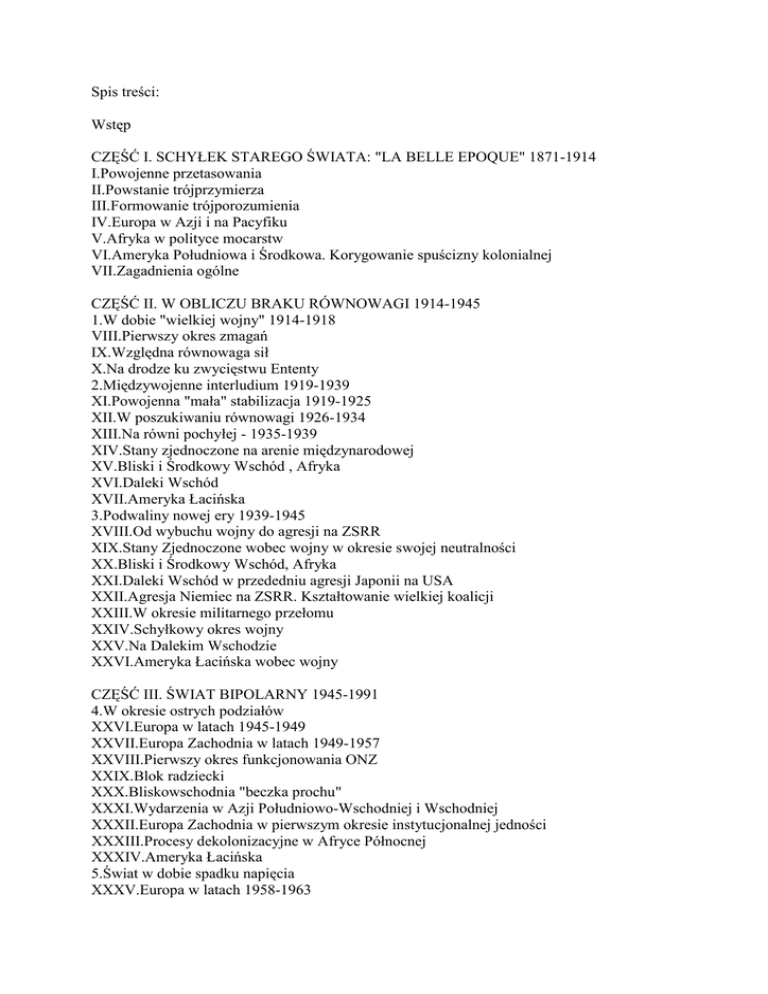 Spis treści: Wstęp CZĘŚĆ I. SCHYŁEK STAREGO ŚWIATA: "LA BELLE EPOQUE" 1871-1914 I.Powojenne przetasowania II.Powstanie trójprzymierza III.Formowanie trójporozumienia IV.Europa w Azji i na Pacyfiku V.Afryka w polityce mocarstw VI.Ameryka Południowa i Środkowa. Korygowanie spuścizny kolonialnej VII.Zagadnienia ogólne CZĘŚĆ II. W OBLICZU BRAKU RÓWNOWAGI 1914-1945 1.W dobie "wielkiej wojny" 1914-1918 VIII.Pierwszy okres zmagań IX.Względna równowaga sił X.Na drodze ku zwycięstwu Ententy 2.Międzywojenne interludium 1919-1939 XI.Powojenna "mała" stabilizacja 1919-1925 XII.W poszukiwaniu równowagi 1926-1934 XIII.Na równi pochyłej - 1935-1939 XIV.Stany zjednoczone na arenie międzynarodowej XV.Bliski i Środkowy Wschód , Afryka XVI.Daleki Wschód XVII.Ameryka Łacińska 3.Podwaliny nowej ery 1939-1945 XVIII.Od wybuchu wojny do agresji na ZSRR XIX.Stany Zjednoczone wobec wojny w okresie swojej neutralności XX.Bliski i Środkowy Wschód, Afryka XXI.Daleki Wschód w przededniu agresji Japonii na USA XXII.Agresja Niemiec na ZSRR. Kształtowanie wielkiej koalicji XXIII.W okresie militarnego przełomu XXIV.Schyłkowy okres wojny XXV.Na Dalekim Wschodzie XXVI.Ameryka Łacińska wobec wojny CZĘŚĆ III. ŚWIAT BIPOLARNY 1945-1991 4.W okresie ostrych podziałów XXVI.Europa w latach 1945-1949 XXVII.Europa Zachodnia w latach 1949-1957 XXVIII.Pierwszy okres funkcjonowania ONZ XXIX.Blok radziecki XXX.Bliskowschodnia "beczka prochu" XXXI.Wydarzenia w Azji Południowo-Wschodniej i Wschodniej XXXII.Europa Zachodnia w pierwszym okresie instytucjonalnej jedności XXXIII.Procesy dekolonizacyjne w Afryce Północnej XXXIV.Ameryka Łacińska 5.Świat w dobie spadku napięcia XXXV.Europa w latach 1958-1963 XXXVI.Europa w dobie "detente" XXXVII.Na najwyŜszym szczeblu. Stosunki amerykańsko-radzieckie XXXVIII.Brak stabilizacji na Bliskim i Środkowym wschodzie XXXIX.Azja Południowo-Wschodnia i Daleki Wschód XL.Afrykańskie niepokoje XLI.Na półkuli zachodniej 6.W okresie względnej stabilizacji XLII.Europa w latach 1976-1989 XLIII.Negocjacje rozbrojeniowe w gronie supermocarstw oraz między Zachodem a Wschodem XLIV.Bliski i Środkowy wschód XLV.Daleki Wschód XLVI.Afryka XLVII.Ameryka Łacińska XLVIII.Australia i Nowa Zelandia 7.DemontaŜ układu dwublokowego XLIX.Europa na przełomie lat 80 i 90 Bibliografia Indeks nazwisk Spis map