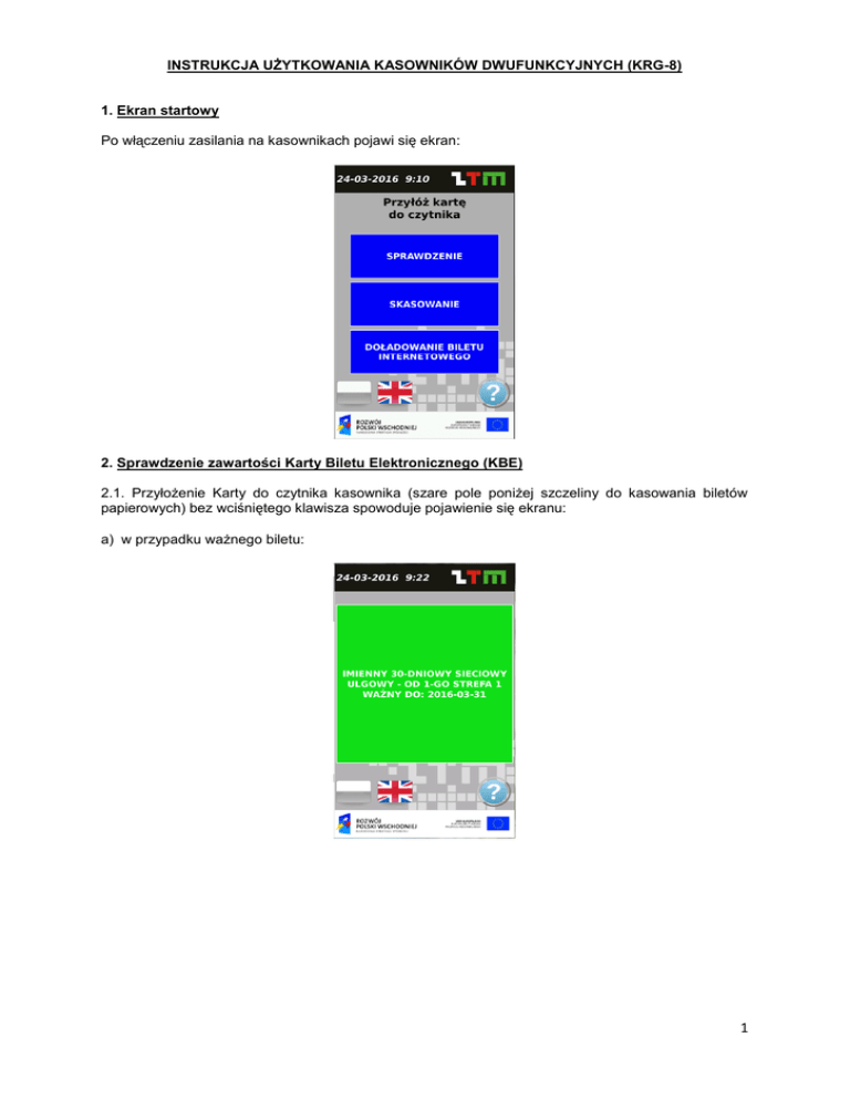 INSTRUKCJA UŻYTKOWANIA KASOWNIKÓW DWUFUNKCYJNYCH (KRG-8) 1. Ekran startowy Po włączeniu zasilania na kasownikach pojawi się ekran: 2. Sprawdzenie zawartości Karty Biletu Elektronicznego (KBE) 2.1. Przyłożenie Karty do czytnika kasownika (szare pole poniżej szczeliny do kasowania biletów papierowych) bez wciśniętego klawisza spowoduje pojawienie się ekranu: a) w przypadku ważnego biletu: 1 b) w przypadku braku ważnego biletu: 2.2. Aby sprawdzić jakie bilety są zapisane na KBE wciskamy przycisk zostanie on wtedy zaznaczony . Następnie przykładamy Kartę do czytnika kasownika (szare pole poniżej szczeliny do kasowania biletów papierowych). Po przyłożeniu pojawi się ekran: Pierwsze okienko informuje o zapisanych biletach okresowych. Kolejne dwa okienka informują o biletach czasowych lub jednoprzejazdowych. Po odstawieniu Karty z pola anteny, ekran ten zniknie po kilku sekundach i powróci do ekranu startowego 2 3. Kasowanie biletów czasowych lub jednoprzejazdowych Aby skasować bilet należy: a) przytrzymać przycisk zostanie on wtedy zaznaczony b) przyłożyć Kartę do czytnika kasownika (szare pole poniżej szczeliny do kasowania biletów papierowych). Pojawi się ekran: Nie jest wymagane trzymanie Karty cały czas przy kasowniku. Ekran ten będzie wyświetlany przez dłuższą chwilę. W przypadku braku aktywności na tym ekranie, zostanie on zamknięty i wróci do ekranu startowego. c) za pomocą przycisków d) wcisnąć przycisk wybrać pożądaną do skasowania ilość biletów: tak by został on zaznaczony 3 e) przyłożyć Kartę do czytnika kasownika (szare pole poniżej szczeliny do kasowania biletów papierowych). Kasownik wyświetli komunikat o ilości skasowanych biletów. Aby skasować bilet innego rodzaju, który zakodowany został na KBE należy postępować zgodnie z opisem zawartym w pkt. 3 a-e niniejszej instrukcji, wybierając tylko inny rodzaj biletu. 4. Doładowanie biletów zakupionych w sklepie internetowym Bilety zakupione w sklepie internetowym można zakodować w kasowniku po trzech godzinach od kiedy zostały zakupione (w przypadku wystąpienia problemów z przesyłem danych czas ten może ulec wydłużeniu). Bilet okresowy kupiony w sklepie internetowym jest ważny dopiero po zakodowaniu w kasowniku lub w jednym z punktów sprzedaży Mennicy Polskiej SA, zaś z biletów jednoprzejazdowych i czasowych można korzystać (kasować) po wcześniejszym doładowaniu na Kartę. Aby doładować KBE biletem/biletami wcześniej zakupionymi w sklepie internetowym należy: 1. wybrać przycisk tak by został on zaznaczony 2. następnie włożyć kartę w szczelinę zlokalizowaną z boku szarego pola kasownika. Poprawne zapisanie biletu/biletów jest potwierdzone komunikatem „Bilet został zapisany” 4 3. w przypadku, gdy na Karcie znajdują się dwa wcześniej zakupione bilety okresowe, których ważność jeszcze nie upłynęła, lub w przypadku, gdy na Karcie znajdują się dwa różne, niewykorzystane rodzaje biletów czasowych/jednoprzejazdowych, pojawi się okno wyboru. Przykładowe okno wyboru dla biletów okresowych: Jeśli nie chcesz utracić zapisanych na Karcie, jeszcze ważnych biletów wybierz przycisk Jeśli zdecydujesz się na zamianę, to wybierz okno, w którym widnieje bilet do zastąpienia i naciśnij przycisk Po wykonaniu tej operacji wyświetli się informacja potwierdzająca zapis biletu na Karcie. UWAGA!!! Podczas próby kodowania biletu/biletów, kupionych wcześniej w sklepie www, mogą pojawić się na wyświetlaczu kasownika komunikaty na czerwonym tle. W zależności od treści komunikatu należy postępować następująco: 5 Jeśli na ekranie kasownika wyświetli sie komunikat o treści „Brak transakcji” to należy sprawdzić status zamówienia w sklepie internetowym tj. upewnić się czy transakcja została faktycznie opłacona (pojawienie sie tego komunikatu może wynikać np. z faktu, że transakcja w sklepie nie została zakończona lub nie odnotowano wpływu środków na konto operatora).Jeśli tak, to spróbuj doładować bilet w innym punkcie sprzedaży Mennicy Polskiej SA (automaty stacjonarne lub punkty sprzedaży wyposażone w terminale do kodowania biletów) lub odczekaj jeden dzień, a następnie spróbuj ponownie zakodować bilet w kasowniku. Jeśli na ekranie kasownika wyświetli sie komunikat o treści „Niepowodzenie” lub „Niedokończone doładowanie” oznacza to, że na Karcie nie został zapisany bilet. Może mieć to związek, z tym że karta została zbyt szybko wyciągnięta z kasownika co spowodowało jej uszkodzenia. W takich przypadkach spróbuj ponownie doładować bilet, jeśli kolejna próba zakończy się ponownie niepowodzeniem to niezwłocznie zgłoś się do Biura Obsługi Klienta ZTM w Lublinie (al. Kraśnicka 25). 6
