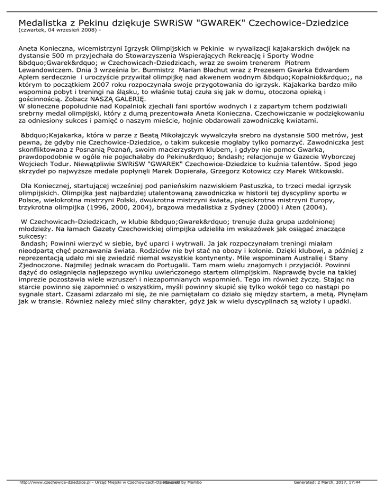 Medalistka z Pekinu dziękuje SWRiSW "GWAREK" Czechowice-Dziedzice (czwartek, 04 wrzesień 2008) - Aneta Konieczna, wicemistrzyni Igrzysk Olimpijskich w Pekinie w rywalizacji kajakarskich dwójek na dystansie 500 m przyjechała do Stowarzyszenia Wspierających Rekreację i Sporty Wodne „Gwarek” w Czechowicach-Dziedzicach, wraz ze swoim trenerem Piotrem Lewandowiczem. Dnia 3 września br. Burmistrz Marian Błachut wraz z Prezesem Gwarka Edwardem Aplem serdecznie i uroczyście przywitał olimpijkę nad akwenem wodnym „Kopalniok”, na którym to początkiem 2007 roku rozpoczynała swoje przygotowania do igrzysk. Kajakarka bardzo miło wspomina pobyt i treningi na śląsku, to właśnie tutaj czuła się jak w domu, otoczona opieką i gościnnością. Zobacz NASZĄ GALERIĘ. W słoneczne popołudnie nad Kopalniok zjechali fani sportów wodnych i z zapartym tchem podziwiali srebrny medal olimpijski, który z dumą prezentowała Aneta Konieczna. Czechowiczanie w podziękowaniu za odniesiony sukces i pamięć o naszym mieście, hojnie obdarowali zawodniczkę kwiatami. „Kajakarka, która w parze z Beatą Mikołajczyk wywalczyła srebro na dystansie 500 metrów, jest pewna, że gdyby nie Czechowice-Dziedzice, o takim sukcesie mogłaby tylko pomarzyć. Zawodniczka jest skonfliktowana z Posnanią Poznań, swoim macierzystym klubem, i gdyby nie pomoc Gwarka, prawdopodobnie w ogóle nie pojechałaby do Pekinu” – relacjonuje w Gazecie Wyborczej Wojciech Todur. Niewątpliwie SWRiSW "GWAREK" Czechowice-Dziedzice to kuźnia talentów. Spod jego skrzydeł po najwyższe medale popłynęli Marek Dopierała, Grzegorz Kotowicz czy Marek Witkowski. Dla Koniecznej, startującej wcześniej pod panieńskim nazwiskiem Pastuszka, to trzeci medal igrzysk olimpijskich. Olimpijka jest najbardziej utalentowaną zawodniczka w historii tej dyscypliny sportu w Polsce, wielokrotna mistrzyni Polski, dwukrotna mistrzyni świata, pięciokrotna mistrzyni Europy, trzykrotna olimpijka (1996, 2000, 2004), brązowa medalistka z Sydney (2000) i Aten (2004). W Czechowicach-Dziedzicach, w klubie „Gwarek” trenuje duża grupa uzdolnionej młodzieży. Na łamach Gazety Czechowickiej olimpijka udzieliła im wskazówek jak osiągać znaczące sukcesy: – Powinni wierzyć w siebie, być uparci i wytrwali. Ja jak rozpoczynałam treningi miałam nieodpartą chęć poznawania świata. Rodziców nie był stać na obozy i kolonie. Dzięki klubowi, a później z reprezentacją udało mi się zwiedzić niemal wszystkie kontynenty. Mile wspominam Australię i Stany Zjednoczone. Najmilej jednak wracam do Portugalii. Tam mam wielu znajomych i przyjaciół. Powinni dążyć do osiągnięcia najlepszego wyniku uwieńczonego startem olimpijskim. Naprawdę bycie na takiej imprezie pozostawia wiele wzruszeń i niezapomnianych wspomnień. Tego im również życzę. Stając na starcie powinno się zapomnieć o wszystkim, myśli powinny skupić się tylko wokół tego co nastąpi po sygnale start. Czasami zdarzało mi się, że nie pamiętałam co działo się między startem, a metą. Płynęłam jak w transie. Również należy mieć silny charakter, gdyż jak w wielu dyscyplinach są wzloty i upadki. http://www.czechowice-dziedzice.pl - Urząd Miejski w Czechowicach-Dziedzicach Powered by Mambo Generated: 2 March, 2017, 17:44