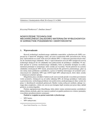 Górnictwo i Geoinżynieria • Rok 28 • Zeszyt 3/1 • 2004 Krzysztof Pietkiewicz*, Emilian Janusz* NOWOCZESNE TECHNOLOGIE MECHANICZNEGO ZAŁADUNKU MATERIAŁÓW WYBUCHOWYCH W GÓRNICTWIE PODZIEMNYM I ODKRYWKOWYM 1. Wprowadzenie Rozwój technologii mechanicznego załadunku materiałów wybuchowych (MW) rozpoczął się w latach 60. ubiegłego wieku, od czasu wynalezienia MW zawiesinowych. Od tej pory wprowadzono na rynek wiele nowych odmian MW, w większości przeznaczonych właśnie do mechanicznego załadunku. Wraz z wprowadzaniem nowych MW następował rozwój technologii służących do ich załadunku oraz jednocześnie do produkcji i załadunku. W artykule opisano te systemy mechanicznego załadunku, które są aktualnie dostępne na rynku, natomiast pominięto te technologie, które zostały już wycofane. Nacisk położono na systemy załadunku emulsyjnych MW luzem, przeznaczonych dla górnictwa podziemnego, gdyż są one mniej znane polskiemu czytelnikowi, a przez to bardziej interesujące od systemów przeznaczonych do załadunku MW typu ANFO bądź MW nabojowanych, które także zostały w niniejszym artykule opisane. Długoletnia praca ośrodków badawczych zaowocowała przede wszystkim powstaniem wielu systemów, różniących się od siebie odmianą MW, do którego produkcji i ładowania są przeznaczone, technologią produkcji oraz podwoziem, predysponującym dany system do pracy w określonych warunkach górniczych. Bardzo ważną cechą jest zasilanie, jakiego wymaga dane urządzenie, a które nie zawsze jest dostępne bądź uważane jest przez dany zakład górniczy za mniej dogodne. Poniżej zaproponowano klasyfikację, która ułatwi mniej zorientowanemu czytelnikowi dalszą lekturę artykułu, gdyż ten ramowy podział uwypukla podstawowe różnice pomiędzy wszystkimi przedstawionymi systemami. Podział ze względu na postać materiału wybuchowego — MW luzem, — MW nabojowane. * Dyno Nobel Poland Sp. z o.o., Wrocław 397 Podział ze względu na rodzaj materiału wybuchowego — MW emulsyjne, — MW typu ANFO, — inne MW. Podział za względu na przeznaczenie — górnictwo podziemne, — górnictwo odkrywkowe, — górnictwo podziemne i odkrywkowe. 2. Systemy mechanicznego załadunku materiałów wybuchowych emulsyjnych luzem 2.1. System UBS System UBS (Underground Bulk System) (rys. 1) został wdrożony do stosowania 14 lat temu przez African Explosives Limited (AEL). W ciągu ostatnich kilku lat, głównie dzięki swojej prostocie, system znacznie zyskał na popularności. Aktualnie ponad 100 urządzeń opartych na systemie UBS jest wykorzystywanych w południowej Afryce, również w Australii trwają prace nad wdrożeniem tego systemu na szerszą skalę. W oparciu o wcześniej zaproponowaną klasyfikację system UBS jest systemem służącym do produkcji i załadunku emulsyjnych materiałów wybuchowych luzem, przeznaczonym dla górnictwa podziemnego. System cechuje się prostą budową, a zatem łatwą obsługą i niską awaryjnością. Podstawowymi elementami systemu są zbiorniki na matrycę emulsji, chemiczny uczulacz oraz wodę, pompa tłokowa matrycy emulsji, pompa dozująca chemiczny uczulacz, pompa dozująca wodę oraz mikser. Gabaryty urządzenia predysponują go do pracy w wyrobiskach korytarzowych o wysokości furty około 1,8 m. Jednym z podstawowych parametrów każdego MW jest jego gęstość (g/cm3). Ma ona wpływ przede wszystkim na zachowanie się materiału w środowisku zawodnionym, siłę oddziaływania na ośrodek skalny, a także często na cenę (koszt ponoszony przez odbiorcę). Na gęstość MW emulsyjnych luzem wpływ ma natomiast chemiczny uczulacz, tzn. jego rodzaj (właściwości) oraz ilość, w jakiej zostanie dodany do matrycy emulsji. W przypadku systemu UBS nie ma możliwości regulacji gęstości poprzez zmianę ilości dodawanego chemicznego uczulacza, gdyż pompa dozująca pracuje z niezmienną wydajnością. Zmiana gęstości materiału jest możliwa tylko przez wymianę pompy na inną. Stała gęstość MW może być traktowana w niektórych przypadkach jako wada, gdyż brak możliwości jej zmiany uniemożliwia optymalny dobór parametrów MW dla danych warunków urabiania. Jednak w praktyce, gdy urządzenie pracuje w jednym zakładzie górniczym charakteryzującym się względnie niewielką zmiennością urabianej skały, gęstość jest ustawiana na jedną stałą wartość i nie jest zmieniana przez dłuższy okres pracy urządzenia. Należy pamiętać, że zmiana gęstości MW ma bardzo duży wpływ na końcowy rezultat strzelania, 398 w związku z czym powinien o tym decydować wykwalifikowany i doświadczony personel, a zmianę jej wartości przeprowadzać po dokładnym przeanalizowaniu korzyści mających z niej wyniknąć. Rys. 1. System UBS [2] Urządzenie cechuje się prędkością załadunku wynoszącą 50 kg/min i umożliwia również załadunek otworów w stropie o średnicy do 102 mm. Urządzenie wymaga zasilania hydraulicznego lub hydraulicznego zasilanego elektrycznie. Urządzenie może być montowane na stałe na podwoziu wozu górniczego bądź dowożone na miejsce pracy za pomocą samochodu typu pick-up, ładowarki itp. Nieuczulona matryca emulsji posiada gęstość 1,45 g/cm3. Okres przydatności do użycia wynosi 12 tygodni od daty produkcji. Po załadowaniu do otworów gęstość spada do około 1,00 g/cm3. System UBS nie pozwala ładować otworów techniką „string loading”, o której szerzej napisano przy okazji omawiania pozostałych systemów. Średnica krytyczna otworu strzałowego, poniżej której istnieje ryzyko deflagracji, wynosi 19 mm. Zalecane średnice, przy których ładowanie odbywa się najefektywniej, to 32÷45 mm. Proces chemicznego uczulania kończy się 10 minut po załadowaniu emulsji do otworu strzałowego, kiedy to staje się ona materiałem wybuchowym. Kontrola gęstości powinna odbyć się przed każdą zmianą roboczą. Gęstość matrycy można zbadać, ważąc ni