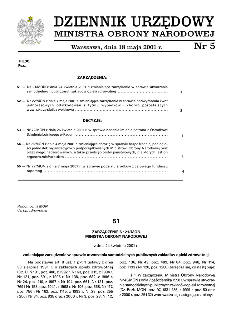 DZIENNIK URZĘDOWY Dzienik Urzędowy Ministra Obrony Narodowej WD AW —1— MINISTRA OBRONY NARODOWEJ Nr 5 Warszawa, dnia 18 maja 2001 r. TREŚĆ: Poz.: ZARZĄDZENIA: 51 — Nr 21/MON z dnia 24 kwietnia 2001 r. zmieniające zarządzenie w sprawie utworzenia samodzielnych publicznych zakładów opieki zdrowotnej . . . . . . . . . . . . . . . . . . . . . . . . . . . . . . . . . . 1 52 — Nr 22/MON z dnia 7 maja 2001 r. zmieniające zarządzenie w sprawie podwyższenia kwot jednorazowych odszkodowań z tytułu wypadków i chorób pozostających w związku ze służbą wojskową . . . . . . . . . . . . . . . . . . . . . . . . . . . . . . . . . . . . . . . . . . . . . . . . . . . . . . . . . . . . . . . . 2 DECYZJE: 53 — Nr 72/MON z dnia 26 kwietnia 2001 r. w sprawie nadania imienia patrona 2 Ośrodkowi Szkolenia Lotniczego w Radomiu . . . . . . . . . . . . . . . . . . . . . . . . . . . . . . . . . . . . . . . . . . . . . . . . . . . . . . . . . . 3 54 — Nr 76/MON z dnia 4 maja 2001 r. zmieniająca decyzję w sprawie bezpośredniej podległości jednostek organizacyjnych podporządkowanych Ministrowi Obrony Narodowej oraz przez niego nadzorowanych, a także przedsiębiorstw państwowych, dla których jest on organem założycielskim . . . . . . . . . . . . . . . . . . . . . . . . . . . . . . . . . . . . . . . . . . . . . . . . . . . . . . . . . . . . . . . . . . . 3 55 — Nr 77/MON z dnia 7 maja 2001 r. w sprawie podziału środków z celowego funduszu zapomóg . . . . . . . . . . . . . . . . . . . . . . . . . . . . . . . . . . . . . . . . . . . . . . . . . . . . . . . . . . . . . . . . . . . . . . . . . . . . . . . . . 4 Pełnomocnik MON ds. op. zdrowotnej 51 ZARZĄDZENIE Nr 21/MON MINISTRA OBRONY NARODOWEJ z dnia 24 kwietnia 2001 r. zmieniające zarządzenie w sprawie utworzenia samodzielnych publicznych zakładów opieki zdrowotnej. Na podstawie art. 8 ust. 1 pkt 1 ustawy z dnia 30 sierpnia 1991 r. o zakładach opieki zdrowotnej (Dz. U. Nr 91, poz. 408, z 1992 r. Nr 63, poz. 315, z 1994 r. Nr 121, poz. 591, z 1995 r. Nr 138, poz. 682, z 1996 r. Nr 24, poz. 110, z 1997 r. Nr 104, poz. 661, Nr 121, poz. 769 i Nr 158, poz. 1041, z 1998 r. Nr 106, poz. 668, Nr 117, poz. 756 i Nr 162, poz. 1115, z 1999 r. Nr 28, poz. 255 i 256 i Nr 84, poz. 935 oraz z 2000 r. Nr 3, poz. 28, Nr 12, poz. 136, Nr 43, poz. 489, Nr 84, poz. 948, Nr 114, poz. 1193 i Nr 120, poz. 1268) zarządza się, co następuje: § 1. W zarządzeniu Ministra Obrony Narodowej Nr 43/MON z dnia 7 października 1998 r. w sprawie utworzenia samodzielnych publicznych zakładów opieki zdrowotnej (Dz. Rozk. MON poz. 97, 183 i 185, z 1999 r. poz. 50 oraz z 2000 r. poz. 25 i 32) wprowadza się następujące zmiany: Dzienik Urzędowy Ministra Obrony Narodowej —2— 1) w § 4 w ust. 1 pkt 2 otrzymuje brzmienie: „2) aparaturę i urządzenia medyczne wykorzystywane w nastepujących działach: a) anestezjologia, b) chirurgia ogólna, c) chirurgia urazowa i ortopedia, d) kardiologia i kardiochirurgia, e) neurologia i neurochirurgia, f) okulistyka, g) laryngologia, h) pulmonologia i torakochirurgia, i) urologia, j) medycyna ogólna, w tym: aparaty do dializy, endoskopy, pompy infuzyjne, dozujące, sterylizatory, k) stomatologia, l) elektromedycyna, w tym: aparaty do zabiegów elektrochirurgicznych, stymulatory przeciwbólowe, elektroencefalografy, ultrasonografy, echokardiografy, m) radiologia i medycyna nuklearna, n) fizjologia i medycyna pracy, o) hydroterapia i terapia czynnościowa, p) laboratorium diagnostyczne, Poz. 51, 52 r) intensywny nadzór, terapia i reanimacja, których wartość początkowa środka trwałego przekracza dla: — Wojskowych Szpitali Klinicznych z Polikliniką — 80.000,00 zł, — Szpitali Wojskowych z Przychodnią — 60.000,00 zł, — Wojskowych Szpitali Uzdrowiskowo-Rehabilitacyjnych — 25.000,00 zł, — Wojskowych Specjalistycznych Przychodni Lekarskich —15.000,00 zł, — Wojskowych Przychodni Lekarskich —15.000,00 zł” ; 2) po § 4 dodaje się § 4a w brzmieniu: „§ 4a. Wydziela się z mienia Skarbu Państwa i przenosi na zakłady prawo własności do aparatury i sprzętu medycznego poniżej wartości początkowej środka trwałego określonej w § 4 ust. 1 pkt 2”.; 3) załącznik nr 3 do zarządzenia skreśla się. § 2. Zarządzenie wchodzi w życie po upływie 14 dni od dnia ogłoszenia. Minister Obrony Narodowej: B. KOMOROWSKI Dep. Prawny 52 ZARZĄDZENIE Nr 22/MON MINISTRA OBRONY NARODOWEJ z dnia 7 maja 2001 r. zmieniające zarządzenie w sprawie podwyższenia kwot jednorazowych odszkodowań z tytułu wypadków i chorób pozostających w związku ze służbą wojskową. Na podstawie art. 9 ustawy z dnia 16 grudnia 1972 r. o świadczeniach odszkodowawczych przysługujących w razie wypadków i chorób pozostających w związku ze służbą wojskową (Dz. U. Nr 53, poz. 342, z 1985 r. Nr 20, poz. 85, z 1989 r. Nr 35, poz. 192 i z 1998 r. Nr 162, poz. 1118) zarządza się, co następuje: § 1. W zarządzeniu Nr 5/MON Ministra Obrony Narodowej z dnia 27 marca 1995 r. w sprawie podwyższenia kwot jednorazowych odszkodowań z tytułu wypadków i chorób pozostających w związku ze służbą wojskową (Dz. Rozk. MON poz. 26, 83, 159 i 246, z 1996 r. poz. 136 i 250, z 1997 r. poz. 6, 31, 78 i 151, z 1998 r. poz. 1, 42, 65 i 197, z 1999 r. poz. 24, 86 i 128, z 2000 r. poz. 35, 76 i 110 oraz Dz. Urz. MON z 2001 r. Nr 1, poz. 1) wprowadza się następujące zmiany: 1) w § 2: a) w ust. 1 kwotę „378,40 zł” zastępuje się kwotą „407,60 zł”, a kwotę „1.415,30 zł” kwotą „1.524,30 zł”, b) w ust. 2 kwotę „7.005, 10 zł” zastępuje się kwotą „7.544,50 zł”; 2) w § 3 w ust. 1: a) w pkt 1 kwotę „35.005,10 zł” zastępuje się kwotą „37.700,50 zł”, a kwotę „7.005,10 zł” kwotą „7.544,50 zł”, b) w pkt 2 kwotę „35.005,10 zł” zastępuje się kwotą „37.700,50 zł” , c) w pkt 3 kwotę „17.531,60 zł” zastępuje się kwotą „18.881,60 