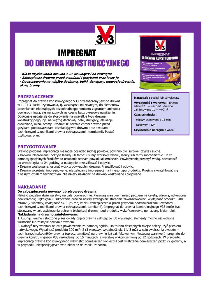 IMPREGNAT DO DREWNA KONSTRUKCYJNEGO - Klasa użytkowania drewna 1-3: wewnątrz i na zewnątrz - Zabezpiecza drewno przed owadami i grzybami oraz leczy je - Do stosowania na więźbę dachową, belki, dźwigary, elewacje drewniane, okna, bramy PRZEZNACZENIE Impregnat do drewna konstrukcyjnego V33 przeznaczony jest do drewna w 1, 2 i 3 klasie użytkowania, tj. wewnątrz i na zewnątrz, do elementów drewnianych nie mających bezpośredniego kontaktu z gruntem ani wodą powierzchniową, ale narażonych na częste bądź okresowe nawilżanie. Doskonale nadaje się do stosowania na wszystkie typy drewna konstrukcyjnego, np. na więźbę dachową, belki, dźwigary, elewacje drewniane, okna, bramy. Produkt skutecznie chroni drewno przed grzybami podstawczakami rozkładającymi drewno oraz owadami – technicznymi szkodnikami drewna (chrząszczami i termitami). Postać użytkowa: płyn. Narzędzia : pędzel lub spryskiwacz Wydajność 1 warstwa : drewno zdrowe 1L = +/- 5m2, drewno zainfekowane 1L = +/-3m2 Czas schnięcia : - między warstwami : 15 min - całkowity : 12h Czyszczenie narzędzi : woda PRZYGOTOWANIE Drewno poddane impregnacji nie może posiadać żadnej powłoki, powinno być surowe, czyste i suche. • Drewno lakierowane, pokryte lazurą lub farbą: usunąć warstwy lakieru, lazury lub farby mechanicznie lub za pomocą specjalnych środków do usuwania starych powłok lakierniczych. Powierzchnię przemyć wodą, pozostawić do wyschnięcia na 24 godziny, a następnie przeszlifować i odpylić. • Drewno woskowane: usunąć wosk z powierzchni drewna. Przeszlifować i odpylić. • Drewno wcześniej impregnowane: nie zalecamy impregnacji na innego typu produkty. Prosimy skontaktować się z naszym działem technicznym. Nie należy nakładać na drewno woskowane i olejowane. NAKŁADANIE Do zabezpieczenia nowego lub zdrowego drewna: Nałożyć pędzlem dwie warstwy na całą powierzchnię. Pierwszą warstwę nanieść pędzlem na czystą, zdrową, odkurzoną powierzchnię. Pęknięcia i uszkodzenia drewna należy szczególnie starannie zakonserwować. Wydajność produktu 200 ml/m2 (2 warstwy, wydajność ok. 1 l/5 m2) w celu zabezpieczenia przed grzybami podstawczakami i owadami – technicznymi szkodnikami drewna (chrząszczami, termitami). Impregnat do drewna konstrukcyjnego V33 może być stosowany w celu zwiększenia ochrony biobójczej drewna, pod produkty wykończeniowe, np. lazurę, lakier, olej. Nakładanie na drewno zainfekowane: 1. Usunąć kruche i stoczone przez owady części drewna szlifując je lub wycinając, elementy mocno uszkodzone wzmocnić lub zastąpić nowym drewnem. 2. Nałożyć trzy warstwy na całą powierzchnię za pomocą pędzla. Do trudno dostępnych miejsc należy użyć pistoletu natryskowego. Wydajność produktu 300 ml/m2 (3 warstwy, wydajność ok. 1 l/ 3 m2) w celu zwalczania owadów – technicznych szkodników drewna (oprócz termitów) na drewnie już zainfekowanym. Następną warstwę Impregnatu do drewna konstrukcyjnego V33 nakładamy po 15 minutach, a warstwę wykończeniową po 12 godzinach. W przypadku impregnacji drewna konstrukcyjnego wewnątrz pomieszczeń konieczne jest wietrzenie pomieszczeń przez 72 godziny, a w przypadku niesprzyjających warunków aż do zaniku zapachu. ŚRODKI OSTROŻNOŚCI Zawiera: Propikonazol (PN)((RS)-1-[2-(2,4-dichlorofenylo)-4-propylo-1,3-dioksolan-2-ylometylo]-1H- -1,2,4-triazol. Może powodować wystąpienie reakcji alergicznej. Środki ostrożności: R50/53 Działa bardzo toksycznie na organizmy wodne; może powodować długo utrzymujące się zmiany w środowisku wodnym. S2 Chronić przed dziećmi. S23 Nie wdychać pary. S24/25 Unikać zanieczyszczenia oczu i skóry. S29 Nie wprowadzać do kanalizacji. S37/39 Nosić odpowiednie rękawice i okulary lub ochronę twarzy. S46 W razie połknięcia niezwłocznie zasięgnąć porady lekarza – pokazać opakowanie lub etykietę. S51 Stosować wyłącznie w dobrze wentylowanych pomieszczeniach. Środki ostrożności dotyczące bezpiecznego postepowania: Unikać zanieczyszczenia oczu. Unikać zanieczyszczenia skóry. Nie wdychać par, gazów, rozpylonej cieczy. Nosić odpowiednie środki ochrony indywidualnej. Postępować zgodnie z zaleceniami podanymi w instrukcji technicznej produktu i w karcie charakterystyki. Nie jeść, nie pic, nie palic tytoniu ani nie przechowywać żywności w pomieszczeniach roboczych. Zanieczyszczoną odzież niezwłocznie zdjąć i uprać przed ponownym użyciem. Warunki bezpiecznego magazynowania: Przechowywać w szczelnie zamkniętym, oryginalnym pojemniku. Nie dopuszczać osób postronnych. Po użyciu szczelnie zamykać pojemnik i ustawiać w pozycji pionowej w celu uniknięcia wycieków produktu. Nie przechowywać z żywnością, napojami i paszą. Postępowanie z odpadami: Nie usuwać do kanalizacji. Opróżnione opakowania przekazać do firmy zajmującej się recyklingiem odpadów. Nieczyszczone opakowania oraz resztki produktu przekazać do firmy zajmującej się utylizacją bądź składowaniem lub spaleniem w odpowiednich instalacjach. UWAGA: Ryzyko samoistnego zapalenia tkanin i narzędzi zabrudzonych produktem. Poddawać likwidacji w hermetycznie zamkniętym opakowaniu. Pierwsza pomoc: W przypadku zatrucia lub podejrzenia o zatrucie zapewnić poszkodowanemu pomoc lekarską. Wdychanie: Osobę poszkodowaną wyprowadzić na świeże powietrze, zapewnić ciepło i spokój. Kontakt ze skórą: Skórę umyć dużą ilością wody z mydłem lub innym łagodnym środkiem myjącym i starannie spłukać. Kontakt z oczami: Usunąć soczewki kontaktowe, jeśli są. Przy podwiniętych powiekach niezwłocznie przemyć oczy duża ilością czystej bieżącej wody. Połkniecie: Przepłukać usta wodą w przypadku połknięcia mniejszej ilości produktu. Nie wywoływać wymiotów bez uprzedniego zalecenia przez lekarza. Osobie nieprzytomnej nie podawać żadnych środków doustnie. Zasięgnąć porady lekarza i przedstawić etykietę prod