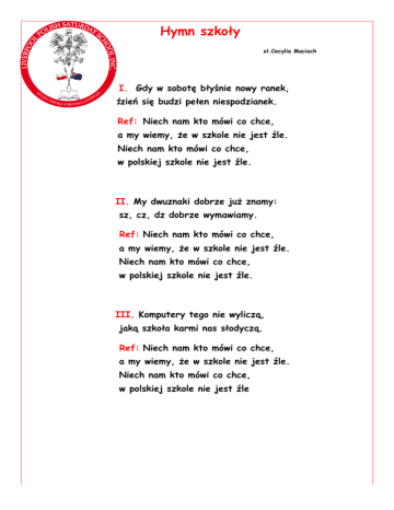 Hymn szkoły sł.Cecylia Macioch I. Gdy w sobotę błyśnie nowy ranek, dzień się budzi pełen niespodzianek. Ref: Niech nam kto mówi co chce, a my wiemy, że w szkole nie jest źle. Niech nam kto mówi co chce, w polskiej szkole nie jest źle. II. My dwuznaki dobrze już znamy: sz, cz, dz dobrze wymawiamy. Ref: Niech nam kto mówi co chce, a my wiemy, że w szkole nie jest źle. Niech nam kto mówi co chce, w polskiej szkole nie jest źle. III. Komputery tego nie wyliczą, jaką szkoła karmi nas słodyczą. Ref: Niech nam kto mówi co chce, a my wiemy, że w szkole nie jest źle. Niech nam kto mówi co chce, w polskiej szkole nie jest źle