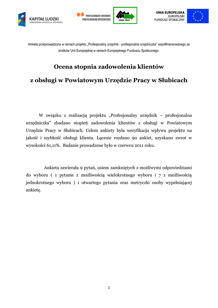 Ankieta przeprowadzona w ramach projektu „Profesjonalny urzędnik - profesjonalna urzędniczka” współfinansowanego ze środków Unii Europejskiej w ramach Europejskiego Funduszu Społecznego. Ocena stopnia zadowolenia klientów z obsługi w Powiatowym Urzędzie Pracy w Słubicach W związku z realizacją projektu „Profesjonalny urzędnik – profesjonalna urzędniczka” zbadano stopień zadowolenia klientów z obsługi w Powiatowym Urzędzie Pracy w Słubicach. Celem ankiety była weryfikacja wpływu projektu na jakość i szybkość obsługi klienta. Łącznie rozdano 90 ankiet, uzyskano zwrot w wysokości 61,11%. Badanie prowadzone było w czerwcu 2011 roku. Ankieta zawierała 9 pytań, osiem zamkniętych z możliwymi odpowiedziami do wyboru ( 1 pytanie z możliwością wielokrotnego wyboru i 7 z możliwością jednokrotnego wyboru ) 1 otwartego pytania oraz metryczki osoby wypełniającej ankietę. 1 Ankieta przeprowadzona w ramach projektu „Profesjonalny urzędnik - profesjonalna urzędniczka” współfinansowanego ze środków Unii Europejskiej w ramach Europejskiego Funduszu Społecznego. Pytanie 1 dotyczyło stopnia zadowolenia z usług urzędu pracy w Słubicach. Ankietowani mieli do wyboru następujące odpowiedzi: wysoko, raczej wysoko, przeciętnie, raczej nisko, nisko. Odpowiedzi kształtują się na następujących poziomach: Jak ocenia Pan/Pani stopień zadowolenia z usług PUP w Słubicach? raczej nisko nisko 0% 0% przeciętnie 14% raczej wysoko 22% wysoko 64% Spośród 55 ankietowanych 64% osób odpowiedziało, że oceniają wysoko stopień zadowolenia z usług Powiatowego Urzędu Pracy, 22% raczej wysoko, 15% przeciętnie, raczej nisko i nisko nie odpowiedział nikt. W ubiegłym roku, gdy przeprowadzono pierwszą ankietę w ramach projektu „Profesjonalny urzędnik – profesjonalna urzędniczka” odpowiedzi kształtowały się na następującym poziomie: - 42% wybrało odpowiedź wysoko - 29% raczej wysoko - 17% przeciętnie 2 Ankieta przeprowadzona w ramach projektu „Profesjonalny urzędnik - profesjonalna urzędniczka” współfinansowanego ze środków Unii Europejskiej w ramach Europejskiego Funduszu Społecznego. - 5% raczej nisko - 7% nisko W porównaniu zatem do zeszłego roku jakość obsługi klienta wzrosła o 22% na poziomie wysokim. W bieżącym roku nikt również nie zaznaczył odpowiedzi „raczej nisko” i „nisko”. Kolejne pytanie dotyczyło oceny pośredników i doradców w Powiatowym Urzędzie Pracy. Ankietowani mogli zaznaczyć takie odpowiedzi jak uprzejmość i życzliwość, sprawna i szybka obsługa, kompetencja i fachowość, wyczerpująca informacja, terminowość załatwienia spraw, przyznając punkty od 1 do 5 (gdzie 5 to ocena najlepsza). Najwięcej punktów przyznano urzędnikom za uprzejmość i życzliwość (266), następnie za udzielanie wyczerpującej informacji (249), potem za kompetencję i fachowość (240), za terminowość załatwiania spraw (234), a za sprawną i szybką obsługę 227 punktów. Maksymalna ilość punktów w każdej kategorii to 275, minimalna liczba to 55. 3 Ankieta przeprowadzona w ramach projektu „Profesjonalny urzędnik - profesjonalna urzędniczka” współfinansowanego ze środków Unii Europejskiej w ramach Europejskiego Funduszu Społecznego. Ocena pośredników i doradców (ilośd przyznanych punktów) Ocena pośredników i doradców (ilośd przyznanych punktów) 234 terminowośd załatwiania spraw 249 wyczerpująca informacja 240 kompetencja i fachowośd 227 sprawna i szybka obsługa 266 uprzejmośd i życzliwośd W pytaniu 3: Co dla Pana/Pani jest najważniejsze podczas załatwiania spraw w urzędzie? ankietowani mogli odpowiedzieć w sposób następujący: uprzejmość i życzliwość, sprawna i szybka obsługa, kompetencja i fachowość, wyczerpująca informacja oraz terminowość załatwienia sprawy. Odpowiedzi przedstawia poniższy wykres: 4 Ankieta przeprowadzona w ramach projektu „Profesjonalny urzędnik - profesjonalna urzędniczka” współfinansowanego ze środków Unii Europejskiej w ramach Europejskiego Funduszu Społecznego. Jak ocenia Pan/Pani pracę urzędników PUP? wyczerpująca infromacja 15% uprzejmośd i życzliwośd 25% kompetencje 20% termin 20% sprawna i szybka obsługa 20% 24% ankietowanych odpowiedziało, że najważniejsze podczas załatwiania spraw w Powiatowym Urzędzie Pracy w Słubicach jest uprzejmość i życzliwość, 20% wybrało termin załatwienia sprawy oraz sprawną, szybką obsługę , również 20% wskazało na kompetencję i fachowość, a 15% wybrało wyczerpującą informację. Następne pytanie dotyczyło usług urzędu pracy i ich polepszeniu lub pogorszeniu w ostatnim czasie. Ponad połowa ankieterów (78%) odpowiedziała, że usługi świadczone przez Urząd Pracy uległy poprawie, nikt nie zaznaczył odpowiedzi, że uległy pogorszeniu, a tylko 22% zaznaczyło, że nie zmieniły się. Pytanie 5 dotyczyło spełniania oczekiwań przez usługę pośrednictwa pracy realizowanej przez Powiatowy Urząd Pracy. Ankietowani mogli wybrać jedną z poniższych odpowiedzi: zdecydowanie tak, raczej tak, raczej nie, zdecydowanie nie, nie korzystałem: 5 Ankieta przeprowadzona w ramach projektu „Profesjonalny urzędnik - profesjonalna urzędniczka” współfinansowanego ze środków Unii Europejskiej w ramach Europejskiego Funduszu Społecznego. Czy usługa pośrednictwa pracy spełniła Pani/Pana oczekiwania?: zdecydowanie nie 0% raczej nie nie korzystałem 4% 4% raczej tak 36% zdecydowanie tak 56% Spośród 55 ankietowanych 55% odpowiedziało, że usługa pośrednictwa pracy zdecydowanie spełnia oczekiwania, 36% odpowiedziało, że raczej tak, 4% raczej nie oraz 4% nie korzystałam. Pytanie 6 miało pokazać czy usługa poradnictwa zawodowego spełnia oczekiwania klientów. Podobnie jak w pytanie 5 ankietowani mieli takie warianty odpowiedzi do wyboru jak: zdecydowanie tak, raczej tak, raczej nie, zdecydowanie nie, nie korzystałem. 6 Ank