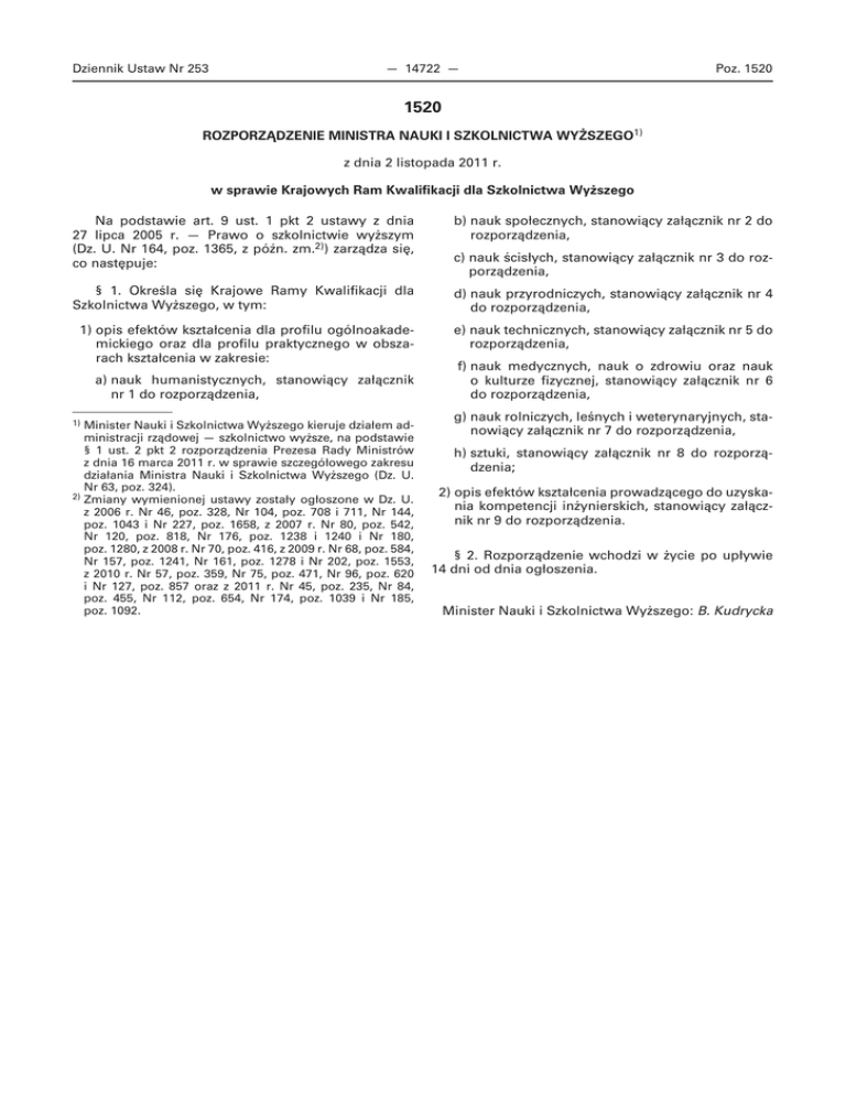 Dziennik Ustaw Nr 253 — 14722 — Poz. 1520 1520 ROZPORZĄDZENIE MINISTRA NAUKI I SZKOLNICTWA WYŻSZEGO1) z dnia 2 listopada 2011 r. w sprawie Krajowych Ram Kwalifikacji dla Szkolnictwa Wyższego Na podstawie art. 9 ust. 1 pkt 2 ustawy z dnia 27 lipca 2005 r. — Prawo o szkolnictwie wyższym (Dz. U. Nr 164, poz. 1365, z późn. zm.2)) zarządza się, co następuje: b) nauk społecznych, stanowiący załącznik nr 2 do rozporządzenia, § 1. Określa się Krajowe Ramy Kwalifikacji dla Szkolnictwa Wyższego, w tym: d) nauk przyrodniczych, stanowiący załącznik nr 4 do rozporządzenia, 1) opis efektów kształcenia dla profilu ogólnoakademickiego oraz dla profilu praktycznego w obszarach kształcenia w zakresie: e) nauk technicznych, stanowiący załącznik nr 5 do rozporządzenia, a) nauk humanistycznych, stanowiący załącznik nr 1 do rozporządzenia, 1) Minister Nauki i Szkolnictwa Wyższego kieruje działem administracji rządowej — szkolnictwo wyższe, na podstawie § 1 ust. 2 pkt 2 rozporządzenia Prezesa Rady Ministrów z dnia 16 marca 2011 r. w sprawie szczegółowego zakresu działania Ministra Nauki i Szkolnictwa Wyższego (Dz. U. Nr 63, poz. 324). 2) Zmiany wymienionej ustawy zostały ogłoszone w Dz. U. z 2006 r. Nr 46, poz. 328, Nr 104, poz. 708 i 711, Nr 144, poz. 1043 i Nr 227, poz. 1658, z 2007 r. Nr 80, poz. 542, Nr 120, poz. 818, Nr 176, poz. 1238 i 1240 i Nr 180, poz. 1280, z 2008 r. Nr 70, poz. 416, z 2009 r. Nr 68, poz. 584, Nr 157, poz. 1241, Nr 161, poz. 1278 i Nr 202, poz. 1553, z 2010 r. Nr 57, poz. 359, Nr 75, poz. 471, Nr 96, poz. 620 i Nr 127, poz. 857 oraz z 2011 r. Nr 45, poz. 235, Nr 84, poz. 455, Nr 112, poz. 654, Nr 174, poz. 1039 i Nr 185, poz. 1092. c) nauk ścisłych, stanowiący załącznik nr 3 do rozporządzenia, f) nauk medycznych, nauk o zdrowiu oraz nauk o kulturze fizycznej, stanowiący załącznik nr 6 do rozporządzenia, g) nauk rolniczych, leśnych i weterynaryjnych, stanowiący załącznik nr 7 do rozporządzenia, h) sztuki, stanowiący załącznik nr 8 do rozporządzenia; 2) opis efektów kształcenia prowadzącego do uzyskania kompetencji inżynierskich, stanowiący załącznik nr 9 do rozporządzenia. § 2. Rozporządzenie wchodzi w życie po upływie 14 dni od dnia ogłoszenia. Minister Nauki i Szkolnictwa Wyższego: B. Kudrycka ma podstawową wiedzę o miejscu i znaczeniu nauk humanistycznych w systemie nauk oraz ich specyfice przedmiotowej i metodologicznej zna podstawową terminologię nauk humanistycznych ma uporządkowaną wiedzę ogólną, obejmującą terminologię, teorie i metodologię z zakresu dziedzin nauki i dyscyplin naukowych, właściwych dla studiowanego kierunku studiów ma uporządkowaną wiedzę szczegółową z zakresu dziedzin nauki i dyscyplin naukowych, właściwych dla studiowanego kierunku studiów ma podstawową wiedzę o powiązaniach dziedzin nauki i dyscyplin naukowych, właściwych dla studiowanego kierunku studiów z innymi dziedzinami nauki i dyscyplinami naukowymi obszaru albo obszarów, z których został wyodrębniony studiowany kierunek studiów H1A_W02 H1A_W03 H1A_W04 H1A_W05 zna terminologię nauk humanistycznych na poziomie rozszerzonym ma uporządkowaną, pogłębioną wiedzę, obejmującą terminologię, teorie i metodologię z zakresu dziedzin nauki i dyscyplin naukowych, właściwych dla studiowanego kierunku studiów ma uporządkowaną, pogłębioną, prowadzącą do specjalizacji, szczegółową wiedzę z zakresu dziedzin nauki i dyscyplin naukowych, właściwych dla studiowanego kierunku studiów ma pogłębioną wiedzę o powiązaniach dziedzin nauki i dyscyplin naukowych, właściwych dla studiowanego kierunku studiów z innymi dziedzinami nauki i dyscyplinami naukowymi obszaru albo obszarów, z których został wyodrębniony studiowany kierunek studiów, pozwalającą na integrowanie perspektyw właściwych dla kilku dyscyplin naukowych H2A_W03 H2A_W04 H2A_W05 ma pogłębioną wiedzę o specyfice przedmiotowej i metodologicznej nauk humanistycznych, którą jest w stanie rozwijać i twórczo stosować w działalności profesjonalnej Osoba posiadająca kwalifikacje drugiego stopnia: H2A_W02 H2A_W01 Wiedza Profil ogólnoakademicki H1A_W01 Osoba posiadająca kwalifikacje pierwszego stopnia: W — kategoria wiedzy U — kategoria umiejętności K — kategoria kompetencji społecznych 01, 02, 03 i kolejne — numer efektu kształcenia Objaśnienie oznaczeń: H — obszar kształcenia w zakresie nauk humanistycznych 1 — studia pierwszego stopnia 2 — studia drugiego stopnia A — profil ogólnoakademicki P — profil praktyczny OPIS EFEKTÓW KSZTAŁCENIA W OBSZARZE KSZTAŁCENIA W ZAKRESIE NAUK HUMANISTYCZNYCH Załącznik nr 1 Załączniki do rozporządzenia Ministra Nauki i Szkolnictwa Wyższego z dnia 2 listopada 2011 r. (poz. 1520) Dziennik Ustaw Nr 253 — 14723 — Poz. 1520 zna i rozumie podstawowe metody analizy i interpretacji różnych wytworów kultury właściwe dla wybranych tradycji, teorii lub szkół badawczych w zakresie dziedzin nauki i dyscyplin naukowych, właściwych dla studiowanego kierunku studiów zna i rozumie podstawowe pojęcia i zasady z zakresu ochrony własności przemysłowej i prawa autorskiego ma świadomość kompleksowej natury języka oraz jego złożoności i historycznej zmienności jego znaczeń ma podstawową wiedzę o instytucjach kultury i orientację we współczesnym życiu kulturalnym H1A_W07 H1A_W08 H1A_W09 H1A_W10 H2A_W10 H2A_W09 potrafi wyszukiwać, analizować, oceniać, selekcjonować i użytkować informację z wykorzystaniem różnych źródeł i sposobów posiada podstawowe umiejętności badawcze, obejmujące formułowanie i analizę problemów badawczych, dobór metod i narzędzi badawczych, opracowanie i prezentację wyników, pozwalające na rozwiązywanie problemów w zakresie dziedzin nauki i dyscyplin naukowych, właściwych dla studiowanego kierunku studiów umie samodzielnie zdobywać wiedzę i rozwijać umiejętności badaw