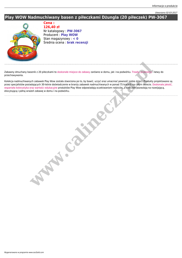 Informacje o produkcie Utworzono 02-03-2017 Play WOW Nadmuchiwany basen z piłeczkami Dżungla (20 piłeczek) PW-3067 Cena : 126,40 zł pl Nr katalogowy : PW-3067 Producent : Play WOW Stan magazynowy : < 0 Średnia ocena : brak recenzji Zabawny dmuchany basenik z 20 piłeczkami to doskonałe miejsce do zabawy zarówno w domu, jak i na podwórku. Trwały, przenośny i łatwy do przechowywania. w w w .c al in ec zk a. Kolekcja nadmuchiwanych zabawek Play Wow została stworzona po to, by bawić, uczyć oraz umacniać pewność siebie dzieci. Produkty projektowane są przez specjalistów posiadających 30-letnie doświadczenie w branży zabawek nadmuchiwanych w ponad 75 krajach na całym świecie. Doskonała jakość, wspaniała kolorystyka oraz wartości edukacyjne produktów Play Wow odpowiadają oczekiwaniom rodziców, a dzieciom pozwalają na rozwijającą, ekscytującą i pełną wrażeń zabawę w domu i na podwórku. Wygenerowano w programie www.oscGold.com