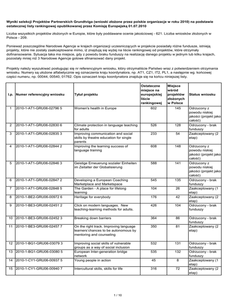 Wyniki selekcji Projektów Partnerskich Grundtviga (wnioski złoŜone przez polskie organizacje w roku 2010) na podstawie ostatecznej listy rankingowej opublikowanej przez Komisję Europejską 01.07.2010 Liczba wszystkich projektów złoŜonych w Europie, które były poddawane ocenie jakościowej - 621. Liczba wniosków złoŜonych w Polsce - 209. PoniewaŜ poszczególne Narodowe Agencje w krajach organizacji uczesniczących w projekcie posiadały róŜne fundusze, istnieją projekty, które nie zostały zaakceptowane mimo, iŜ znajdują się wyŜej na liście rankingowej od projektów, które otrzymały dofinansowanie. Sytuacja taka ma miejsce, gdy z powodu braku funduszy na realizację danego projektu w jednym lub kilku krajach, pozostały mniej niŜ 3 Narodowe Agencje gotowe sfinansować dany projekt. Projekty naleŜy wyszukiwać posługując się nr referencyjnym wniosku, który otrzymaliście Państwo wraz z potwierdzeniem otrzymania wniosku. Numery są ułoŜone alfabetycznie wg oznaczenia kraju koordynatora, np. AT1, CZ1, IT2, PL1, a następnie wg. końcowej części numeru, np. 00044, 00540, 01762. Opis oznaczeń kraju koordynatora znajduje się na końcu niniejszej listy. l.p. Numer referencyjny wniosku Ostateczne miejsce na europejskiej liście rankingowej Tytuł projektu Miejsce wśród projektów złoŜonych w Polsce 1 2010-1-AT1-GRU06-02796 5 Women's health in Europe 602 145 2 2010-1-AT1-GRU06-02830 6 526 128 3 2010-1-AT1-GRU06-02835 3 233 54 4 2010-1-AT1-GRU06-02844 2 Climate protection in language teaching for adults Improving communication and social skills by theatre education for single parents Improving the learning success of language training 608 148 5 2010-1-AT1-GRU06-02846 3 Geistige Erneuerung sozialer Einheiten im Zeitalter der Globalisierung 588 141 6 2010-1-AT1-GRU06-02847 2 545 135 7 2010-1-AT1-GRU06-02848 5 104 26 8 2010-1-BE2-GRU06-00972 6 Developing a European Coaching Marketplace and Marketspace The Garden - A place for lifelong learning Heritage for everybody 176 42 9 2010-1-BE3-GRU06-02451 2 Click on modern languages. New teaching-learning methods for adults. 426 104 10 2010-1-BE3-GRU06-02452 3 Breaking down barriers 364 86 11 2010-1-BE3-GRU06-02457 7 On the right track. Improving language learners’chances to be autonomous by mentoring and counseling 350 81 12 2010-1-BG1-GRU06-03079 3 532 131 535 132 14 2010-1-CY1-GRU06-00937 5 Improving social skills of vulnerable groups as a way of social inclusion European Inter-generation bridge network Young people in action 45 8 15 2010-1-CY1-GRU06-00940 7 Intercultural skills, skills for life 316 72 13 2010-1-BG1-GRU06-03080 5 1 / 10 Status wniosku Odrzucony z powodu niskiej jakości (projekt jako całość) Odrzucony - brak funduszy Zaakceptowany (2 etap) Odrzucony z powodu niskiej jakości (projekt jako całość) Odrzucony z powodu niskiej jakości (projekt jako całość) Odrzucony - brak funduszy Zaakceptowany (1 etap) Zaakceptowany (2 etap) Odrzucony - brak funduszy Odrzucony - brak funduszy Zaakceptowany (2 etap) Odrzucony - brak funduszy Odrzucony - brak funduszy Zaakceptowany (1 etap) Zaakceptowany (2 etap) 16 2010-1-CZ1-GRU06-03944 4 Adult education assessment toolkit nie dotyczy 17 2010-1-CZ1-GRU06-03944 6 Adult education assessment toolkit nie dotyczy 18 2010-1-CZ1-GRU06-03946 6 From school to professional and social life in an open european space nie dotyczy 19 2010-1-CZ1-GRU06-03947 2 ME(U)MORIES 20 2010-1-CZ1-GRU06-03948 3 Project management for SMEs/NGOs exchange of experience for trainers 21 2010-1-CZ1-GRU06-03949 4 How do you do? 581 22 2010-1-DE2-GRU06-04662 2 23 2010-1-DE2-GRU06-04663 3 SIE Seniors in Europe Trans-Acting 394 50 24 2010-1-DE2-GRU06-04665 3 MA-MA Project: Motivated by art - Art of motivation Helpful small communities: Integrate disadvantaged women by applicable adult education Building up an european network for professional exchange and training to support people involved in autism spectrum disorder. Regional strategies to end homelessness in Europe Innovative learning ways - Innovative Lernwege - Flüsse verbinden europäische Regionen SALIX - Willow art / Learning and sharing arts and craft of weaving and construction as common european knowledge Environmental education network 85 25 2010-1-DE2-GRU06-04670 3 26 2010-1-DE2-GRU06-04671 3 27 2010-1-DE2-GRU06-04675 5 28 2010-1-DE2-GRU06-04680 4 29 2010-1-DE2-GRU06-04683 2 30 2010-1-DE2-GRU06-04686 2 31 2010-1-DE2-GRU06-04687 2 32 2010-1-DE2-GRU06-04691 2 33 2010-1-DE2-GRU06-04692 3 34 2010-1-DE2-GRU06-04693 3 35 2010-1-DE2-GRU06-04695 4 36 2010-1-DE2-GRU06-04700 3 37 2010-1-DE2-GRU06-04706 3 38 2010-1-DE2-GRU06-04714 9 38 Landwirtschaft der Zukunft mit Mischkulturen auf der Grundlage eines natürlichen Humusaufbaus Europe in the younger european literature Europe faces domestic violenceExchange and transfer of local competencies Improving the environmental communication and awareness of migrants and social disadvantaged citizens Professional usage of media in educational context (Adult Education) Balance zwischen Tradition und neuen Wegen Interkulturelles Lernen und Ehrenamt in Europa Otto Bartning in Europa nie dotyczy 136 390 91 505 126 nie dotyczy 254 336 nie dotyczy 434 55 80 Zaakceptowany (2 etap) nie dotyczy Odrzucony formalnie (polski wniosek) 108 Odrzucony - brak funduszy 12 Zaakceptowany (1 etap) 19 59 14 544 nie dotyczy Odrzucony - brak funduszy Odrzucony - brak funduszy nie dotyczy Odrzucony formalnie (polski wniosek) 57 Zaakceptowany (2 etap) 78 nie dotyczy 2 / 10 nie dotyczy Odrzucony formalnie (polski wniosek) nie dotyczy Odrzucony formalnie (polski wniosek) nie dotyczy Odrzucony formalnie (polski wniosek) 6 Zaakceptowany (1 etap) nie dotyczy Odrzucony formalnie (polski wniosek) 140 Odrzucony z powodu niskiej jakości (projekt jako całość) 93 Rezerwa 11 Zaakceptowany (1 etap) 21 Zaakceptowany (1 etap) 34 Zaakceptowany (2 etap) Zaakceptowany (1 etap) Zaakceptowany (1 etap) 134 Odrzucony - brak funduszy nie dotyc