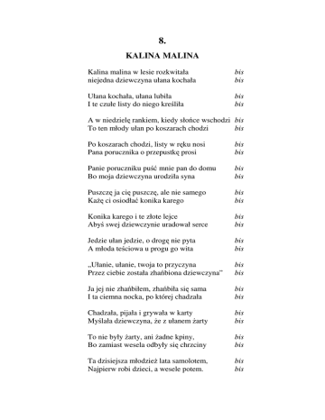 8. KALINA MALINA Kalina malina w lesie rozkwitała niejedna dziewczyna ułana kochała bis bis Ułana kochała, ułana lubiła I te czułe listy do niego kreśliła bis bis A w niedzielę rankiem, kiedy słońce wschodzi bis To ten młody ułan po koszarach chodzi bis Po koszarach chodzi, listy w ręku nosi Pana porucznika o przepustkę prosi bis bis Panie poruczniku puść mnie pan do domu Bo moja dziewczyna urodziła syna bis bis Puszczę ja cię puszczę, ale nie samego Każę ci osiodłać konika karego bis bis Konika karego i te złote lejce Abyś swej dziewczynie uradował serce bis bis Jedzie ułan jedzie, o drogę nie pyta A młoda teściowa u progu go wita bis bis „Ułanie, ułanie, twoja to przyczyna Przez ciebie została zhańbiona dziewczyna” bis bis Ja jej nie zhańbiłem, zhańbiła się sama I ta ciemna nocka, po której chadzała bis bis Chadzała, pijała i grywała w karty Myślała dziewczyna, że z ułanem żarty bis bis To nie były żarty, ani żadne kpiny, Bo zamiast wesela odbyły się chrzciny bis bis Ta dzisiejsza młodzież lata samolotem, Najpierw robi dzieci, a wesele potem. bis bis