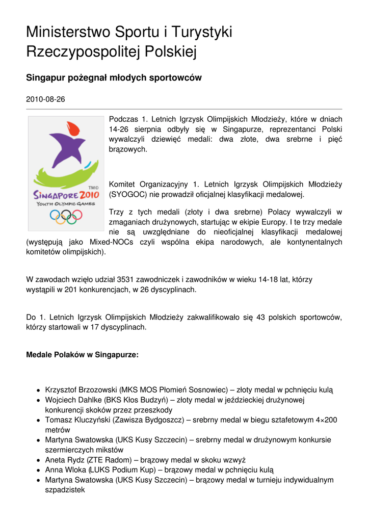 Ministerstwo Sportu i Turystyki Rzeczypospolitej Polskiej Singapur pożegnał młodych sportowców 2010-08-26 Podczas 1. Letnich Igrzysk Olimpijskich Młodzieży, które w dniach 14-26 sierpnia odbyły się w Singapurze, reprezentanci Polski wywalczyli dziewięć medali: dwa złote, dwa srebrne i pięć brązowych. Komitet Organizacyjny 1. Letnich Igrzysk Olimpijskich Młodzieży (SYOGOC) nie prowadził oficjalnej klasyfikacji medalowej. Trzy z tych medali (złoty i dwa srebrne) Polacy wywalczyli w zmaganiach drużynowych, startując w ekipie Europy. I te trzy medale nie są uwzględniane do nieoficjalnej klasyfikacji medalowej (występują jako Mixed-NOCs czyli wspólna ekipa narodowych, ale kontynentalnych komitetów olimpijskich). W zawodach wzięło udział 3531 zawodniczek i zawodników w wieku 14-18 lat, którzy wystąpili w 201 konkurencjach, w 26 dyscyplinach. Do 1. Letnich Igrzysk Olimpijskich Młodzieży zakwalifikowało się 43 polskich sportowców, którzy startowali w 17 dyscyplinach. Medale Polaków w Singapurze: Krzysztof Brzozowski (MKS MOS Płomień Sosnowiec) – złoty medal w pchnięciu kulą Wojciech Dahlke (BKS Kłos Budzyń) – złoty medal w jeździeckiej drużynowej konkurencji skoków przez przeszkody Tomasz Kluczyński (Zawisza Bydgoszcz) – srebrny medal w biegu sztafetowym 4×200 metrów Martyna Swatowska (UKS Kusy Szczecin) – srebrny medal w drużynowym konkursie szermierczych mikstów Aneta Rydz (ZTE Radom) – brązowy medal w skoku wzwyż Anna Wloka (LUKS Podium Kup) – brązowy medal w pchnięciu kulą Martyna Swatowska (UKS Kusy Szczecin) – brązowy medal w turnieju indywidualnym szpadzistek Marcin Cieślak (Warszawianka) – brązowy medal w pływackim wyścigu na 200 metrów stylem motylkowym Dawid Michelus (Sokół Piła) – brązowy medal w boksie w kategorii 54 kg Nieoficjalna klasyfikacja medalowa 1. Letnich Igrzysk Olimpijskich Młodzieży: 1. Chiny 30 złotych – 16 srebrnych – 5 brązowych; RAZEM: 51 2. Rosja 18 złotych – 14 srebrnych – 11 brązowych; RAZEM: 43 3. Korea Płd. 11 złotych – 4 srebrne – 4 brązowe; RAZEM: 19 4. Ukraina 9 złotych – 9 srebrnych – 15 brązowych; RAZEM: 33 Mixed-NOCs 9 złotych – 8 srebrnych – 11 brązowych; RAZEM: 28 5. Kuba 9 złotych – 3 srebrne – 2 brązowe;RAZEM: 14 6. Australia 8 złotych – 13 srebrnych – 8 brązowych;RAZEM: 29 7. Japonia 8 złotych – 5 srebrnych – 3 brązowe; RAZEM: 16 8. Węgry 6 złotych – 4 srebrne – 5 brązowe;RAZEM: 15 9. Francja 6 złotych – 2 srebrne – 7 brązowych;RAZEM: 15 10. Włochy 5 złotych – 9 srebrnych – 5 brązowych;RAZEM: 19 11. Azerbejdżan 5 złotych – 3 srebrny – 0 brązowych; RAZEM: 8 12. Niemcy 4 złote – 9 srebrnych – 9 brązowych;RAZEM: 22 13. USA 4 złote – 9 srebrnych – 8 brązowych; RAZEM: 21 14. Tajlandia 4 złote – 3 srebrne – 0 brązowych; RAZEM: 7 15. Izrael 3 złote – 2 srebrne – 0 brązowych; RAZEM: 5 16. Kanada 3 złote – 1 srebrny – 8 brązowych;RAZEM: 12 17. W. Brytania 3 złote – 1 srebrny – 5 brązowe; RAZEM: 9 18. Kenia 3 złote – 0 srebrnych – 3 brązowe; RAZEM: 6 19. Litwa 3 złote – 0 srebrnych – 1 brązowy;RAZEM: 4 20. RPA 2 złote – 4 srebrne – 3 brązowe; RAZEM: 9 45. POLSKA 1 złoty – 0 srebrnych – 5 brązowe;RAZEM: 6 Medale wywalczyli zawodnicy z 98 krajów. W zawodach uczestniczyli przedstawiciele 204 narodowych komitetów olimpijskich (z 205 zrzeszonych w MKOl – Komitet Olimpijski Kuwejtu jest zawieszony od stycznia 2010 roku). Sportowcy z Kuwejtu startowali jednak w Singapurze, ale pod flagą olimpijską, zdobywając jeden medal – brązowy w pływaniu. Pierwszy medal 1. Letnich Igrzysk Olimpijskich Młodzieży wywalczyła Japonka Yuka Sato (triathlon), a dla mixed-NOCs ekipa Europy (Rosjanka Jana Egorjan oraz Włosi – Marco Fichera, Camilla Mancini, Leonardo Affede, Alberta Santuccio i Eduardo Luperi) w szermierce). Przedstawiciele dziewięciu państw – Boliwii, Bośni i Hercegowiny, Cypru, Gwatemali, Gwinei Równikowej, Jordanii, Kambodży, Nauru i Turkmenistanu – po raz pierwszy w historii wywalczyli medal olimpijski. Największą gwiazdą imprezy była Chinka Tang Yi, która zdobyła aż sześć złotych medali w pływaniu (w tym trzy w rywalizacji indywidualnej).