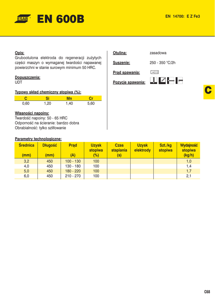 EN 14700: E Z Fe3 EN 600B Opis: Grubootulona elektroda do regeneracji zużytych części maszyn o wymaganej twardości napawanej powierzchni w stanie surowym minimum 50 HRC. Otulina: zasadowa Suszenie: 250 - 350 °C/2h Prąd spawania: Dopuszczenia: UDT Pozycje spawania: C Typowy skład chemiczny stopiwa (%): C 0,60 Si 1,20 Mn 1,40 Cr 5,60 Własności napoiny: Twardość napoiny: 50 - 65 HRC Odporność na ścieranie: bardzo dobra Obrabialność: tylko szlifowanie Parametry technologiczne: Średnica Długość Prąd (mm) (mm) (A) Uzysk stopiwa (%) 3,2 4,0 5,0 6,0 450 450 450 450 100 - 130 130 - 180 180 - 220 210 - 270 100 100 100 100 Czas stapiania (s) Uzysk elektrody Szt./kg stopiwa Wydajność stopiwa (kg/h) 1,0 1,4 1,7 2,1 C68