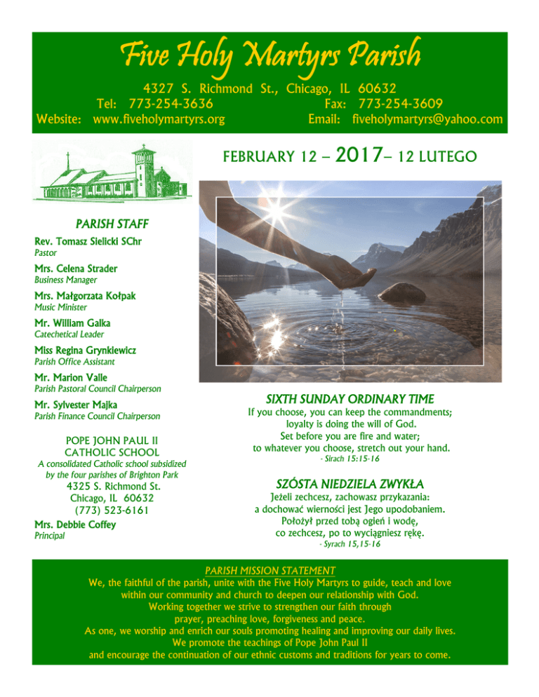 Five Holy Martyrs Parish 4327 S. Richmond St., Chicago, IL 60632 Tel: 773-254-3636 Fax: 773-254-3609 Website: www.fiveholymartyrs.org Email: [email protected] FEBRUARY 12 – 2017– 12 LUTEGO PARISH STAFF Rev. Tomasz Sielicki SChr Pastor Mrs. Celena Strader Business Manager Mrs. Małgorzata Kołpak Music Minister Mr. William Galka Catechetical Leader Miss Regina Grynkiewicz Parish Office Assistant Mr. Marion Valle Parish Pastoral Council Chairperson Mr. Sylvester Majka Parish Finance Council Chairperson POPE JOHN PAUL II CATHOLIC SCHOOL A consolidated Catholic school subsidized by the four parishes of Brighton Park 4325 S. Richmond St. Chicago, IL 60632 (773) 523-6161 Mrs. Debbie Coffey Principal SIXTH SUNDAY ORDINARY TIME If you choose, you can keep the commandments; loyalty is doing the will of God. Set before you are fire and water; to whatever you choose, stretch out your hand. - Sirach 15:15-16 SZÓSTA NIEDZIELA ZWYKŁA Jeżeli zechcesz, zachowasz przykazania: a dochować wierności jest Jego upodobaniem. Położył przed tobą ogień i wodę, co zechcesz, po to wyciągniesz rękę. - Syrach 15,15-16 PARISH MISSION STATEMENT We, the faithful of the parish, unite with the Five Holy Martyrs to guide, teach and love within our community and church to deepen our relationship with God. Working together we strive to strengthen our faith through prayer, preaching love, forgiveness and peace. As one, we worship and enrich our souls promoting healing and improving our daily lives. We promote the teachings of Pope John Paul II and encourage the continuation of our ethnic customs and traditions for years to come. Five Holy Martyrs Parish Page 2 February 12, 2017 Mass Intention and Devotion Schedule 6TH SUNDAY ORDINARY TIME 6. NIEDZIELA ZWYKŁA Vigil - Saturday - February 11, 2017 4:00 pm-EN †† Deceased members of the Fudalej family Sunday - February 12, 2017 7:30 am-PL †† Za zmarłych z rodziny Konsur 9:00 am-EN - For the living & deceased members of the F.H.M. Holy Name of Jesus Society - In thanksgiving for graces received & asking for continued health & blessings upon Larry & Claudette Kulik on the occasion of their 45th wedding anniversary - Health & blessings for Mary Ann Sikorski - Health & blessings for Ron & Mary Ann Dandurski (req. by C. & A. Niedos) † Andy Bizub (req. by A. Miller) † Irene Rybak (req. by husband) † Stephen Marszalek † Harry Gronek † Michael Crouchelli (32nd anniv.) † Henry Jevorutsky †† Nick & Helen Delzotti 11:00 am-PL - O zdrowie i błogosławieństwo Boże dla Marii Pacury z dziećmi - O zdrowie i błogosławieństwo Boże dla Mariana Kurzyńskiego - O zdrowie i błogosławieństwo Boże dla Danuty i Władysława Bajków i całej rodziny † Albin Winkler † Franciszek Kopeć (prosi Koło #27 Witów przy Związku Podhalan) † Norman Olson †† Katarzyna i Franciszek Lubińscy †† Paweł i Andrzej Zwijacz †† Jan i Janina Skotniccy †† Josephine i Antoni Dudek †† Aniela i Jan Grajda Monday - February 13 - poniedziałek 6:30 pm-PL † Weronika Dorna Tuesday - February 14 - wtorek Sts. Cyril & Methodius - śś. Cyryla i Metodego 8:00 am-EN †† Walenty & Anna Ludwikowski and †† Józef & Zofia Skiba 8:30 am - Adoration of the Blessed Sacrament Adoracja Najświętszego Sakramentu 5:00 - 5:45 pm - Confessions / Spowiedź św. 6:00 pm - Nabożeństwo - Błog. Najśw. Sakramentem Wednesday - February 15 - środa 6:30 pm-PL † Bruno Niemiec (7. roczn. śm.) Thursday - February 16 - czwartek 8:00 am-EN - For parishioners & benefactors Friday - February 17 - piątek 6:30 pm-PL † Józef Dorna (22. roczn. śm.) Saturday - February 18 - sobota 8:00 am-EN † Rev. Joseph Novotny 3:00 - 3:45 pm - Confessions / Spowiedź św. 7TH SUNDAY ORDINARY TIME 7. NIEDZIELA ZWYKŁA Vigil - Saturday - February 18, 2017 4:00 pm-EN † Henry Kaczmarczyk (req. by wife) Sunday - February 19, 2017 7:30 am-PL † Edward Zych 9:00 am-EN - Health & blessings upon Casey & Ann Marie Niedos (weddding anniv.) - Health & God’s blessing upon George Kwak on the occasion of his 95th birthday † Lois Kwak (3rd anniv.) †† Józef & Ludwika Fukś †† Louis & Clara Fox †† Andrzej & Maria Remiasz 11:00 am-PL - O zdrowie i błogosławieństwo Boże dla Anny Pacury z okazji urodzin - Za członków z Towarzystwa Obywateli Starszych im. Ojca Świętego Jana Pawła II, którzy zmarli w lutym † Zbigniew Kołpak (zam. E. Chrzanowska) † Franciszek Kopeć (prosi rodzina) † Witold Babul † Józef Zaliński (17. roczn. śm.) †† Józef i Antonina Para †† Ludwika i Józef Fukś †† Stanley i Stephanie Chwierut †† Stanisław Skorusa i wszyscy zmarli z rodziny Liturgical Ministry Saturday, February 18, 2017 4:00 pm L&C: M. Carroll & T. Gronek Sunday, February 19, 2017 9:00 am L&C: J. Kwak & T. Majka L&C stands for Lector & Commentator EMHE stands for Extraordinary Minister of the Holy Eucharist; scheduling of EMHE’s will resume on Easter Sunday. February 12, 2017 Parafia Pięciu Braci Męczenników Page 3 PIERWSZE CZYTANIE (Syr 15,15-20) Wymagająca wolność człowieka EWANGELIA Czytanie z Księgi Syracydesa. Słowa Ewangelii według świętego Mateusza. Jeżeli zechcesz, zachowasz przykazania, a dochować wierności jest Jego upodobaniem. Położył przed tobą ogień i wodę, co zechcesz, po to wyciągniesz rękę. Przed ludźmi życie i śmierć, co ci się podoba, Ponieważ wielka jest mądrość Pana, potężny jest władzą i widzi wszystko. Oczy Jego patrzą na bojących się Go, On sam poznaje każdy czyn człowieka. Nikomu nie przykazał być bezbożnym i nikomu nie zezwolił grzeszyć. Jezus powiedział do swoich uczniów: „Nie sądźcie, że przyszedłem znieść Prawo albo Proroków. Nie przyszedłem znieść, ale wypełnić. Zaprawdę bowiem powiadam wam: Dopóki niebo i ziemia nie przeminą, ani jedna jota, ani jedna kreska nie zmieni się w Prawie, aż się wszystko spełni. Ktokolwiek więc zniósłby jedno z tych przykaza