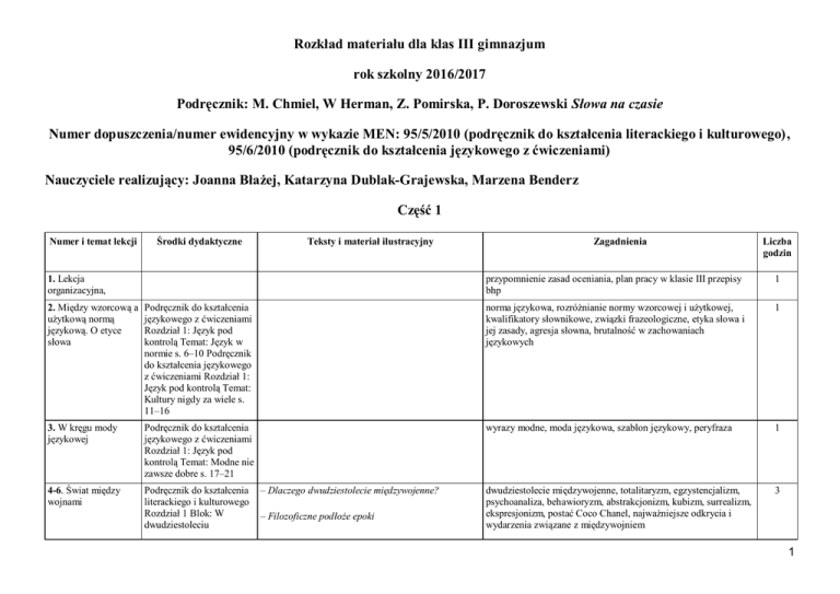 Rozkład materiału dla klas III gimnazjum rok szkolny 2016/2017 Podręcznik: M. Chmiel, W Herman, Z. Pomirska, P. Doroszewski Słowa na czasie Numer dopuszczenia/numer ewidencyjny w wykazie MEN: 95/5/2010 (podręcznik do kształcenia literackiego i kulturowego), 95/6/2010 (podręcznik do kształcenia językowego z ćwiczeniami) Nauczyciele realizujący: Joanna Błażej, Katarzyna Dublak-Grajewska, Marzena Benderz Część 1 Numer i temat lekcji Środki dydaktyczne Teksty i materiał ilustracyjny 1. Lekcja organizacyjna, Zagadnienia Liczba godzin przypomnienie zasad oceniania, plan pracy w klasie III przepisy bhp 1 2. Między wzorcową a użytkową normą językową. O etyce słowa Podręcznik do kształcenia językowego z ćwiczeniami Rozdział 1: Język pod kontrolą Temat: Język w normie s. 6–10 Podręcznik do kształcenia językowego z ćwiczeniami Rozdział 1: Język pod kontrolą Temat: Kultury nigdy za wiele s. 11–16 norma językowa, rozróżnianie normy wzorcowej i użytkowej, kwalifikatory słownikowe, związki frazeologiczne, etyka słowa i jej zasady, agresja słowna, brutalność w zachowaniach językowych 1 3. W kręgu mody językowej Podręcznik do kształcenia językowego z ćwiczeniami Rozdział 1: Język pod kontrolą Temat: Modne nie zawsze dobre s. 17–21 wyrazy modne, moda językowa, szablon językowy, peryfraza 1 4-6. Świat między wojnami Podręcznik do kształcenia literackiego i kulturowego Rozdział 1 Blok: W dwudziestoleciu dwudziestolecie międzywojenne, totalitaryzm, egzystencjalizm, psychoanaliza, behawioryzm, abstrakcjonizm, kubizm, surrealizm, ekspresjonizm, postać Coco Chanel, najważniejsze odkrycia i wydarzenia związane z międzywojniem 3 – Dlaczego dwudziestolecie międzywojenne? – Filozoficzne podłoże epoki 1 międzywojennym s. 10–13, – Od kiedy do kiedy? 66-67 – Świat kawiarni – Psychologia w literaturze – Jak ukazać piękno? – Józef Rapacki, W Ziemiańskiej – Salvador Dalí, Trwałość pamięci – Wassily Kandinsky, Przekątna – Pablo Picasso, Trzej muzykanci – Ernest Ludwig Kirchner, Pięć kobiet na ulicy -Śladami epoki 7. Patriotyczny obowiązek dawniej i dziś Podręcznik do kształcenia – Witold Barbacki, Mój najświętszy obowiązek literackiego i kulturowego Rozdział 1 Blok: W – Christopher Richard Wynne Nevinson, Ścieżki dwudziestoleciu chwały międzywojennym s. 14–16 Legiony Polskie, dziennik 1 8. Miejsce, gdzie powstają wiersze Podręcznik do kształcenia literackiego i kulturowego Rozdział 1 Blok: Co zostało z tamtych lat... s. 32–33 – Andrzej Zawada, Atmosfera artystyczna Skamander, kawiarnia artystyczna, snobizm 1 9. Poezja skamandrytów Podręcznik dokształcenia literackiego i kulturowego Rozdział 1 Blok: W dwudziestoleciu międzywojennym s. 17 – Kazimierz Wierzyński, Zielono mam w głowie postać Kazimierza Wierzyńskiego, Skamander, przerzutnia poetycka, liryka bezpośrednia 1 10. i 12. Krytyczny Podręcznik dokształcenia – Julian Tuwim, Mieszkańcy oraz inne wybrane postać Juliana Tuwima, prozaizm, wiersz sylabiczny, średniówka, 3 2 obraz mieszczaństwa literackiego i kulturowego wiersze Rozdział 1 Blok: W dwudziestoleciu międzywojennym s. 18–19 13. O poezji kobiecej Podręcznik do kształcenia – Maria Pawlikowska-Jasnorzewska, Miłość oraz inne postać Marii Pawlikowskiej-Jasnorzewskiej, miniatura poetycka, literackiego i kulturowego wybrane wiersze poezja miłosna, epigramat Rozdział 1 Blok: W dwudziestoleciu międzywojennym s. 21 Szkolny słownik terminów literackich 14 - 15. Spotkanie z Awangardą Krakowską i futuryzmem Podręcznik do kształcenia literackiego i kulturowego Rozdział 1 Blok: W dwudziestoleciu międzywojennym s. 22 Słownik języka polskiego – Julian Przyboś, Gmachy, poezja futurystów postać Juliana Przybosia, awangarda, Awangarda Krakowska, wiersz wolny 2 16-17. Zjesieniałe zmrocze, czyli o neologizmach poetyckich Podręcznik do kształcenia literackiego i kulturowego Rozdział 1 Blok: W dwudziestoleciu międzywojennym s. 23 – Bolesław Leśmian, *** [Wyszło z boru ślepawe, zjesieniałe zmrocze] oraz inne wybrane wiersze postać Bolesława Leśmiana, neologizmy poetyckie 2 18. Przyjaźń – Podręcznik dokształcenia – Maria Dąbrowska, Prawdziwy przyjaciel uczucie, o które warto literackiego i kulturowego zabiegać Rozdział 1 Blok: W dwudziestoleciu międzywojennym s. 24–26 postać Marii Dąbrowskiej, powieść psychologiczna, opowiadanie psychologiczne, analiza psychologiczna 1 19. Wariacje na temat Podręcznik do kształcenia jazzu literackiego i kulturowego Rozdział 1 Blok: Co zostało z tamtych lat... s. 30–31 – Debra Hurd, Dziki jazz jazz, gama barwna 1 20. Mały, szary człowiek – Andrzej Bursa, Uwaga dramat sytuacja liryczna, bohater liryczny, środki stylistyczne 1 Podręcznik do kształcenia literackiego i kulturowego Rozdział 1 Blok: Co zostało z tamtych lat... s. 34 konsumpcjonizm 1(2) – Tadeusz Makowski, Jazz – Alfons Karpiński, Ulica paryska 3 21. Miłość i śmierć – siostry dwie Podręcznik do kształcenia literackiego i kulturowego Rozdział 1 Blok: Co zostało z tamtych lat... s. 35 Słownik symboli – Mirosław Kuźniak, Lechoń 22-23. Zrozumieć surrealizm... Podręcznik do kształcenia literackiego i kulturowego Rozdział 1 Blok: Co zostało z tamtych lat... s. 37–39 – Boris Vian, Niezwykła podróż, własne pomysły surrealistyczne uczniów – wypracowanie „Surrealistyczny sen” 24. Tworzenie wyrazów obraz poetycki, zasada kontrastu 1 postać Borisa Viana, surrealizm, elementy świata przedstawionego, absurd, komizm 2 Podręcznik dokształcenia językowego z ćwiczeniami Rozdział 2: W fabryce słów Temat: Wyraz od podstaw s. 26–31 podstawa słowotwórcza, wyraz pochodny, wyrazy niepodzielne słowotwórczo, rodzina wyrazów, rdzeń, wyrazy pokrewne, zasady pisowni wyrazów zakończonych na -aż i -arz 1 25. Jakie tajemnice skrywa rodzinny dom? Podręcznik do kształ