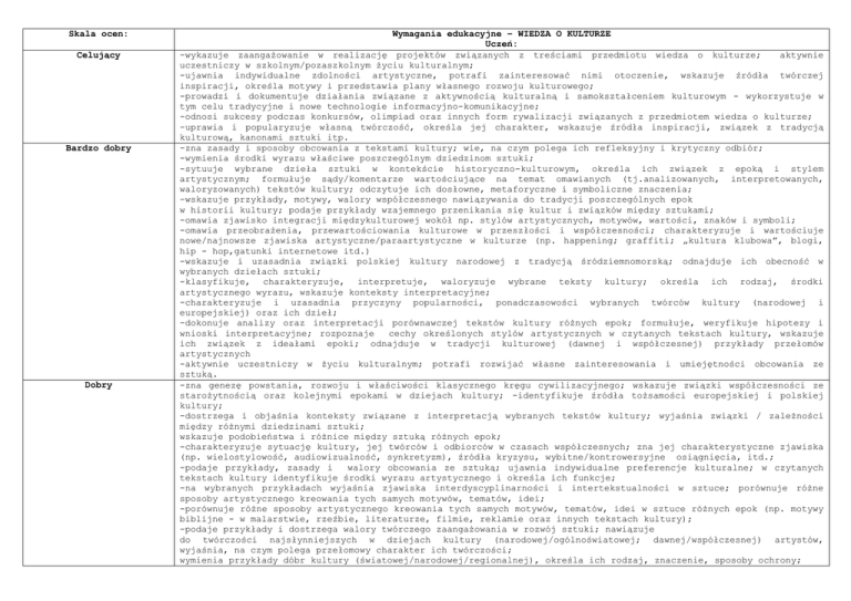 Skala ocen: Celujący Bardzo dobry Dobry Wymagania edukacyjne – WIEDZA O KULTURZE Uczeń: -wykazuje zaangażowanie w realizację projektów związanych z treściami przedmiotu wiedza o kulturze; aktywnie uczestniczy w szkolnym/pozaszkolnym życiu kulturalnym; -ujawnia indywidualne zdolności artystyczne, potrafi zainteresować nimi otoczenie, wskazuje źródła twórczej inspiracji, określa motywy i przedstawia plany własnego rozwoju kulturowego; -prowadzi i dokumentuje działania związane z aktywnością kulturalną i samokształceniem kulturowym - wykorzystuje w tym celu tradycyjne i nowe technologie informacyjno-komunikacyjne; -odnosi sukcesy podczas konkursów, olimpiad oraz innych form rywalizacji związanych z przedmiotem wiedza o kulturze; -uprawia i popularyzuje własną twórczość, określa jej charakter, wskazuje źródła inspiracji, związek z tradycją kulturową, kanonami sztuki itp. -zna zasady i sposoby obcowania z tekstami kultury; wie, na czym polega ich refleksyjny i krytyczny odbiór; -wymienia środki wyrazu właściwe poszczególnym dziedzinom sztuki; -sytuuje wybrane dzieła sztuki w kontekście historyczno-kulturowym, określa ich związek z epoką i stylem artystycznym; formułuje sądy/komentarze wartościujące na temat omawianych (tj.analizowanych, interpretowanych, waloryzowanych) tekstów kultury; odczytuje ich dosłowne, metaforyczne i symboliczne znaczenia; -wskazuje przykłady, motywy, walory współczesnego nawiązywania do tradycji poszczególnych epok w historii kultury; podaje przykłady wzajemnego przenikania się kultur i związków między sztukami; -omawia zjawisko integracji międzykulturowej wokół np. stylów artystycznych, motywów, wartości, znaków i symboli; -omawia przeobrażenia, przewartościowania kulturowe w przeszłości i współczesności; charakteryzuje i wartościuje nowe/najnowsze zjawiska artystyczne/paraartystyczne w kulturze (np. happening; graffiti; „kultura klubowa”, blogi, hip - hop,gatunki internetowe itd.) -wskazuje i uzasadnia związki polskiej kultury narodowej z tradycją śródziemnomorską; odnajduje ich obecność w wybranych dziełach sztuki; -klasyfikuje, charakteryzuje, interpretuje, waloryzuje wybrane teksty kultury; określa ich rodzaj, środki artystycznego wyrazu, wskazuje konteksty interpretacyjne; -charakteryzuje i uzasadnia przyczyny popularności, ponadczasowości wybranych twórców kultury (narodowej i europejskiej) oraz ich dzieł; -dokonuje analizy oraz interpretacji porównawczej tekstów kultury różnych epok; formułuje, weryfikuje hipotezy i wnioski interpretacyjne; rozpoznaje cechy określonych stylów artystycznych w czytanych tekstach kultury, wskazuje ich związek z ideałami epoki; odnajduje w tradycji kulturowej (dawnej i współczesnej) przykłady przełomów artystycznych -aktywnie uczestniczy w życiu kulturalnym; potrafi rozwijać własne zainteresowania i umiejętności obcowania ze sztuką. -zna genezę powstania, rozwoju i właściwości klasycznego kręgu cywilizacyjnego; wskazuje związki współczesności ze starożytnością oraz kolejnymi epokami w dziejach kultury; -identyfikuje źródła tożsamości europejskiej i polskiej kultury; -dostrzega i objaśnia konteksty związane z interpretacją wybranych tekstów kultury; wyjaśnia związki / zależności między różnymi dziedzinami sztuki; wskazuje podobieństwa i różnice między sztuką różnych epok; -charakteryzuje sytuację kultury, jej twórców i odbiorców w czasach współczesnych; zna jej charakterystyczne zjawiska (np. wielostylowość, audiowizualność, synkretyzm), źródła kryzysu, wybitne/kontrowersyjne osiągnięcia, itd.; -podaje przykłady, zasady i walory obcowania ze sztuką; ujawnia indywidualne preferencje kulturalne; w czytanych tekstach kultury identyfikuje środki wyrazu artystycznego i określa ich funkcje; -na wybranych przykładach wyjaśnia zjawiska interdyscyplinarności i intertekstualności w sztuce; porównuje różne sposoby artystycznego kreowania tych samych motywów, tematów, idei; -porównuje różne sposoby artystycznego kreowania tych samych motywów, tematów, idei w sztuce różnych epok (np. motywy biblijne - w malarstwie, rzeźbie, literaturze, filmie, reklamie oraz innych tekstach kultury); -podaje przykłady i dostrzega walory twórczego zaangażowania w rozwój sztuki; nawiązuje do twórczości najsłynniejszych w dziejach kultury (narodowej/ogólnoświatowej; dawnej/współczesnej) artystów, wyjaśnia, na czym polega przełomowy charakter ich twórczości; wymienia przykłady dóbr kultury (światowej/narodowej/regionalnej), określa ich rodzaj, znaczenie, sposoby ochrony; Dostateczny: Dopuszczający -omawia relacje między kulturami różnych grup społecznych, regionów, narodów, kręgów cywilizacyjnych; dostrzega tzw. „miejsca wspólne” w kulturze; -wskazuje różnice znaczeniowe między głównymi pojęciami kulturowymi (cywilizacja, kultura, sztuka, dzieło sztuki); -na wybranych przykładach charakteryzuje relacje międzykulturowe (kultury narodowe) i wewnątrzkulturowe (kultura narodowa - kultury regionalne); dostrzega wielowymiarowość kultury; wyodrębnia jej różne obszary i podaje właściwe im przykłady tekstów kultury (materialnej, duchowej, elitarnej, popularnej, ludowej, masowej, alternatywnej itd.); -nazywa/wymienia i charakteryzuje znane z historii sztuki style, kierunki, zjawiska artystyczne; zna ich prekursorów oraz przełomowe dzieła; ustala związek wybranych twórców i tekstów kultury z epoką historyczną i stylem artystycznym; -omawia na wybranych przykładach funkcje sztuki w dziejach narodowej i ponadnarodowej kultury; -wykazuje wobec dzieł sztuki postawę refleksyjną i wartościującą; podejmuje próbę samodzielnej analizy, interpretacji i oceny wybranego tekstu kultury; zwraca uwagę na wielojęzyczność sztuki, określa, porównuje różne sposoby wyrażania tych samych treści; -porównuje sposoby definiowania k