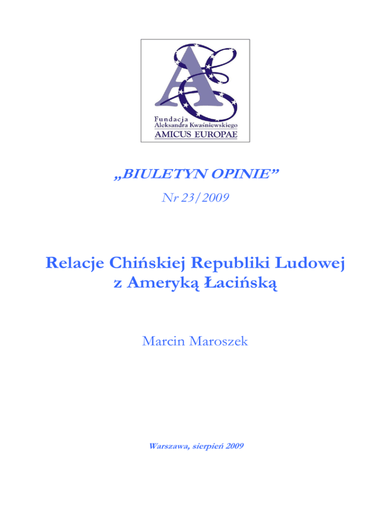 „BIULETYN OPINIE” Nr 23/2009 Relacje Chińskiej Republiki Ludowej z Ameryką Łacińską Marcin Maroszek Warszawa, sierpień 2009 „Biuletyn OPINIE” Fundacji Amicus Europae nr 23/2009 _____________________________________________________________________________________________________________________________________________________________________________________________________________________________________________ Jeszcze dziesięć lat temu zaledwie widoczne w Ameryce Łacińskiej, dziś Chiny są jednym z najwaŜniejszych partnerów regionu. Od lat po cichu, bez politycznych fajerwerków (w przeciwieństwie do Rosji i Iranu), za to nadzwyczaj skutecznie wypełniają lukę po Stanach Zjednoczonych. Podczas wizyty w Ameryce Łacińskiej w 2004 r. prezydent Chin Hu Jintao mówił, iŜ do końca dekady wymiana handlowa ChRL z regionem zwiększy się do 100 miliardów USD. Pułap ten przekroczono juŜ trzy lata później1. W pierwszej połowie 2009 r. Pekin zajął miejsce Waszyngtonu na pozycji najwaŜniejszego partnera handlowego Brazylii – regionalnego mocarstwa i największego kraju południowoamerykańskiego2. Jak do tego doszło? Na czym opiera się wzajemna współpraca? Czy kraje latynoamerykańskie na niej wyłącznie zyskują? Chiny i Ameryka Łacińska do końca XX w. Historiografia chińska stoi na stanowisku, Ŝe omawianie relacji Państwa Środka z krajami zachodniej półkuli naleŜałoby zaczynać od V w. n.e., kiedy to dwie róŜne wyprawy chińskie miały dotrzeć do kontynentów amerykańskich3. Abstrahując od tych (skądinąd ciekawych) doniesień naleŜy zauwaŜyć, iŜ powiązania Pekinu ze współczesnymi krajami Ameryki Południowej i Środkowej sięgają juŜ kilku wieków. Zapoczątkowana na przełomie XVII i XVIII w. emigracja z Cesarstwa na kontynenty amerykańskie, w XIX w. osiągnęła 250 tys. osób, co przyczyniło się do powstania stosunkowo licznej mniejszości chińskiej w niektórych krajach południowoamerykańskich. Choć w 1874 r. Cesarstwo nawiązało relacje dyplomatyczne z pierwszym krajem latynoamerykańskim (Peru), stosunki z regionem jako całością pozostały symboliczne. Do 1949 r. Pekin utrzymywał relacje dyplomatyczne i konsularne z 13 państwami Ameryki Łacińskiej. Drugą połowę XX w. Jan Rowiński dzieli na cztery podokresy we wzajemnych relacjach. Lata 1949-1963 to czas tzw. „ludowej dyplomacji”, gdy poprzez kontakty osobiste i handel starano się przecierać drogę dla oficjalnych relacji. NajwaŜniejszym wydarzeniem było wówczas nawiązanie oficjalnych relacji Chin z Kubą Fidela Castro (w 1960 r.), która stała się tym samym pierwszym krajem na zachodniej półkuli utrzymującym kontakty z Chińską Republiką Ludową (wszystkie pozostałe państwa regionu, jak większość świata, za reprezentanta państwa chińskiego uznawały 1 Prezydent Hu Jintao mówił wówczas o 100 miliardach USD inwestycji chińskich w regionie, później rząd ChRL zweryfikował, iŜ chodziło nie o inwestycje, lecz wartość wzajemnej wymiany handlowej. 2 China overtakes the US as Brazil's largest trading partner, www.telegraph.co.uk/finance/economics/5296515/China-overtakes-the-US-as-Brazils-largest-trading-partner.html. 3 J. Rowiński, Chiny-Ameryka Łacińska: szanse i wyzwania na progu XXI w. [w:] Ameryka Łacińska w regionie Azji i Pacyfiku, pod red. M.F. Gawryckiego, s. 99. 2 „Biuletyn OPINIE” Fundacji Amicus Europae nr 23/2009 _____________________________________________________________________________________________________________________________________________________________________________________________________________________________________________ wówczas Republikę Chińską na Tajwanie). Okres 1964-1970 to czas „rewolucyjnej obecności” charakteryzujący się wsparciem wszelkich lewicowych ruchów rewolucyjnych w Ameryce Łacińskiej. Trzeci okres przypada na lata 70. XX w., kiedy Waszyngton nawiązał relacje z Pekinem i to ChRL przejęła miejsce RCh w Radzie Bezpieczeństwa ONZ. W ślad za tym Pekin został uznany przez większość państw świata, w tym równieŜ przez 11 krajów latynoamerykańskich. Mimo to Ameryka Łacińska jako całość pozostała (do dziś) silną ostoją Tajpej. Czwarty okres jaki moŜna wyróŜnić we wzajemnych stosunkach to lata 80. i 90. ub. wieku, kiedy ChRL odeszła od ideologizacji swojej polityki zagranicznej na rzecz interesów politycznych i – później – gospodarczych. Pekin z krajami latynoamerykańskimi łączyło wiele (podobny poziom rozwoju gospodarczego, zapatrywania na kwestie międzynarodowe) i nie dzieliła Ŝadna zasadnicza róŜnica interesów. Decydenci po obydwóch stronach Pacyfiku zaczęli zdawać sobie z tego sprawę i powoli pogłębiać relacje, szczególnie po upadku systemu zimnowojennego w 1989 r. W omawianym okresie kolejnych 11 krajów Ameryki Łacińskiej uznało władze w Pekinie, a prezydent ChRL po raz pierwszy odbył podróŜ do krajów regionu (Yang Shangkun w 1990 r.). Prawdziwe oŜywienie wzajemnych relacji nastąpiło jednak dopiero z początkiem kolejnego stulecia. Geneza zbliŜenia na linii Chiny – Ameryka Łacińska W przeciwieństwie do Iranu czy Rosji, zasadniczym powodem zwiększonego zainteresowania Pekinu krajami latynoamerykańskimi były kwestie ekonomiczne4. Gospodarka chińska od lat 80. przeŜywała intensywny rozwój (ze średnim wzrostem PKB w ostatniej dekadzie równym 10%) stając się w początkach XXI w. trzecią potęgą ekonomiczną świata. Tak potęŜna i bezustannie rozbudowująca się w szybkim tempie gospodarka wymaga ogromnych, stale rosnących ilości surowców. Na pierwszy plan wysuwają się kwestie bezpieczeństwa energetycznego wymagające od władz ChRL dywersyfikacji dostawców ropy naftowej i gazu ziemnego5. Niemniej waŜne jednak dla zapewnienia gospodarce chińskiej funkcjonowania na stale wysokich obrotach jest zagwarantowanie dostaw innych surowców mineralnych, produktów rolnych, 