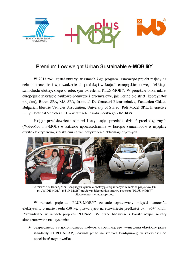 Premium Low weight Urban Sustainable e-MOBilitY W 2013 roku został otwarty, w ramach 7-go programu ramowego projekt mający na celu opracowanie i wprowadzenie do produkcji w krajach europejskich nowego lekkiego samochodu elektrycznego o roboczym określeniu PLUS-MOBY. W projekcie biorą udział europejskie instytucje naukowo-badawcze i przemysłowe, jak Torino e-district (koordynator projektu), Bitron SPA, MA SPA, Institutul De Cercetari Electrotehnice, Fundacion Cidaut, Bulgarian Electric Vehicles Association, University of Surrey, Poli Model SRL, Interactive Fully Electrical Vehicles SRL a w ramach udziału polskiego - IMBiGS. Podjęte przedsięwzięcie stanowi kontynuację uprzednich działań proekologicznych (Wide-Mob i P-MOB) w zakresie upowszechniania w Europie samochodów o napędzie czysto elektrycznym, z niską emisją zanieczyszczeń elektromagnetycznych. Komisarz d.s. Badań, Mrs. Geoghegan-Quinn w prototypie wykonanym w ramach projektów EU pt. „WIDE-MOD” and „P-MOB” przyjętym jako punkt startowy projektu “PLUS-MOBY” http://eeepro.shef.ac.uk/p-mob/ W ramach projektu “PLUS-MOBY” zostanie opracowany miejski samochód elektryczny, o masie rzędu 650 kg, pozwalający na rozwinięcie prędkości ok. “90+” km/h. Przewidziane w ramach projektu PLUS-MOBY prace badawcze i konstrukcyjne zostały skoncentrowane na uzyskaniu: bezpiecznego i ergonomicznego nadwozia, spełniającego wymagania określone przez standardy EURO NCAP, pozwalającego na szeroką konfigurację w zależności od oczekiwań użytkownika, zoptymalizowanego rozkładu mas, pozwalającego na bezpieczną jazdę w każdych warunkach atmosferycznych (z uwzględnieniem silnego wiatru bocznego) niezależnie od obciążenia użytkowego pojazdu - z wykorzystaniem elektronicznych sterowników systemów bezpieczeństwa - nowoczesne systemy aktywnych kontrolerów jazdy, w tym ABS oraz ESP, umiarkowanego zapotrzebowania energetycznego, szacowanego w pierwszej fazie na 65Wh/km, z założeniem dalszego zmniejszenia poprzez zastosowanie systemów rekuperacji energii, co powinno przy zastosowaniu alternatywnych źródeł energii (baterie fotowoltaiczne) na uzyskanie zapotrzebowania średniego na poziomie niższym niż 40Wh/km w cyklu pomiarowym NEDC. Przewiduje się opracowanie - obok przyjaznej dla małych i średnich producentów konstrukcji - technologii niskokosztowego montażu, bez ograniczania funkcjonalności oraz estetyki pojazdu. Technologie te będą nawiązywały do rozwiązań proponowanych w uprzednich działaniach EU podejmowanych w ramach Green Car Initiative. Zakłada się, że w trwającym przez 3 lata projekcie powstaną: demonstracyjny prototyp pojazdu PLUS-MOBY z szeregiem innowacyjnych rozwiązań techniczno-technologicznych, baza rozwiązań możliwych do zastosowania przez producentów europejskich w większości lekkich EV, baza wiedzy pozwalająca na dalsze generowanie rozwoju technologicznego w państwach UE, i wytworzenia rozwiązań konkurencyjnych w stosunku do wyrobów japońskich i amerykańskich. Istotnym celem projektu jest aktywizacja sektora małych i średnich przedsiębiorstw produkcyjnych w różnych państwach UE i wytworzenie rozwiązań alternatywnych dla wprowadzanych przez wielkie koncerny motoryzacyjne. Będzie to miało miejsce poprzez organizowanie optymalnych łańcuchów dostaw opartych w znacznej mierze na podzespołach wytwarzanych przez producentów lokalnych (za wyjątkiem zespołów o charakterze specjalistycznym). Nowy produkt ma również za zadanie oddziaływać na świadomość ekologiczna społeczeństw europejskich, doskonale wpisując sie w ogólnoeuropejską politykę wyprowadzenia ruchu pojazdów z silnikami spalinowymi z dużych aglomeracji miejskich, co pozwoli w przyszłości na istotną poprawę lokalnych warunków środowiskowych. Opr. Zakład MB - IMBiGS