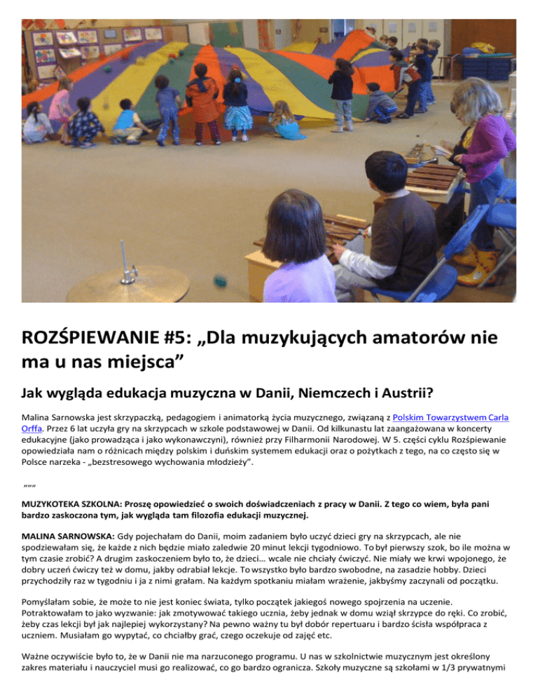 ROZŚPIEWANIE #5: „Dla muzykujących amatorów nie ma u nas miejsca” Jak wygląda edukacja muzyczna w Danii, Niemczech i Austrii? Malina Sarnowska jest skrzypaczką, pedagogiem i animatorką życia muzycznego, związaną z Polskim Towarzystwem Carla Orffa. Przez 6 lat uczyła gry na skrzypcach w szkole podstawowej w Danii. Od kilkunastu lat zaangażowana w koncerty edukacyjne (jako prowadząca i jako wykonawczyni), również przy Filharmonii Narodowej. W 5. części cyklu Rozśpiewanie opowiedziała nam o różnicach między polskim i duńskim systemem edukacji oraz o pożytkach z tego, na co często się w Polsce narzeka - „bezstresowego wychowania młodzieży”. „„„ MUZYKOTEKA SZKOLNA: Proszę opowiedzieć o swoich doświadczeniach z pracy w Danii. Z tego co wiem, była pani bardzo zaskoczona tym, jak wygląda tam filozofia edukacji muzycznej. MALINA SARNOWSKA: Gdy pojechałam do Danii, moim zadaniem było uczyć dzieci gry na skrzypcach, ale nie spodziewałam się, że każde z nich będzie miało zaledwie 20 minut lekcji tygodniowo. To był pierwszy szok, bo ile można w tym czasie zrobić? A drugim zaskoczeniem było to, że dzieci… wcale nie chciały ćwiczyć. Nie miały we krwi wpojonego, że dobry uczeń ćwiczy też w domu, jakby odrabiał lekcje. To wszystko było bardzo swobodne, na zasadzie hobby. Dzieci przychodziły raz w tygodniu i ja z nimi grałam. Na każdym spotkaniu miałam wrażenie, jakbyśmy zaczynali od początku. Pomyślałam sobie, że może to nie jest koniec świata, tylko początek jakiegoś nowego spojrzenia na uczenie. Potraktowałam to jako wyzwanie: jak zmotywować takiego ucznia, żeby jednak w domu wziął skrzypce do ręki. Co zrobić, żeby czas lekcji był jak najlepiej wykorzystany? Na pewno ważny tu był dobór repertuaru i bardzo ścisła współpraca z uczniem. Musiałam go wypytać, co chciałby grać, czego oczekuje od zajęć etc. Ważne oczywiście było to, że w Danii nie ma narzuconego programu. U nas w szkolnictwie muzycznym jest określony zakres materiału i nauczyciel musi go realizować, co go bardzo ogranicza. Szkoły muzyczne są szkołami w 1/3 prywatnymi (w 1/3 finansuje je państwo, 1/3 gmina, a w 1/3 sami rodzice). To, czego oczekuje uczeń, jest bardzo ważne dla nauczyciela. On nie może niczego narzucić, może uczniowi jedynie asystować, lub zachęcić żeby dziecko poszło w tę stronę, w którą chciałby nauczyciel. Nie można niczego kazać, bo uczeń ma też swoje zdanie. Coś, co u nas wydaje się bardzo prestiżowe – np. występ na koncercie - dla dziecka w Danii prestiżowe wcale być nie musi. Z początku myślałam, że każdy uczeń, któremu zaproponuję, żeby grał, pomyśli sobie „pani mnie doceniła, oczywiście, że wystąpię”. A wcale tak nie było. Nawet bardzo dobrzy uczniowie nie pałali chęcią, żeby wystąpić. Musiałam się nauczyć sztuczek, jak rozmawiać z dzieckiem, żeby to był jego wybór. Dlaczego Duńczycy zdecydowali się na tak liberalny model? Jesteśmy przyzwyczajeni do tego, że nauczyciel to jest ktoś, kto ma władzę i autorytet. A z tym autorytetem w Danii nie jest tak samo. Tam wychodzi się z założenia, że każdy znajdzie swojego mistrza. Ten sam nauczyciel wcale nie musi być dobry dla wszystkich. Poza tym to uczeń decyduje, czy chce grać czy nie, jest kowalem własnego losu. To było dla mnie szokujące odkrycie. Kolejnym zaskoczeniem było to, że nawet w takiej sytuacji można czegoś dokonywać. Dwóch uczniów z mojej szkoły w 11-tysięcznym miasteczku Histed jest w tej chwili na wyższych uczelniach muzycznych. Jeden z nich szykuje się do prestiżowego konkursu muzyki kameralnej, a nawet studiował przez rok w Royal Academy of Music. Uważam, że, jak na początki nauki, które opisałam, to ogromny sukces. Oprócz tego dużym osiągnięciem był fakt, że 11 dzieci kupiło swoje instrumenty. To znaczyło, że to nie jest dla nich jakaś przelotna fanaberia. One uznały, że w życiu warto sięgać po skrzypce. Ta strona kształcenia jest u nas dość zapomniana. W Polsce kształci się muzyków zawodowych, natomiast dla amatorów, którzy chcą po prostu dobrze grać na instrumencie, właściwie nie ma miejsca. Zostają tylko lekcje prywatne, a i one często pozostawiają wiele do życzenia. Sami nauczyciele chyba nie przepadają za nimi, bo wydaje im się, że nie ma jak ucznia zmotywować, nie widać postępów w wyniku takich lekcji. No właśnie, czy w polskim systemie nauczania poświęca się wystarczająco miejsca temu, jak motywować ucznia, poza systemem ocen, nagród i kar? W polskich programach nauczania właściwie nie ma śladu tego. W Danii każda szkoła układa swój własny statut, w którym formułuje cele nauczania. W szkole, w której ja pracowałam, głównym założeniem było wykształcanie miłości do muzyki i motywacji. Wszelkie sprawy techniczne były tam pominięte. To może wydawać się zabawne, ale długo dyskutowano, czy w statucie powinna być mowa o nauczaniu nut jako o podstawowej umiejętności. Była grupa nauczycieli, która uważała, że to absolutnie nie powinno znaleźć się w bazie programowej. Dziwię się, czytając nasze podstawy programowe, że pomija się zupełnie aspekt umiłowania i pasji do muzyki. A przynajmniej jest to sformułowanie bardzo oszczędnie w porównaniu z opisem umiejętności technicznych. Wielka szkoda. Kolejnym ważnym doświadczeniem były dla pani studia w Instytutcie Orffa w Salzburgu. Kurs, w którym brałam udział, już w samej nazwie miał „studia policencjackie pedagogiki i tańca”. Kształcono tam z myślą, że nauczyciel otwarty i wrażliwy na świat muzyki również potrafi się dobrze ruszać. Muzyka w pojęciu Carla Orffa to połączenie mowy, ruchu, śpiewu, gry na instrumencie i tańca. Tych 5 elementów do dziś kultywuje się w Instytucie Orffa i każdy ze studentów zdobywa wykształcenie w tych 5 dziedzinach. Szkoła Orffa uczy, że nie można z
