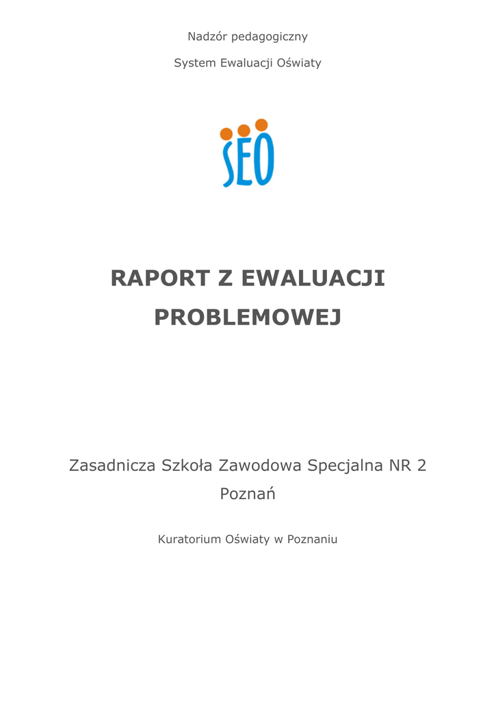 Nadzór pedagogiczny System Ewaluacji Oświaty RAPORT Z EWALUACJI PROBLEMOWEJ Zasadnicza Szkoła Zawodowa Specjalna NR 2 Poznań Kuratorium Oświaty w Poznaniu Wstęp Prezentowany raport jest rezultatem ewaluacji zewnętrznej przeprowadzonej w szkole przez wizytatorów do spraw ewaluacji. Raport z ewaluacji problemowej dotyczy jednego lub kilku z przedstawionych poniżej wymagań państwa. Ewaluacja zewnętrzna polega na zbieraniu i analizowaniu informacji na temat funkcjonowania szkoły w obszarach wyznaczonych przez wymagania państwa: 1. Szkoła lub placówka realizuje koncepcję pracy ukierunkowaną na rozwój uczniów. 2. Procesy edukacyjne są zorganizowane w sposób sprzyjający uczeniu się. 3. Uczniowie nabywają wiadomości i umiejętności określone w podstawie programowej. 4. Uczniowie są aktywni. 5. Respektowane są normy społeczne. 6. Szkoła lub placówka wspomaga rozwój uczniów, z uwzględnieniem ich indywidualnej sytuacji. 7. Nauczyciele współpracują w planowaniu i realizowaniu procesów edukacyjnych. 8. Promowana jest wartość edukacji. 9. Rodzice są partnerami szkoły lub placówki. 10. Wykorzystywane są zasoby szkoły lub placówki oraz środowiska lokalnego na rzecz wzajemnego rozwoju. 11. Szkoła lub placówka, organizując procesy edukacyjne, uwzględnia wnioski z analizy wyników sprawdzianu, egzaminu gimnazjalnego, egzaminu maturalnego, egzaminu potwierdzającego kwalifikacje zawodowe i egzaminu potwierdzającego kwalifikacje w zawodzie oraz innych badań zewnętrznych i wewnętrznych. 12. Zarządzanie szkołą lub placówką służy jej rozwojowi. Ewaluacja ma także na celu ustalenie poziomu spełniania przez szkołę wymagań zawartych w rozporządzeniu Ministra Edukacji Narodowej z dnia 7.10.2009r. wraz ze zmianami z dnia 10.05.2013r. Szkoła może spełniać te wymagania na pięciu poziomach: ● Poziom E - oznaczający niski stopień wypełniania wymagania przez szkołę. ● Poziom D - oznaczający podstawowy stopień wypełniania wymagania przez szkołę. ● Poziom C - oznaczający średni stopień wypełniania wymagania przez szkołę. ● Poziom B - oznaczający wysoki stopień wypełniania wymagania przez szkołę. ● Poziom A - oznaczający bardzo wysoki stopień wypełniania wymagania przez szkołę. Zasadnicza Szkoła Zawodowa Specjalna NR 2 2/30 Opis metodologii Badanie zostało zrealizowane w dniach 05-12-2014 - 19-12-2014 przez zespół wizytatorów ds. ewaluacji, w skład którego weszły: Brygida Wieczorek, Aldona Rożnowska. Badaniem objęto 14 uczniów (ankieta i wywiad grupowy), 10 Przeprowadzono rodziców wywiad (ankieta i wywiad indywidualny grupowy) z dyrektorem i 22 placówki, nauczycieli grupowy (ankieta i wywiad grupowy). z przedstawicielami samorządu lokalnego i partnerów szkoły, grupowy z pracownikami niepedagogicznymi, a także obserwacje lekcji, placówki i analizę dokumentacji. Na podstawie zebranych danych został sporządzony raport, który obejmuje podstawowe obszary działania szkoły lub placówki. Wyjaśnienie skrótów dla narzędzi: OS - Arkusz obserwacji szkoły OZ - Arkusz obserwacji zajęć AD - Kwestionariusz ankiety dla dyrektora/dyrektorki szkoły AN - Kwestionariusz ankiety dla nauczycieli AR - Kwestionariusz ankiety dla rodziców AMD - Kwestionariusz ankiety dla uczniów "Mój dzień" AMS - Kwestionariusz ankiety dla uczniów "Moja szkoła" APW - Kwestionariusz ankiety poewaluacyjnej dla wizytatora ADZ - Kwestionariusz badania "Analiza danych zastanych" WN - Scenariusz wywiadu grupowego z nauczycielami WD - Scenariusz wywiadu z dyrektorem/dyrektorką szkoły WNPO - Scenariusz wywiadu z nauczycielem po obserwacji WP - Scenariusz wywiadu z partnerami WPN - Scenariusz wywiadu z pracownikami niepedagogicznymi WUI-III - Scenariusz wywiadu z uczniami klas I-III (szkoła podstawowa) WUPO - Scenariusz wywiadu z uczniami po obserwacji WNO - Scenariusz wywiadu z zespołem nauczycieli uczących w jednym oddziale Zasadnicza Szkoła Zawodowa Specjalna NR 2 3/30 Obraz szkoły Raport z ewaluacji problemowej, przeprowadzony w Zasadniczej Szkole Zawodowej Specjalnej nr 102 w Zespole Szkół Specjalnych nr 102 im. Jana Pawła II w Poznaniu, jest rezultatem pracy wizytatorów do spraw ewaluacji Kuratorium Oświaty w Poznaniu. Przedstawiamy Państwu wnioski wynikające z badań ankietowych, wywiadów, obserwacji zajęć i analizy dokumentacji. W procesie badania uwzględnione zostały opinie wszystkich respondentów: uczniów, rodziców, dyrektora, nauczycieli, pracowników niepedagogicznych i partnerów współpracujących ze szkołą. Lektura raportu pozwoli czytelnikowi na wgląd w wybrane obszary pracy szkoły i mamy nadzieję, że będzie inspiracją dla pracowników do rozwoju i osiągania coraz lepszej jakości pracy. Do szkoły zawodowej uczęszczają uczniowie z niepełnosprawnością intelektualną w stopniu lekkim, umiarkowanym lub znacznym, w tym uczniowie z niepełnosprawnością sprzężoną. Uczniowie kształcą się w zawodach: pracownik pomocniczy obsługi hotelowej lub kucharz. Przygotowywani są do pracy w hotelach lub innych obiektach turystycznych. Wymagana jest od nich wysoka kultura osobista, zdyscyplinowanie i postępowanie zgodnie z procedurami określonymi na stanowisku pracy. Nauka w szkole trwa trzy lata. Praktyczna nauka zwodu odbywa się w pracowniach szkolnych i hotelach. Organizacja procesu edukacyjnego, pozytywne relacje między całą społecznością szkolną i udzielanie uczniom informacji zwrotnej, służą ich rozwojowi. Uczniowie mają świadomość odpowiedzialności za efekty swej pracy. Wiedzą, że wyniki w nauce zależą głównie od ich zaangażowania i atmosfery w klasie, a także pracy nauczycieli. Większość uczniów uznaje, że nauczyciele dobrze tłumaczą zagadnienia i potrafią zainteresować tematem lekcji, a sposób w jaki uczą, wpływa na ich umiejętność samodzielnego uczenia się. W ich opinii, nauczyciele na lekcjach dają możliwość refleksji nad zdobyt