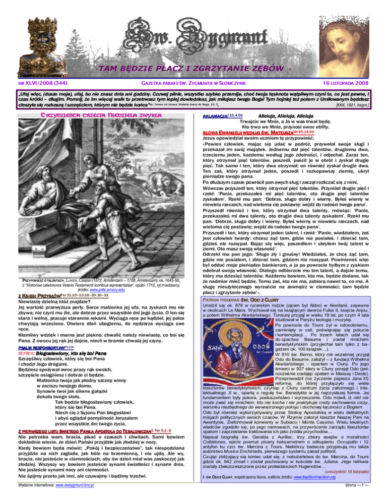 xxx »TAM BĘDZIE PŁACZ I ZGRZYTANIE ZĘBÓW…« NR XLVI/2008 (34 (344) GAZETKA PARAFII ŚW. ZYGMUNTA W SŁOMCZYNIE 16 LISTOPADA 2008 „Ufaj więc, (duszo moja), ufaj, bo nie znasz dnia ani godziny. Czuwaj pilnie, wszystko szybko przemija, choć twoja tęsknota wątpliwym czyni to, co jest pewne, i czas krótki – długim. Pomnij, że im więcej walk tu przetrwasz tym lepiej dowiedziesz, jak miłujesz miłujesz twego Boga! Tym hojniej też potem z Umiłowanym będziesz [KKK, 1821, fragm.] cieszyła się rozkoszą i szczęściem, którym nie będzie końca”św. Teresa od Jezusa, Wołania duszy do Boga, 15, 3. TR RZYD DZIIE ES TA TR RZ ZECIIA ED DZ EL LA AZ ZW YK KŁ ŁA ST AT A NIIE ZIIE WY A AKLAMACJAJ 15,4.5b Alleluja, Alleluja, Alleluja Trwajcie we Mnie, a Ja w was trwał będę. Kto trwa we Mnie, przynosi owoc obfity. SŁOWA EWANGELII WEDŁUG ŚW. MATEUSZAMt 25,14-30 PRZYPOWIEŚĆ O TALENTACH , LUIKEN , Caspar (1672, Amsterdam – 1708, Amsterdam), ok. 1645-50, z "Historiae celebriores Veteris Testamenti Iconibus representatae", opubl. 1712, ryt miedziany; źródło: www.pitts.emory.edu Z KSIĘGI PRZYSŁÓWPrz 31,10–13.19–20.30–31 Niewiastę dzielną któż znajdzie? Jej wartość przewyższa perły. Serce małżonka jej ufa, na zyskach mu nie zbywa; nie czyni mu źle, ale dobrze przez wszystkie dni jego życia. O len się stara i wełnę, pracuje starannie rękami. Wyciąga ręce po kądziel, jej palce chwytają wrzeciono. Otwiera dłoń ubogiemu, do nędzarza wyciąga swe ręce. Kłamliwy wdzięk i marne jest piękno: chwalić należy niewiastę, co boi się Pana. Z owocu jej rąk jej dajcie, niech w bramie chwalą jej czyny. PSALM RESPONSORYJNYPs128 REFREN: Błogosławiony, kto się boi Pana Szczęśliwy człowiek, który się boi Pana i chodzi Jego drogami. Będziesz spożywał owoc pracy rąk swoich, szczęście osiągniesz i dobrze ci będzie. Małżonka twoja jak płodny szczep winny w zaciszu twojego domu. Synowie twoi jak oliwne gałązki dokoła twego stołu. Tak będzie błogosławiony człowiek, który się boi Pana. Niech cię z Syjonu Pan błogosławi i abyś oglądał pomyślność Jeruzalem przez wszystkie dni twego życia. Z PIERWSZEGO LISTU ŚWIĘTEGO ŚWIĘTEGO PAWŁA APOSTOŁA DO TESALONICZAN1 Tes 5,1–6 Nie potrzeba wam, bracia, pisać o czasach i chwilach. Sami bowiem dokładnie wiecie, że dzień Pański przyjdzie jak złodziej w nocy. Kiedy bowiem będą mówić: „Pokój i bezpieczeństwo”, tak niespodziana przyjdzie na nich zagłada, jak bóle na brzemienną, i nie ujdą. Ale wy, bracia, nie jesteście w ciemnościach, aby ów dzień miał was zaskoczyć jak złodziej. Wszyscy wy bowiem jesteście synami światłości i synami dnia. Nie jesteście synami nocy ani ciemności. Nie śpijmy przeto jak inni, ale czuwajmy i bądźmy trzeźwi. Wydanie internetowe: www.swzygmunt.knc.pl Jezus opowiedział swoim uczniom tę przypowieść: »Pewien człowiek, mając się udać w podróż, przywołał swoje sługi i przekazał im swój majątek. Jednemu dał pięć talentów, drugiemu dwa, trzeciemu jeden, każdemu według jego zdolności, i odjechał. Zaraz ten, który otrzymał pięć talentów, poszedł, puścił je w obrót i zyskał drugie pięć. Tak samo i ten, który dwa otrzymał; on również zyskał drugie dwa. Ten zaś, który otrzymał jeden, poszedł i rozkopawszy ziemię, ukrył pieniądze swego pana. Po dłuższym czasie powrócił pan owych sług i zaczął rozliczać się z nimi. Wówczas przyszedł ten, który otrzymał pięć talentów. Przyniósł drugie pięć i rzekł: ‘Panie, przekazałeś mi pięć talentów, oto drugie pięć talentów zyskałem’. Rzekł mu pan: ‘Dobrze, sługo dobry i wierny. Byłeś wierny w niewielu rzeczach, nad wieloma cię postawię: wejdź do radości twego pana’. Przyszedł również i ten, który otrzymał dwa talenty, mówiąc: ‘Panie, przekazałeś mi dwa talenty, oto drugie dwa talenty zyskałem’. Rzekł mu pan: ‘Dobrze, sługo dobry i wierny. Byłeś wierny w niewielu rzeczach, nad wieloma cię postawię; wejdź do radości twego pana’. Przyszedł i ten, który otrzymał jeden talent, i rzekł: ‘Panie, wiedziałem, żeś jest człowiek twardy: chcesz żąć tam, gdzie nie posiałeś, i zbierać tam, gdzieś nie rozsypał. Bojąc się więc, poszedłem i ukryłem twój talent w ziemi. Oto masz swoją własność’. Odrzekł mu pan jego: ‘Sługo zły i gnuśny! Wiedziałeś, że chcę żąć tam, gdzie nie posiałem, i zbierać tam, gdziem nie rozsypał. Powinieneś więc był oddać moje pieniądze bankierom, a ja po powrocie byłbym z zyskiem odebrał swoją własność. Dlatego odbierzcie mu ten talent, a dajcie temu, który ma dziesięć talentów. Każdemu bowiem, kto ma, będzie dodane, tak że nadmiar mieć będzie. Temu zaś, kto nie ma, zabiorą nawet to, co ma. A sługę nieużytecznego wyrzućcie na zewnątrz w ciemności; tam będzie płacz i zgrzytanie zębów’«. PATRON TYGODNIA: ŚW. ODO Z CLUNY Urodził się ok. 878 w rycerskim rodzie (ojcem był Abbo) w Akwitanii, zapewne w okolicach Le Mans. Wychował się na książęcym dworze Fulka II, księcia Anjou, a potem Wilhelma Akwitańskiego. Tonsurę przyjął w wieku 19 lat, po czym 4 lata studiował w Paryżu teologię i muzykę. Po powrocie do Tours żył w odosobnieniu, zamknięty w celi, poświęcając się pokucie i kontemplacji… Po trzech latach udał się do opactwa Beaume i został mnichem benedyktyńskim (przyjechał tam tylko z bagażem ok. 100 książek…). W 910 św. Berno, który rok wcześniej przyjął Odo do Beaume, założył – z fundacji Wilhelma Akwitańskiego - opactwo w Cluny. Po jego śmierci w 927 stery w Cluny przejął Odo (jednocześnie zostając opatem w Massay i Deols). Przeprowadził (na życzenie papieża Jana XI) reformę, do której przyłączyło się wiele klasztorów benedyktyńskich, czyniąc z Cluny centrum życia zakonnego i intelektualnego X w., opartą o regułę św. Ben