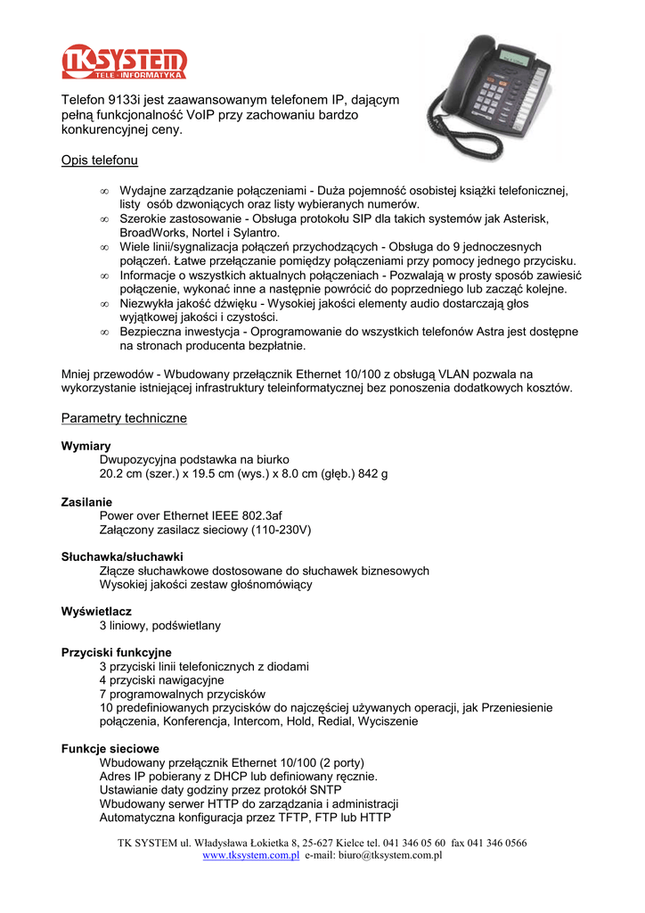 Telefon 9133i jest zaawansowanym telefonem IP, dającym pełną funkcjonalność VoIP przy zachowaniu bardzo konkurencyjnej ceny. Opis telefonu • • • • • • Wydajne zarządzanie połączeniami - DuŜa pojemność osobistej ksiąŜki telefonicznej, listy osób dzwoniących oraz listy wybieranych numerów. Szerokie zastosowanie - Obsługa protokołu SIP dla takich systemów jak Asterisk, BroadWorks, Nortel i Sylantro. Wiele linii/sygnalizacja połączeń przychodzących - Obsługa do 9 jednoczesnych połączeń. Łatwe przełączanie pomiędzy połączeniami przy pomocy jednego przycisku. Informacje o wszystkich aktualnych połączeniach - Pozwalają w prosty sposób zawiesić połączenie, wykonać inne a następnie powrócić do poprzedniego lub zacząć kolejne. Niezwykła jakość dźwięku - Wysokiej jakości elementy audio dostarczają głos wyjątkowej jakości i czystości. Bezpieczna inwestycja - Oprogramowanie do wszystkich telefonów Astra jest dostępne na stronach producenta bezpłatnie. Mniej przewodów - Wbudowany przełącznik Ethernet 10/100 z obsługą VLAN pozwala na wykorzystanie istniejącej infrastruktury teleinformatycznej bez ponoszenia dodatkowych kosztów. Parametry techniczne Wymiary Dwupozycyjna podstawka na biurko 20.2 cm (szer.) x 19.5 cm (wys.) x 8.0 cm (głęb.) 842 g Zasilanie Power over Ethernet IEEE 802.3af Załączony zasilacz sieciowy (110-230V) Słuchawka/słuchawki Złącze słuchawkowe dostosowane do słuchawek biznesowych Wysokiej jakości zestaw głośnomówiący Wyświetlacz 3 liniowy, podświetlany Przyciski funkcyjne 3 przyciski linii telefonicznych z diodami 4 przyciski nawigacyjne 7 programowalnych przycisków 10 predefiniowanych przycisków do najczęściej uŜywanych operacji, jak Przeniesienie połączenia, Konferencja, Intercom, Hold, Redial, Wyciszenie Funkcje sieciowe Wbudowany przełącznik Ethernet 10/100 (2 porty) Adres IP pobierany z DHCP lub definiowany ręcznie. Ustawianie daty godziny przez protokół SNTP Wbudowany serwer HTTP do zarządzania i administracji Automatyczna konfiguracja przez TFTP, FTP lub HTTP TK SYSTEM ul. Władysława Łokietka 8, 25-627 Kielce tel. 041 346 05 60 fax 041 346 0566 www.tksystem.com.pl e-mail: [email protected] Protokoły/kodeki IETF SIP (RFC3261) IETF MGCP (RFC3435) G.711 u-law / A-law G.729 Przegląd funkcjonalności Osobista ksiąŜka telefoniczna Przekazywanie połączeń Połączenia oczekujące Transfer połączeń Informacja o dzwoniącym Logi wykonanych połączeń Połączenia konferencyjne Zawieszanie połączeń Odbiór komunikatów z sieci Automatyczny status aparatu CallCenter - proste dane statystyczne zalogowanego agenta Status agenta sterowany z centrali Asterisk Zawartość pakietu Telefon IP Aastra 9133i Podstawka biurkowa pod telefon Szybki start - instrukcja instalacji Kabel sieciowy Zasilacz sieciowy TK SYSTEM ul. Władysława Łokietka 8, 25-627 Kielce tel. 041 346 05 60 fax 041 346 0566 www.tksystem.com.pl e-mail: [email protected]