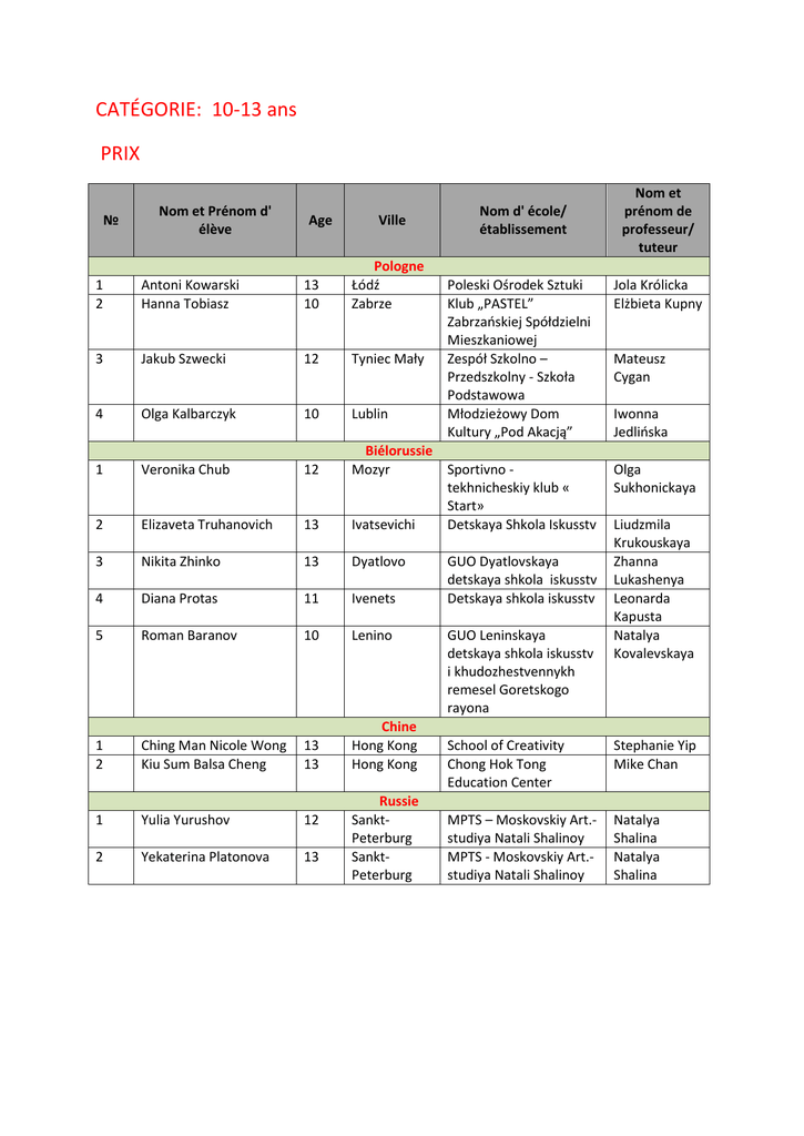 CATÉGORIE: 10-13 ans PRIX № Nom et Prénom d' élève Age Ville Nom d' école/ établissement 1 2 Antoni Kowarski Hanna Tobiasz 13 10 Pologne Łódź Zabrze 3 Jakub Szwecki 12 Tyniec Mały 4 Olga Kalbarczyk 10 Lublin 1 Veronika Chub 12 2 Elizaveta Truhanovich 13 Biélorussie Mozyr Sportivno tekhnicheskiy klub « Start» Ivatsevichi Detskaya Shkola Iskusstv 3 Nikita Zhinko 13 Dyatlovo 4 Diana Protas 11 Ivenets 5 Roman Baranov 10 Lenino Chine Hong Kong Hong Kong 1 2 Ching Man Nicole Wong Kiu Sum Balsa Cheng 13 13 1 Yulia Yurushov 12 2 Yekaterina Platonova 13 Russie SanktPeterburg SanktPeterburg Poleski Ośrodek Sztuki Klub „PASTEL” Zabrzaoskiej Spółdzielni Mieszkaniowej Zespół Szkolno – Przedszkolny - Szkoła Podstawowa Młodzieżowy Dom Kultury „Pod Akacją” GUO Dyatlovskaya detskaya shkola iskusstv Detskaya shkola iskusstv GUO Leninskaya detskaya shkola iskusstv i khudozhestvennykh remesel Goretskogo rayona Nom et prénom de professeur/ tuteur Jola Królicka Elżbieta Kupny Mateusz Cygan Iwonna Jedlioska Olga Sukhonickaya Liudzmila Krukouskaya Zhanna Lukashenya Leonarda Kapusta Natalya Kovalevskaya School of Creativity Chong Hok Tong Education Center Stephanie Yip Mike Chan MPTS – Moskovskiy Art.studiya Natali Shalinoy MPTS - Moskovskiy Art.studiya Natali Shalinoy Natalya Shalina Natalya Shalina PRIX D' HONNEUR № Nom et Prénom d' élève Age Ville 1 Aurelia Grabowska 11 Pologne Zabrze 2 Dominik Wdowiak 11 Turek 3 Wiktoria Rzążewska 13 Lublin 4 Julia Pardus 13 Lublin 5 Natalia Glapiak 13 Krobia 6 Weronika Bronkowska 11 Sosnowiec 7 Katarzyna Gładyś 13 Tychy 8 Izabela Grudzieo 13 Sobolew 9 Aleksandra Watała 11 Zabrze 10 Zuzanna Kotlioska 13 Zamośd 11 Kinga Figlaoska 12 Rybnik Nom d' école/ établissement Klub „PASTEL” Zabrzaoskiej Spółdzielni Mieszkaniowej Szkoła Podstawowa nr 1 im. Henryka Sienkiewicza Młodzieżowy Dom Kultury „Pod Akacją” Młodzieżowy Dom Kultury „Pod Akacją” Zespół Szkoły Podstawowej im. prof. Józefa Zwierzyckiego i Gimnazjum w Krobi Wytwórnia Studio Sztuk Plastycznych Młodzieżowy Dom Kultury nr 2 Publiczne Gimnazjum w Sobolewie im. H. Sienkiewicza Klub „PASTEL” Zabrzaoskiej Spółdzielni Mieszkaniowej Stowarzyszenie Drukarnia Wyobraźni Młodzieżowy Dom Kultury – Pracownia Walor 1 Katsiaryna Yarashuk 12 2 Iean Kourankov 13 Biélorussie Brest GUO ‘Srednyaya Shkola N32 g. Bresta Orsha Gymnasium N 1 3 Masha Yursha 13 Rechitsa 4 Viktoriya Malivanova 10 Zyabrovka 5 Pauline Grishkevich 13 Lida 11 Bulgarie Lovech 1 Kameliya Danailova Nikolova Rechitskaya detskaya shkola iskusstv GUO Zyabrovskaya detskaya shkola iskusstv GUO Lida Pueri Scriptor Art Scholam Arts Est Art –School “Geya” Municipality Children’s Complex Nom et prénom de professeur/ tuteur Krzysztof Rumin Aldona Piwooska Iwonna Jedlioska Iwonna Jedlioska Dagmara Nawrocka Mirosława Kostyła Adam Niesyto Ewa Rogulska Elżbieta Kupny Maria Śliczniak Ewa Tomas Modlich Yuliya Piachylina Valentina Shutova Natalia Deikun Oleg Suokov Lily Crest Kremena Popova 2 Mishel Atanasova Emanuilova 12 Lovech Chine Hong Kong 1 Wing Yu Tong 13 2 Nga Sze Or 13 1 Lea Brlekovid 10 1 Paulina Mach 1 Eliza Zalisz 1 Shruti Vinayak Kadam 1 Mina Pridatchenko 2 Bolsheker Adilkan 1 Anna Grigorjeva Hong Kong Croatie Rijeka Art –School “Geya” Municipality Children’s Complex Kremena Popova Chong Hok Tong Education Center School of Creativity Mike Chan Elementary school “Nikola Tesla” Helena Baraka Chypre 11 Limassol Silverline Private School République Tchèque 13 Třinec ZŠaMŠ Gustawa Przeczka s polskỳm jazykem vyučovacim Inde 13 Mumbai, Gurukul School of Art Maharasahtr a République du Kazakhstan 11 Pavlodar Children’s art school No 1 – Club UNESCO 10 Pavlodar Children’s art school No 1 – Club UNESCO 10 Lettonie Daugavpils 1 Reeba Khalid 11 Pakistan Lahore 1 Valeria Krakalitsa 13 Russie Cherepovets 2 Angelika Kopilova 12 Cherepovets 3 Lada Kalinina 12 SanktPeterburg 1 Aliff Amir 11 1 Darinka Dvoretskaya 13 1 Milán Mohácsi 10 Stephanie Yip Eleni Koulla Maria Drobisz Sagar Prithviraj Kambi Natalya Shakhova Gulnar Mukhametkalin a DDMV “Saules Skola” Jelena Silivanova The City School – Alpha Dha Campus Ismara Zahid MBOU DOD Detskaya shkola iskusstv MBOU DOD Detskaya shkola iskusstv MPTS - Moskovskiy Art·studiya Natali Shalinoy Nataliya Kornilova Nataliya Kornilova Natalya Shalina Turkménistan Ashgabat Ashgabat International School Ukraine Ulianovka Ulianovskaya shkola iskusstv Hongrie Berettyóújfal Igazgyöngy Alapfokú u Műuészeti Iskola Aga Rainbow Raisa Resnianskaya Zita Török