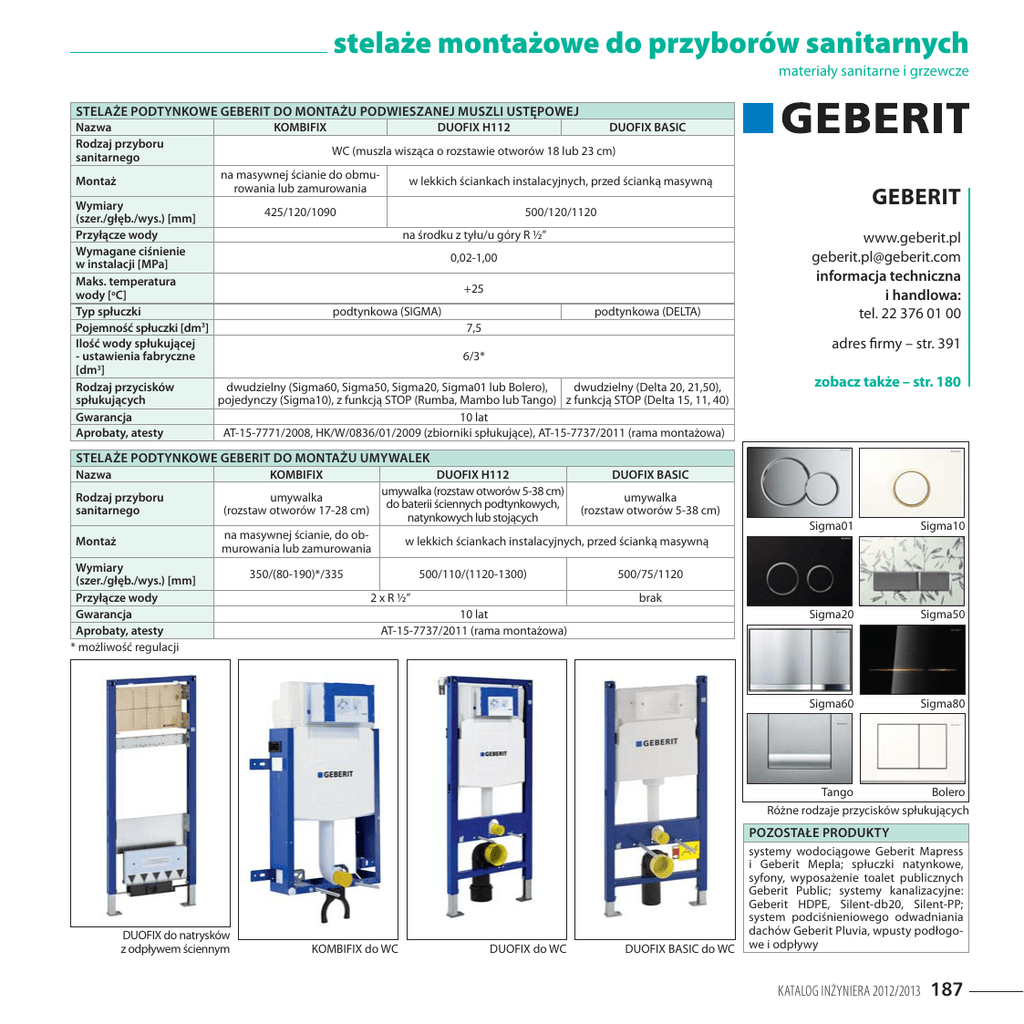 stelaże montażowe do przyborów sanitarnych materiały sanitarne i grzewcze STELAŻE PODTYNKOWE GEBERIT DO MONTAŻU PODWIESZANEJ MUSZLI USTĘPOWEJ Nazwa Rodzaj przyboru sanitarnego KOMBIFIX DUOFIX H112 na masywnej ścianie do obmurowania lub zamurowania Montaż DUOFIX BASIC WC (muszla wisząca o rozstawie otworów 18 lub 23 cm) w lekkich ściankach instalacyjnych, przed ścianką masywną Wymiary 425/120/1090 500/120/1120 (szer./głęb./wys.) [mm] Przyłącze wody na środku z tyłu/u góry R ½” Wymagane ciśnienie 0,02-1,00 w instalacji [MPa] Maks. temperatura +25 wody [oC] Typ spłuczki podtynkowa (SIGMA) podtynkowa (DELTA) Pojemność spłuczki [dm3] 7,5 Ilość wody spłukującej - ustawienia fabryczne 6/3* [dm3] Rodzaj przycisków dwudzielny (Sigma60, Sigma50, Sigma20, Sigma01 lub Bolero), dwudzielny (Delta 20, 21,50), spłukujących pojedynczy (Sigma10), z funkcją STOP (Rumba, Mambo lub Tango) z funkcją STOP (Delta 15, 11, 40) Gwarancja 10 lat Aprobaty, atesty AT-15-7771/2008, HK/W/0836/01/2009 (zbiorniki spłukujące), AT-15-7737/2011 (rama montażowa) STELAŻE PODTYNKOWE GEBERIT DO MONTAŻU UMYWALEK Nazwa KOMBIFIX DUOFIX H112 umywalka (rozstaw otworów 5-38 cm) do baterii ściennych podtynkowych, natynkowych lub stojących Rodzaj przyboru sanitarnego umywalka (rozstaw otworów 17-28 cm) Montaż na masywnej ścianie, do obmurowania lub zamurowania Wymiary (szer./głęb./wys.) [mm] Przyłącze wody Gwarancja Aprobaty, atesty * możliwość regulacji GEBERIT www.geberit.pl [email protected] informacja techniczna i handlowa: tel. 22 376 01 00 adres firmy – str. 391 zobacz także – str. 180 DUOFIX BASIC umywalka (rozstaw otworów 5-38 cm) Sigma01 Sigma10 Sigma20 Sigma50 Sigma60 Sigma80 Tango Bolero w lekkich ściankach instalacyjnych, przed ścianką masywną 350/(80-190)*/335 500/110/(1120-1300) 2 x R ½” 500/75/1120 brak 10 lat AT-15-7737/2011 (rama montażowa) Różne rodzaje przycisków spłukujących POZOSTAŁE PRODUKTY DUOFIX do natrysków z odpływem ściennym KOMBIFIX do WC DUOFIX do WC DUOFIX BASIC do WC systemy wodociągowe Geberit Mapress i Geberit Mepla; spłuczki natynkowe, syfony, wyposażenie toalet publicznych Geberit Public; systemy kanalizacyjne: Geberit HDPE, Silent-db20, Silent-PP; system podciśnieniowego odwadniania dachów Geberit Pluvia, wpusty podłogowe i odpływy KATALOG INŻYNIERA 2012/2013 187