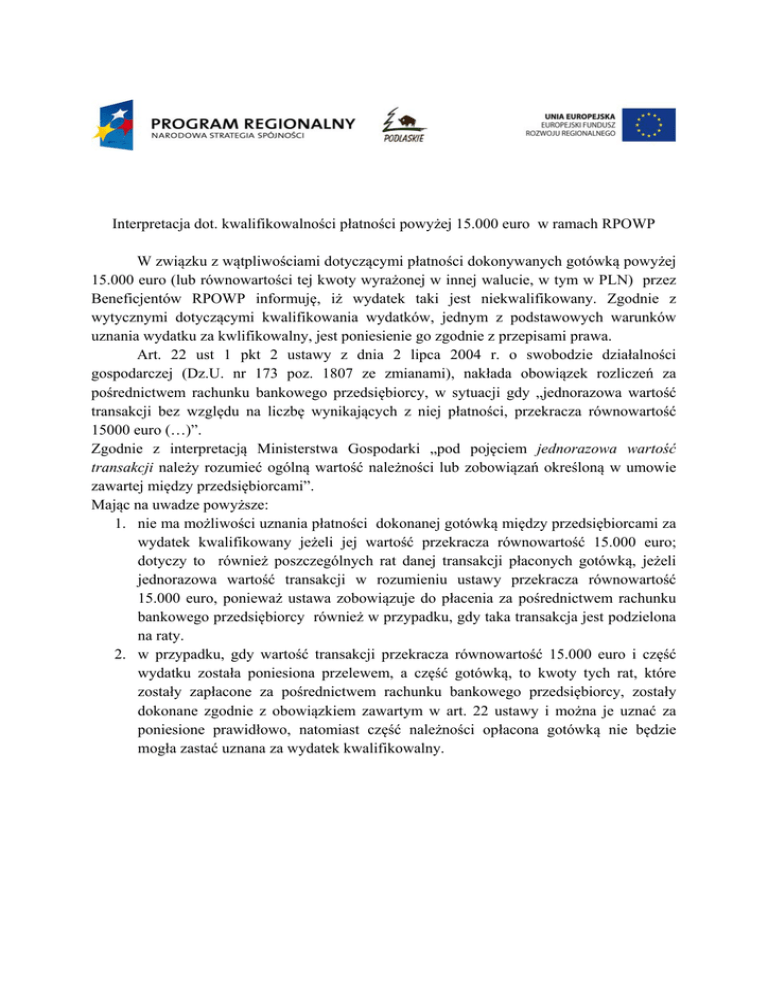 Interpretacja dot. kwalifikowalności płatności powyżej 15.000 euro w ramach RPOWP W związku z wątpliwościami dotyczącymi płatności dokonywanych gotówką powyżej 15.000 euro (lub równowartości tej kwoty wyrażonej w innej walucie, w tym w PLN) przez Beneficjentów RPOWP informuję, iż wydatek taki jest niekwalifikowany. Zgodnie z wytycznymi dotyczącymi kwalifikowania wydatków, jednym z podstawowych warunków uznania wydatku za kwlifikowalny, jest poniesienie go zgodnie z przepisami prawa. Art. 22 ust 1 pkt 2 ustawy z dnia 2 lipca 2004 r. o swobodzie działalności gospodarczej (Dz.U. nr 173 poz. 1807 ze zmianami), nakłada obowiązek rozliczeń za pośrednictwem rachunku bankowego przedsiębiorcy, w sytuacji gdy „jednorazowa wartość transakcji bez względu na liczbę wynikających z niej płatności, przekracza równowartość 15000 euro (…)”. Zgodnie z interpretacją Ministerstwa Gospodarki „pod pojęciem jednorazowa wartość transakcji należy rozumieć ogólną wartość należności lub zobowiązań określoną w umowie zawartej między przedsiębiorcami”. Mając na uwadze powyższe: 1. nie ma możliwości uznania płatności dokonanej gotówką między przedsiębiorcami za wydatek kwalifikowany jeżeli jej wartość przekracza równowartość 15.000 euro; dotyczy to również poszczególnych rat danej transakcji płaconych gotówką, jeżeli jednorazowa wartość transakcji w rozumieniu ustawy przekracza równowartość 15.000 euro, ponieważ ustawa zobowiązuje do płacenia za pośrednictwem rachunku bankowego przedsiębiorcy również w przypadku, gdy taka transakcja jest podzielona na raty. 2. w przypadku, gdy wartość transakcji przekracza równowartość 15.000 euro i część wydatku została poniesiona przelewem, a część gotówką, to kwoty tych rat, które zostały zapłacone za pośrednictwem rachunku bankowego przedsiębiorcy, zostały dokonane zgodnie z obowiązkiem zawartym w art. 22 ustawy i można je uznać za poniesione prawidłowo, natomiast część należności opłacona gotówką nie będzie mogła zastać uznana za wydatek kwalifikowalny.