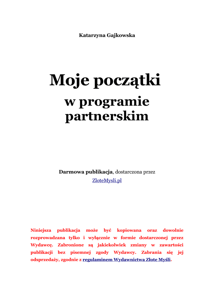Katarzyna Gajkowska Moje początki w programie partnerskim Darmowa publikacja, dostarczona przez ZloteMysli.pl Niniejsza publikacja może być kopiowana oraz dowolnie rozprowadzana tylko i wyłącznie w formie dostarczonej przez Wydawcę. Zabronione publikacji bez są pisemnej jakiekolwiek zgody zmiany Wydawcy. w zawartości Zabrania się odsprzedaży, zgodnie z regulaminem Wydawnictwa Złote Myśli. jej © Copyright for Polish edition by Katarzyna Gajkowska & ZloteMysli.pl Data: 20.05.2007 Tytuł: Moje początki w programie partnerskim Autor: Katarzyna Gajkowska Wydanie II (uzupełnione) Korekta: Sylwia Fortuna Skład: Anna Popis-Witkowska Niniejsza publikacja może być kopiowana oraz dowolnie rozprowadzana tylko i wyłącznie w formie dostarczonej przez Wydawcę. Zabronione publikacji bez są pisemnej jakiekolwiek zgody zmiany Wydawcy. w zawartości Zabrania się odsprzedaży, zgodnie z regulaminem Wydawnictwa Złote Myśli. Dystrybucja w Internecie, za zgodą Autora Internetowe Wydawnictwo Złote Myśli Nwtina Sp. z o. o. ul. Daszyńskiego 5 44-100 Gliwice WWW: www.ZloteMysli.pl EMAIL: [email protected] Wszelkie prawa zastrzeżone. All rights reserved. jej SPIS TREŚCI CZĘŚĆ I.....................................................................................................................4 WSTĘP.......................................................................................................................5 CO TO JEST PROGRAM PARTNERSKI?.....................................................................7 JAK TWORZYŁAM SWOJĄ PIERWSZĄ WŁASNĄ STRONĘ INTERNETOWĄ............9 JAK UCZYŁAM SIĘ ROBIĆ LINKI PARTNERSKIE ..................................................12 CO TO JEST MASKOWANIE LINKÓW PARTNERSKICH I PO CO SIĘ TO ROBI?......14 JAK POZNAŁAM AUTORESPONDER I ZROZUMIAŁAM JEGO DZIAŁANIE.......................................................................16 MOJE PIERWSZE ROZMOWY NA FORUM Z INNYMI PARTNERAMI.........................................................................................19 CIĄGŁY BRAK REZULTATÓW MOICH DZIAŁAŃ POWODEM ZWĄTPIENIA..........21 REKLAMA DŹWIGNIĄ HANDLU – TAK MÓWIĄ....................................................23 EFEKTY SPRZEDAŻY PODOBNO PODNOSI MUZYKA NA STRONIE.......................25 JAK ZAŁOŻYŁAM SWÓJ PIERWSZY W ŻYCIU BLOG.............................................27 JAK ZAINSTALOWAĆ MAILERA.............................................................................29 JAK UMIEŚCIĆ ZDJĘCIA NA STRONIE WWW........................................................33 MOJE PIERWSZE SUKCESY....................................................................................35 ZAKOŃCZENIE........................................................................................................36 CZĘŚĆ II..................................................................................................................40 JAK KOLEJNY RAZ CHCIAŁAM „UPIEC DWIE PIECZENIE NA JEDNYM OGNIU” .41 MOJA WIARA W SUKCES I KREATYWNE PODEJŚCIE DO ŻYCIA NIE WYSTARCZA....................................................................................................44 LEKTUROMANIA....................................................................................................45 PIERWSZY „GENIALNY” POMYSŁ..........................................................................49 DRUGI POMYSŁ: LINK 24.PL..................................................................................50 ZRÓB SOBIE MOTYWUJĄCY WYKRES EFEKTÓW..................................................51 MOJA PRACA Z PORADNIKIEM „ZOSTAŃ SUPERPARTNEREM”..........................54 BIULETYN REBEKI.................................................................................................56 MOJE FORUM ZACZYNA ŻYĆ WŁASNYM ŻYCIEM.................................................58 ZAKOŃCZENIE........................................................................................................59 CZĘŚĆ I MOJE POCZĄTKI W PROGRAMIE PARTNERSKIM Katarzyna Gajkowska ● str. 5 Wstęp Brakuje Ci pieniędzy do pierwszego? Chciałabyś zacząć zarabiać w Internecie? Zrób to! Polecam Ci programy partnerskie. Postanowiłam napisać tego ebooka dla osób, które tak jak ja pragnąc zmienić swoje życie, weszły do programu partnerskiego lub dopiero zamierzają to zrobić. Ja weszłam spontanicznie, nie zastanawiając się zbyt mocno, czy potrafię. To trochę tak, jakbym rzuciła się na głęboką wodę, ale moja przyjaciółka twierdzi, że tylko tak można nauczyć się czegoś nowego, kiedy trzeba podjąć wyzwanie. Kim jestem? Jestem zwykłą kobietą, choć ostatnio staram się myśleć o sobie, że niezwykłą. Po wielu nieciekawych przejściach osobistych znalazłam się w takim momencie mojego życia, że mam dwie drogi przed sobą. Albo poddać się i popaść w depresję, albo podjąć wyzwanie i walczyć. Samotnie wychowuję dwóch dorastających synów, którzy zjadają całą moją budżetową pensję. Żeby móc jakoś funkcjonować, muszę podjąć wyzwanie. Nigdy wcześniej nie miałam do czynienia z informatyką w takim zakresie. Obsługa komputera w stopniu podstawowym to wszystko, co potrafiłam. Dlatego próbowałam dowiedzieć się czegoś więcej zanim zacznę. Ale to okazało się niezwykle trudne. Ponieważ jestem z zawodu bibliotekarzem, mam nawyk sięgania do różnych źródeł informacji, aby uzyskać potrzebne dane. Oczywiście najpierw zajrzałam do podręczników informatycznych, po których prawie popadłam w depresję. Mam wrażenie, że większość publikacji jest pisana przez informatyków dla jednej kategorii osób - innych Copyright by Złote Myśli & Katarzyna Gajkowska MOJE POCZĄTKI W PROGRAMIE PARTNERSKIM Katarzyna Gajkowska ● str. 6 informatyków mniej douczonych. Przepraszam, ale takie jest moje zdanie. Amator, który próbuje odnaleźć w nich pomocną dłoń, może się tyl