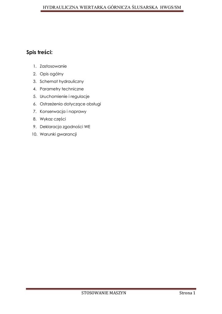 HYDRAULICZNA WIERTARKA GÓRNICZA ŚLUSARSKA HWGS/SM Spis treści: 1. Zastosowanie 2. Opis ogólny 3. Schemat hydrauliczny 4. Parametry techniczne 5. Uruchomienie i regulacje 6. Ostrzeżenia dotyczące obsługi 7. Konserwacja i naprawy 8. Wykaz części 9. Deklaracja zgodności WE 10. Warunki gwarancji STOSOWANIE MASZYN Strona 1 HYDRAULICZNA WIERTARKA GÓRNICZA ŚLUSARSKA HWGS/SM 1.Zastosowanie Hydrauliczna wiertarka górnicza ślusarska typu HWGS/SM, produkowana w trzech wielkościach przeznaczona jest do ręcznego wiercenia otworów za pomocą typowych wierteł do metalu. Przeznaczona jest do wykonywania prac ślusarskich w kopalniach. Napęd wiertarki stanowi silnik hydrauliczny charakteryzujący się specjalnym wykonaniem zapewniającym długotrwałą pracę przy zasilaniu go cieczami wodno-pochodnymi (np. niskoprocentową emulsją wodno-olejową). Wiertarka HWGS/SM może pracować w przestrzeniach zagrożonych wybuchem . 2.Opis ogólny Wiertarka HWGS/SM składa się z następujących podzespołów: (rys.1) 1. Silnik hydrauliczny 2. Uchwyt wiertła - SM 0,4 – ø13 - SM 0,5 – ø16 - SM 0,7 – stożek MORSEA nr 3 3. Rękojeść wiertarki 4. Przyłącze hydrauliczne z zaworem sterowania 5. Śruba regulacji obrotów 6. Uchwyt – manetka sterowania Strona 2 STOSOWANIE MASZYN HYDRAULICZNA WIERTARKA GÓRNICZA ŚLUSARSKA HWGS/SM Rys.1 HWGS wielkość SM 0,4 ; HWGS wielkość SM 0,5 Rys.1 Rys.2 HWGS wielkość SM 0,7 Rys.2 STOSOWANIE MASZYN Strona 3 HYDRAULICZNA WIERTARKA GÓRNICZA ŚLUSARSKA HWGS/SM 3.Schemat hydrauliczny Rys.3 1. Magistrala zasilająca 2. Magistrala spływowa 3. Zawór odcinający 4. Przewód zasilający ø10 Stecko 5. Zawór sterujący 6. Silnik hydrauliczny 7. Przewód odpływowy ø10 Stecko 4.Parametry techniczne wiertarek typu HWGS/SM WIELKOŚCI CHARAKTERYSTYCZNE HWGS/SM j.m SM 0,4 SM 0,5 Ciśnienie nominalne MPa do 25 Ciśnienie maksymalne MPa do 28 Prędkość obrotowa obr./min Moment obrotowy przy ciśnieniu 22 MPa Nm Maksymalna średnica wiertła Chłonność przy 400 obr. 5 ÷800 25 38 80 mm 13 16 20 l/min 4,3 7,5 13 emulsja wodno-olejowa do 0,3% oleje Ciecz zasilająca Filtracja µ Ciężar HWGS/SM kg Strona 4 5 ÷1500 SM 0,7 100 3,8 STOSOWANIE MASZYN 4,2 6 HYDRAULICZNA WIERTARKA GÓRNICZA ŚLUSARSKA HWGS/SM Silnik hydrauliczny wiertarki przystosowany jest do zasilania go różnymi rodzajami cieczy : ⇒ niskoprocentowymi emulsjami wodno – olejowymi HFA (min.0,3% oleju w wodzie) ⇒ olejami mineralnymi i roślinnymi ⇒ olejami hydraulicznymi i maszynowymi ⇒ innymi cieczami hydraulicznymi 5.Uruchomienie i regulacja Wiertarkę mogą obsługiwać osoby zapoznane z niniejszą instrukcją oraz zaznajomione z ogólnymi zasadami obsługi urządzeń hydraulicznych wysokociśnieniowych. Wiertarkę należy podłączyć typowymi przewodami hydraulicznymi ø10 z magistrali zasilającej poprzez zawór odcinający. Przewód zasilający i odpływowy należy przyłączyć odpowiednio do przyłącza dopływu-odpływu, zgodnie ze strzałką kierunku przepływu. Końcówki przewodów ciśnieniowych muszą mieć ciasno osadzone przetyczki blokujące. DOTYCZY WIERTARKI HWGS/SM 0,7 ♦Przy ciśnieniu zasilania do16 MPa wiertarkę może obsługiwać jedna osoba. ♦Przy ciśnieniu przekraczającym 16 MPa, ze względu na wysoki moment obrotowy, wiertarka powinna być obsługiwana przez dwie osoby. 6.Ostzeżenia dotyczące obsługi Ostrzeżenie ! W przypadku zablokowania wiertła w otworze i wypuszczeniu wiertarki z rąk operatora, przy niesprawnym zaworze załączającym, może dojść do uszkodzenia ciała operatora znajdującego się w polu obrotu kierownicy wiertarki. Istnieje również niebezpieczeństwo zaplątania operatora lub osób towarzyszących przewodami hydraulicznymi. Szczególnie niebezpieczne może być zaplątanie przewodami w okolicach szyi. Celem zapobieżenia takim sytuacjom podczas wiercenia należy zapewnić możliwość wyłączania wiertarki zaworem odcinającym przez drugą osobę towarzyszącą przy wierceniu. STOSOWANIE MASZYN Strona 5 HYDRAULICZNA WIERTARKA GÓRNICZA ŚLUSARSKA HWGS/SM Niedozwolone jest ! Używanie wiertaki hydraulicznej mającej: niesprawny układ sterujący uszkodzone przewody hydrauliczne nieszczelny silnik hydrauliczny ciśnienie zasilania większe niż podane w charakterystyce technicznej wiertarki, oraz na tabliczce znamionowej Uwaga ! 1. Przed odłączeniem przewodów hydraulicznych należy zamknąć zawór odcinający i rozładować ciśnienie w urządzeniu poprzez załączenie wiertarki. 2. Zabroniona jest praca wiertarką przy wyższym ciśnieniu zasilania z powodu przekroczenia dopuszczalnych sił momentu obrotowego wiertarki działających na ręce operatora. Takie przeciążenie może nastąpić na przykład przy niespodziewanym zakleszczeniu wiertła w otworze. 3. Jeżeli w sieci zasilającej jest lub może być większe ciśnienie od nominalnego dla wiertarki, należy zastosować zawór redukcyjny ciśnienia. 4. Przy pracy wiertarką należy stosować okulary ochronne. Charakterystyka wibro - akustyczna Poziom hałasu emitowanego przez wiertarkę HWGS nie przekracza wartości 70 dB(A). 7. Konserwacja i naprawy Przy przewidzianych dłuższych przestojach wiertarki (kilka dni) należy silnik wiertarki zalać olejem hydraulicznym lub inną cieczą konserwacyjną. W tym celu należy obracając uchwytem wiertła wiertarki wlewać poprzez jedno z przyłączy hydraulicznych ciecz konserwującą do momentu wypłynięcia jej drugim przyłączem. Wiertarka posiada prostą konstrukcję i jej naprawę polegającą na wymianie uszkodzonych lub zużytych części może wykonać za pomocą typowych narzędzi ślusarskich osoba posiadająca podstawowe kwalifikacje ślusarza. Nie zaleca się demontażu i naprawy silnika hydraulicznego wiertarki. Naprawa taka powinna być wykonana w serwisie producenta. Producent nie ponosi odpowiedzialności za naprawy przeprowadzone przez użytkownika wiertarki. INFORMACJA Rozwiązanie konstrukcyjne s
