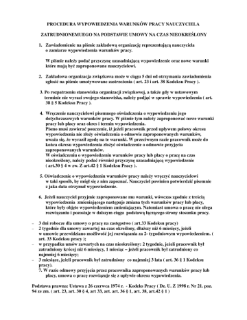 PROCEDURA WYPOWIEDZENIA WARUNKÓW PRACY NAUCZYCIELA ZATRUDNIONEMUEGO NA PODSTAWIE UMOWY NA CZAS NIEOKREŚLONY 1. Zawiadomienie na piśmie zakładową organizację reprezentującą nauczyciela o zamiarze wypowiedzenia warunków pracy. W piśmie należy podać przyczynę uzasadniającą wypowiedzenie oraz nowe warunki które mają być zaproponowane nauczycielowi. 2. Zakładowa organizacja związkowa może w ciągu 5 dni od otrzymania zawiadomienia zgłosić na piśmie umotywowane zastrzeżenia ( art. 23 i art. 38 Kodeksu Pracy ). 3. Po rozpatrzeniu stanowiska organizacji związkowej, a także gdy w ustawowym terminie nie wyrazi swojego stanowiska, należy podjąć w sprawie wypowiedzenia ( art. 38 § 5 Kodeksu Pracy ). 4. Wręczenie nauczycielowi pisemnego oświadczenia o wypowiedzeniu jego dotychczasowych warunków pracy. W piśmie tym należy zaproponować nowe warunki pracy lub płacy oraz okres i termin wypowiedzenia. Pismo musi zawierać pouczenie, iż jeżeli pracownik przed upływem połowy okresu wypowiedzenia nie złoży oświadczenia o odmowie zaproponowanych warunków, uważa się, że wyraził zgodę na te warunki. W przeciwnym razie pracownik może do końca okresu wypowiedzenia złożyć oświadczenie o odmowie przyjęcia zaproponowanych warunków. W oświadczeniu o wypowiedzeniu warunków pracy lub płacy o pracę na czas nieokreślony, należy podać również przyczynę uzasadniającą wypowiedzenie ( art.30 § 4 w zw. Z art.42 § 1 Kodeksu Pracy ). 5. Oświadczenie o wypowiedzeniu warunków pracy należy wręczyć nauczycielowi w taki sposób, by mógł się z nim zapoznać. Nauczyciel powinien potwierdzić pisemnie z jaka data otrzymał wypowiedzenie. 6. Jeżeli nauczyciel przyjmie zaproponowane mu warunki, wówczas zgodnie z treścią wypowiedzenia zmieniającego następuje zmiana tych warunków pracy lub płacy, które były objęte wypowiedzeniem zmieniającym. Natomiast umowa o pracę nie ulega rozwiązaniu i pozostaje w dalszym ciągu podstawą łączącego strony stosunku pracy. − − − − 3 dni robocze dla umowy o pracę na zastępstwo ( art.33 Kodeksu pracy) 2 tygodnie dla umowy zawartej na czas określony, dłuższy niż 6 miesięcy, jeżeli w umowie przewidziano możliwość jej rozwiązania za 2- tygodniowym wypowiedzeniem. ( art. 33 Kodeksu pracy ); w przypadku umów zawartych na czas nieokreślony: 2 tygodnie, jeżeli pracownik był zatrudniony krócej niż 6 miesięcy, 1 miesiąc – jeżeli pracownik był zatrudniony co najmniej 6 miesięcy; 3 miesiące, jeżeli pracownik był zatrudniony co najmniej 3 lata ( art. 36 § 1 Kodeksu pracy). 7. W razie odmowy przyjęcia przez pracownika zaproponowanych warunków pracy lub płacy, umowa o pracę rozwiązuje się z upływie okresu wypowiedzenia. Podstawa prawna: Ustawa z 26 czerwca 1974 r. - Kodeks Pracy ( Dz. U. Z 1998 r. Nr 21. poz. 94 ze zm. ( art. 23, art. 30 § 4, art 33, art. art. 36 § 1, art. 38, art.42 § 1 )