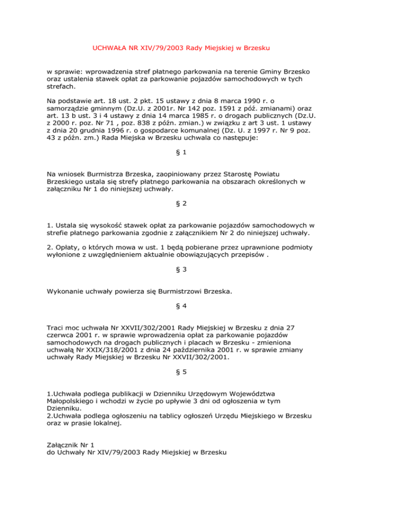 UCHWAŁA NR XIV/79/2003 Rady Miejskiej w Brzesku w sprawie: wprowadzenia stref płatnego parkowania na terenie Gminy Brzesko oraz ustalenia stawek opłat za parkowanie pojazdów samochodowych w tych strefach. Na podstawie art. 18 ust. 2 pkt. 15 ustawy z dnia 8 marca 1990 r. o samorządzie gminnym (Dz.U. z 2001r. Nr 142 poz. 1591 z póź. zmianami) oraz art. 13 b ust. 3 i 4 ustawy z dnia 14 marca 1985 r. o drogach publicznych (Dz.U. z 2000 r. poz. Nr 71 , poz. 838 z późn. zmian.) w związku z art 3 ust. 1 ustawy z dnia 20 grudnia 1996 r. o gospodarce komunalnej (Dz. U. z 1997 r. Nr 9 poz. 43 z późn. zm.) Rada Miejska w Brzesku uchwala co następuje: §1 Na wniosek Burmistrza Brzeska, zaopiniowany przez Starostę Powiatu Brzeskiego ustala się strefy płatnego parkowania na obszarach określonych w załączniku Nr 1 do niniejszej uchwały. §2 1. Ustala się wysokość stawek opłat za parkowanie pojazdów samochodowych w strefie płatnego parkowania zgodnie z załącznikiem Nr 2 do niniejszej uchwały. 2. Opłaty, o których mowa w ust. 1 będą pobierane przez uprawnione podmioty wyłonione z uwzględnieniem aktualnie obowiązujących przepisów . §3 Wykonanie uchwały powierza się Burmistrzowi Brzeska. §4 Traci moc uchwała Nr XXVII/302/2001 Rady Miejskiej w Brzesku z dnia 27 czerwca 2001 r. w sprawie wprowadzenia opłat za parkowanie pojazdów samochodowych na drogach publicznych i placach w Brzesku - zmieniona uchwałą Nr XXIX/318/2001 z dnia 24 października 2001 r. w sprawie zmiany uchwały Rady Miejskiej w Brzesku Nr XXVII/302/2001. §5 1.Uchwała podlega publikacji w Dzienniku Urzędowym Województwa Małopolskiego i wchodzi w życie po upływie 3 dni od ogłoszenia w tym Dzienniku. 2.Uchwała podlega ogłoszeniu na tablicy ogłoszeń Urzędu Miejskiego w Brzesku oraz w prasie lokalnej. Załącznik Nr 1 do Uchwały Nr XIV/79/2003 Rady Miejskiej w Brzesku Obszary, na których wprowadza się strefy płatnego parkowania na terenie Gminy Brzesko. Ulice i place: 1. Asnyka 2. Berka Joselewicza 3. Chopina 4. Cicha (plac i ulice) 5. Długa 6. Grunwaldzka 7. Legionów Piłsudskiego 8. Matejki 9. Piłsudskiego 10. Krótka 11. Pl. Targowy (stary) 12. Pl. Zwycięstwa 13. Pl. Żwirki i Wigury 14. pl. k/pl. Kazimierza Wielkiego 15. Puszkina 16. Rynek 17. Słowackiego 18. Sobieskiego 19. Urząd Miejski (od ul. Głowackiego) 20. Wyszyńskiego 21. Zielona Załącznik Nr 2 do Uchwały Nr XIV/79/2003 Rady Miejskiej w Brzesku Wysokość opłat za parkowanie pojazdów samochodowych w strefach płatnego parkowania oraz zasady korzystania z miejsc postojowych w tych strefach. 1.Opłaty pobiera się w dni robocze: a/ od poniedziałku do piątku w godzinach od 8.00 do 16.00 b/ w soboty w godzinach od 8.00 do 13.00 c/ w soboty parking przed Urzędem Miejskim ( poz.19 wykazu), zwolniony jest od opłat. 2. Wysokość opłat. a/ za czas parkowania pojazdu do 30 minut - 0,50 zł b/ za czas parkowania pojazdu do 1 godziny - 1,00 zł c/ za każdą następną rozpoczętą godzinę parkowania - 1,00 zł d/ za miesięczną kartę abonamentową dla pojazdu - 60,00 zł e/ za miesięczną kartę abonamentową dla pojazdów mieszkańców stale zameldowanych w strefie parkingowej mających zarejestrowany samochód na własne nazwisko - 10,00 zł f/ za miesięczną kartę abonamentową dla pojazdów służbowych jednostek organizacyjnych Gminy Brzesko oraz jednostek organizacyjnych służb, inspekcji i straży powiatu brzeskiego w wysokości - 20,00 zł g/ za zastrzeżenie wydzielonego stanowiska postojowego (koperty) w wyznaczonym miejscu - 150,00 zł miesięcznie h/ za jednorazowe parkowanie pojazdu przez kombatanta posiadającego stosowny identyfikator oraz przez motocyklistów: -do 30 minut-0,25 zł -do 1 godz.-0,50 zł -za każdą następną rozpoczętą godz. parkowania-0,50 zł -za miesięczny abonament-30,00 zł -za zastrzeżenie wydzielonego stanowiska postojowego (koperty) w wyznaczonym miejscu-75,00 zł miesięcznie i/ pojazdy służb komunalnych posiadających stosowne identyfikatory oraz pojazdy oznaczone międzynarodowym symbolem wózka inwalidzkiego- zerowa stawka . 3. Zasady pobierania opłat. 1. Pobieranie opłat dokonywane będzie przez parkingowych 2. Karta półgodzinna służy do opłacania postoju nie dłuższego niż 1/2 godziny 3. Do opłacania czasu postoju dłuższego niż pół godziny służy karta jednogodzinna, lub zestaw kart jedno, lub półgodzinnych, przy czym każdą kolejną kartę w w zestawie należy skasować przez zaznaczenie czasu wygaśnięcia ważności karty poprzedniej. 4. W ramach czasu oznaczonego na karcie (lub zestawie kart), można zmienić miejsce postoju 5. Za nie uiszczenie opłaty pobiera się opłatę dodatkową w wysokości 50 zł. 6. Od opłat zwolnione są pojazdy (wyszczególnione w art. 13 ust.1 pkt. 3 uodp) tj: - pojazdy: a) Policji, Inspekcji Transportu Drogowego, Agencji Bezpieczeństwa Wewnętrznego, Agencji Wywiadu, Państwowej Straży Pożarnej, jednostek ochrony przeciwpożarowej, Straży Granicznej, pogotowia ratunkowego, Służby Więziennej, Służby Celnej, b) zarządów dróg, c) Sił Zbrojnych Rzeczypospolitej Polskiej, d) wykorzystywane w ratownictwie, lub w przypadku klęski żywiołowej, - autobusy szkolne przewożące dzieci do szkoły. 7. Sprzedaż kart dla wydzielonego stanowiska postojowego (koperty) w wyznaczonym miejscu odbywać się będzie w Urzędzie Miejskim w Brzesku, natomiast karty abonamentowe wydawane będą przez Dzierżawcę parkingów 8. O wydaniu identyfikatorów do bezpłatnego parkowania oraz abonamentów określonych w pkt. 6. 3 decyduje Burmistrz Brzeska 9. Wydzielone stanowiska postojowe (koperty) stanowić mogą liczbę nie więcej niż 20% miejsc postojowych w ciągu ulicznym 10. Wykupienie karty abonamentowej nie uprawnia do zastrzegania stałego miejsca postoju i nie stanowi podstawy do roszczeń wobec parkingowego (lub Urzędu) w przypadku braku miejsc postojowych 11. Karty postojowe, karty abonamentowe i iden