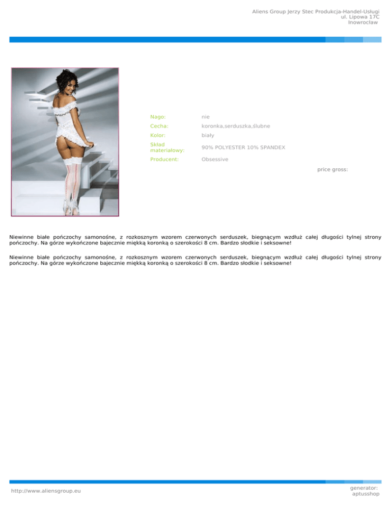 Aliens Group Jerzy Stec Produkcja-Handel-Usługi ul. Lipowa 17C Inowrocław Nago: nie Cecha: koronka,serduszka,ślubne Kolor: biały Skład materiałowy: 90% POLYESTER 10% SPANDEX Producent: Obsessive price gross: Niewinne białe pończochy samonośne, z rozkosznym wzorem czerwonych serduszek, biegnącym wzdłuż całej długości tylnej strony pończochy. Na górze wykończone bajecznie miękką koronką o szerokości 8 cm. Bardzo słodkie i seksowne! Niewinne białe pończochy samonośne, z rozkosznym wzorem czerwonych serduszek, biegnącym wzdłuż całej długości tylnej strony pończochy. Na górze wykończone bajecznie miękką koronką o szerokości 8 cm. Bardzo słodkie i seksowne! http://www.aliensgroup.eu generator: aptusshop