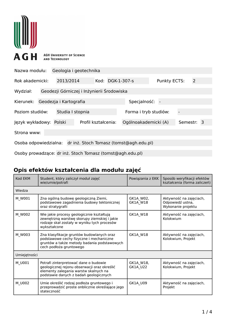 Nazwa modułu: Rok akademicki: Wydział: Kierunek: Geologia i geotechnika 2013/2014 Kod: DGK-1-307-s Punkty ECTS: 2 Geodezji Górniczej i Inżynierii Środowiska Geodezja i Kartografia Poziom studiów: Specjalność: Studia I stopnia Język wykładowy: Polski Profil kształcenia: - Forma i tryb studiów: Ogólnoakademicki (A) Semestr: 3 Strona www: Osoba odpowiedzialna: dr inż. Stoch Tomasz ([email protected]) Osoby prowadzące: dr inż. Stoch Tomasz ([email protected]) Opis efektów kształcenia dla modułu zajęć Kod EKM Student, który zaliczył moduł zajęć wie/umie/potrafi Powiązania z EKK Sposób weryfikacji efektów kształcenia (forma zaliczeń) M_W001 Zna ogólną budowę geologiczną Ziemi, podstawowe zagadnienia budowy tektonicznej oraz stratygrafii GK1A_W02, GK1A_W18 Aktywność na zajęciach, Odpowiedź ustna, Wykonanie projektu M_W002 Wie jakie procesy geologicznie kształtują zewnętrzną warstwę skorupy ziemskiej i jakie rodzaje skał zostały w wyniku tych procesów wykształcone GK1A_W18 Aktywność na zajęciach, Kolokwium M_W003 Zna klasyfikacje gruntów budowlanych oraz podstawowe cechy fizyczne i mechaniczne gruntów a także metody badania podstawowych cech podłoża gruntowego GK1A_W18 Aktywność na zajęciach, Kolokwium, Projekt M_U001 Potrafi zinterpretować dane o budowie geologicznej rejonu obserwacji oraz określić elementy zalegania warstw skalnych na podstawie danych z badań geologicznych GK1A_W18, GK1A_U22 Aktywność na zajęciach, Kolokwium, Projekt M_U002 Umie określić rodzaj podłoża gruntowego i przeprowadzić proste onblicznie określające jego stateczność GK1A_U09 Aktywność na zajęciach, Projekt Wiedza Umiejętności 1/4 Karta modułu - Geologia i geotechnika Matryca efektów kształcenia w odniesieniu do form zajęć Zajęcia praktyczne - - + - - - - - - - M_W002 Wie jakie procesy geologicznie kształtują zewnętrzną warstwę skorupy ziemskiej i jakie rodzaje skał zostały w wyniku tych procesów wykształcone + - - + - - - - - - - M_W003 Zna klasyfikacje gruntów budowlanych oraz podstawowe cechy fizyczne i mechaniczne gruntów a także metody badania podstawowych cech podłoża gruntowego + - - + - - - - - - - M_U001 Potrafi zinterpretować dane o budowie geologicznej rejonu obserwacji oraz określić elementy zalegania warstw skalnych na podstawie danych z badań geologicznych - - - + - - - - - - - M_U002 Umie określić rodzaj podłoża gruntowego i przeprowadzić proste onblicznie określające jego stateczność - - - + - - - - - - - E-learning Zajęcia seminaryjne + Zajęcia Konwersatori um Zna ogólną budowę geologiczną Ziemi, podstawowe zagadnienia budowy tektonicznej oraz stratygrafii Zajęcia terenowe Ćwiczenia projektowe M_W001 Inne Ćwiczenia laboratoryjne Forma zajęć Ćwiczenia audytoryjne Student, który zaliczył moduł zajęć wie/umie/potrafi Wykład Kod EKM Wiedza Umiejętności Treść modułu zajęć (program wykładów i pozostałych zajęć) Wykład Wstęp do geologii i geotechniki Wprowadzenie do zajęć z przedmiotu “geologia i geotechnika”, definicje podstawowych pojeć oraz przekrojowy opis zagadnień poruszanych na wykładach. Przedstawienie literatury przedmiotu oraz wymagań dotyczących jego zaliczenia. Budowa geologiczna Ziemi, procesy endogeniczne i egzogeniczne kształtujące jej powierzchnię, geologiczne dzieje Ziemi i elementy stratygrafii, tektonika i opis ułożenia warstw skalnych w skorupie ziemskiej. Badania geologiczne, geologia poszukiwacza. Grunt budowlany, klasyfikacje gruntów budowlanych, ich właściwości fizyczne, badania terenowe, problemy stateczności podłoża gruntowego i niekorzystne zjawiska 2/4 Karta modułu - Geologia i geotechnika związane z brakiem stateczności podłoża (skarpy i zbocza). Ćwiczenia projektowe Podstawowe skały i minerały budujące skorupę ziemską Przedstawienie podstawowych procesów geologicznych kształtujących wierzchnią warstwę skorupy ziemskiej oraz przedstawienie na tym tle ogólnej budowy litologicznej. Opis podstawowych mienrałów skałotówrczych i podział skał według genezy ich powstania. Dzieje Ziemi, pojęcie osi czasu geologicznego Kształtowanie się skorupy ziemskiej w czasie, wydzielenia jednostek czasu geologicznego. Graficzna prezentacja map stratygraficznych. Budowa tektoniczna oraz elementy zalegania warstw geologicznych Budowa tektoniczna litosfery, przestrzenne zaleganie warstw skalnych oraz metody oznaczenia i zapisu elemetów zalegania. Temat praktyczny do samodzielnego wykonania na mapie. Mapy i przekroje geologiczne, kartowanie geologiczne Omówienie i prezenacja map i przekrojów geologicznych. Zasady kartowania geologicznego warstw geologicznych na podstawie obserwacji naturalnych odłonięć warstw skalnych oraz wyników badań geologicznych. Mapy geologiczno-złożowe. Badania geologiczne dla określenia budowy geologicznej skorupy ziemskiej Omówienie stosowanych w geologii metod badania wierzchnich warstw skorupy ziemskiej w celu opisu budowy geologicznej litosfery. Klasyfikacja gruntów budowlanych i metody ich badania Podział i klasyfikacja gruntów budowlanych wg polskich norm i norm europejskich. Właściwości makroskopowe i fizyczne gruntu budowlanego. Postawowe pojęcia z dziedziny gruntoznawswta. Metody i przyrządy stosowane w badaniach gruntów budowlanych pod względem określenia cech makroskopowych i fizycznych gruntu. Stateczność podłoża gruntowego Omówienie przyczyn braku stateczności podłoża gruntowego oraz prezentacja przykładów niszczącego działania procesów osuwiskowych. Mozliwości badania i zapobiegania osuwaniu się gruntu. Temat praktyczny dotyczacy zagadnień braku stateczności skarp i zboczy w rejonach osuwiskowych. Sposób obliczania oceny końcowej Ocena końcowa jest średnią ważoną ocen z projektów oraz kolokwium zaliczeniowego. Wymagania wstępne i dodatkowe Brak Zalecana literatura i pomoce naukowe 1. Wiłun, Zenon, “Zarys geotechniki” : pod