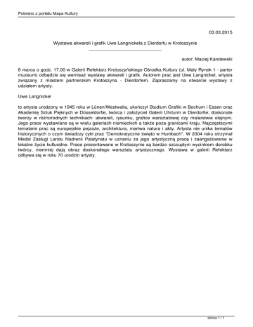 Pobrano z portalu Mapa Kultury 03.03.2015 Wystawa akwareli i grafik Uwe Langnickela z Dierdorfu w Krotoszynie ____________________________ autor: Maciej Karolewski 8 marca o godz. 17.00 w Galerii Refektarz Krotoszyńskiego Ośrodka Kultury (ul. Mały Rynek 1 - parter muzeum) odbędzie się wernisaż wystawy akwareli i grafik. Autorem prac jest Uwe Langnickel, artysta związany z miastem partnerskim Krotoszyna - Dierdorfem. Zapraszamy na otwarcie wystawy z udziałem artysty. Uwe Langnickel to artysta urodzony w 1945 roku w Lünen/Westwalia, ukończył Studium Grafiki w Bochum i Essen oraz Akademię Sztuk Pięknych w Düsseldorfie, twórca i założyciel Galerii Uhrturm w Dierdorfie; doskonale tworzy w różnorodnych technikach: akwareli, rysunku, grafice warsztatowej czy malarstwie olejnym. Jego prace wystawiane są w wielu galeriach niemieckich a także poza granicami kraju. Najczęstszymi tematami prac są europejskie pejzaże, architektura, martwa natura i akty. Artysta nie unika tematów historycznych o czym świadczy cykl prac "Demokratyczne święto w Humbach". W 2004 roku otrzymał Medal Zasługi Landu Nadrenii Palatynatu w uznaniu za jego artystyczną pracę i zaangażowanie w lokalne życie kulturalne. Prace prezentowane w Krotoszynie są bardzo szczupłym wycinkiem dorobku twórcy, niemniej dają obraz doskonałego warsztatu artystycznego. Wystawa w galerii Refektarz odbywa się w roku 70 urodzin artysty. strona 1 / 1