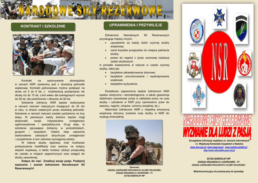 ` KONTRAKT I SZKOLENIE Kontrakt na wykonywanie obowiązków w ramach NSR zawierany jest z dowódcą jednostki wojskowej. Kontrakt jednorazowo można podpisać na okres od 2 do 6 lat, z możliwością powtarzania nie dłużej niż do 15 lat. Limit wieku dla szeregowych wynosi do 50 lat, dla podoficerów i oficerów do 60 lat. Szkolenie żołnierzy NSR będzie realizowane w ramach ćwiczeń rotacyjnych trwających do 30 dni w roku, w dniach ustalonych przez dowódcę jednostki. Szkolenie w ramach ćwiczeń zostało podzielone na trzy etapy. W pierwszym każdy żołnierz będzie mógł doskonalić swoje indywidualne umiejętności ogólnowojskowe i specjalistyczne. Drugi etap, to szkolenie zgrywające żołnierzy w pododdziałach, grupach i zespołach. Ostatni etap zapewnia doskonalenie zdobytych dotychczas umiejętności i uzupełnienie w tym zakresie wymaganej wiedzy. W trakcie służby będziesz miał możliwość podwyższenia kwalifikacji oraz awansu na kolejny stopień wojskowy, a także możesz zdobyć przepustkę do udziału w misjach zagranicznych oraz wstąpić do służby zawodowej. Dołącz do nas! Zrealizuj swoje pasje. Podejmij wyzwanie i zostań żołnierzem Narodowych Sił Rezerwowych! UPRAWNIENIA I PRZYWILEJE Żołnierzom Narodowych Sił Rezerwowych przysługuje między innymi: uposażenie za każdy dzień czynnej służby wojskowej; zwrot kosztów przejazdów do miejsca pełnienia służby; prawo do nagród z tytułu wzorowej realizacji zadań służbowych. A ponadto świadczenia w naturze w czasie czynnej służby, takie jak: bezpłatne zakwaterowanie zbiorowe; bezpłatne umundurowanie i wyekwipowanie wojskowe; bezpłatne wyżywienie. Dodatkowo zapewniona będzie żołnierzom NSR opieka medyczna i stomatologiczna, a także gwarancja stabilności zawodowej (urlop w zakładzie pracy na czas służby i szkolenia w NSR przy zachowaniu praw do awansu, nagród, urlopów, ochrony socjalnej, itp.). Natomiast żołnierzom NSR z niepełną emeryturą wojskową wliczony zostanie czas służby w NSR do wysługi emerytalnej. Szczegółowe informacje znajdziesz na stronach internetowych i w Wojskowej Komendzie Uzupełnień w Radomiu www.mon.gov.pl, www.sgwp.wp.pl , www.wojsko-polskie.pl , http://www.wkuradom.pow.mil.pl SZTAB GENERALNY WP ZARZĄD ORGANIZACJI I UZUPEŁNIEŃ – P1 Opracował: ODDZIAŁ UZUPEŁNIEŃ POKOJOWYCH I SŁUŻBY WOJSKOWEJ ZARZĄD ORGANIZACJI I UZUPEŁNIEŃ – P1 SZTAB GENERALNY WP ODDZIAŁ UZUPEŁNIEŃ POKOJOWYCH I SŁUŻBY WOJSKOWEJ Materiał promocyjny nie przeznaczony do sprzedaży Krok 1. Podejmij decyzję. Sprawdź naszą ofertę 1 000 specjalności. Zrealizuj swoje pasje z nami. i testy. - Przejdź badania lekarskie i psychologiczne. Zgłoś się na kwalifikacje w jednostce wojskowej: o sprawdzian ze sprawności fizycznej; o sprawdzian z kwalifikacji zawodowej; o rozmowa kwalifikacyjna. Krok 2. Poszukaj niezbędnych informacji. Sprawdź akcje promocyjne, strony internetowe (www.mon.gov.pl, www.sgwp.wp.pl,www.wojsko-polskie.pl, stronę internetową WKU w Radomiu – www.wkuradom.pow.mil.pl), odwiedź punkt informacyjny w Wojskowej Komendzie Uzupełnień. POWOŁANIE Krok 5. Zgłoś się we wskazanym miejscu na badania Krok 6. Podpisz kontrakt. Dowódca jednostki wojskowej po pozytywnym zakończeniu procedury kwalifikacyjnej przygotuje kontrakt dla ciebie na wykonywanie obowiązków w ramach Narodowych Sił Rezerwowych. Jeżeli posiadasz polskie obywatelstwo, jesteś żołnierzem rezerwy, masz nieposzlakowaną opinię (niekaralność), wykształcenie i kwalifikacje oraz zdolność psychiczną i fizyczną do pełnienia służby wojskowej, możesz realizować swoje pasje w Narodowych Siłach Rezerwowych. Złóż pisemny wniosek o powołanie do służby w Narodowych Siłach Rezerwowych w Wojskowej Komendzie Uzupełnień w Radomiu dołączając: Zapoznaj się z nim i podpisz. Krok 3. Zgromadź niezbędne dokumenty. W razie wątpliwości kontaktuj się z WKU w Radomiu! Krok 7. Odbierz przydział kryzysowy. Odbierz przydział kryzysowy w Wojskowej Komendzie Uzupełnień w Radomiu. Właśnie zostałeś żołnierzem Narodowych Sił Rezerwowych. Krok 4. Złóż dokumenty we wskazanym miejscu. - Złóż wniosek o powołanie do NSR oraz pozostałe dokumenty. Zapoznaj się z uwarunkowaniami służby w NSR. Poznaj procedury wstąpienia do NSR. Podaj aktualne dane ewidencyjne. Wybierz wolne stanowisko. W razie wątpliwości pytaj - wszystko wyjaśnimy! życiorys; odpis skrócony aktu urodzenia; odpis lub uwierzytelnioną kopię dokumentu stwierdzającego uzyskanie wymaganego wykształcenia oraz zaświadczenie szkoły, w przypadku jeżeli pobierasz naukę; odpis lub kopię uwierzytelnioną świadectwa pracy; kopię posiadanego poświadczenia bezpieczeństwa; aktualną informację z Krajowego Rejestru Karnego; zaświadczenie pracodawcy o zatrudnieniu; inne uwierzytelnione dokumenty mające wpływ na nadanie przydziału kryzysowego, w szczególności potwierdzające posiadanie przygotowania zawodowego oraz szczególnych kwalifikacji lub umiejętności, zaświadczenia o prawie wykonywania zawodu, kwalifikacjach, certyfikaty językowe, itp. WOJSKOWA KOMENDA UZUPEŁNIEŃ W RADOMIU ul. 1905 r. 30 26-600 Radom Tel.: 48 360 13 36, 48 651 11 35 www.wkuradom.pow.mil.pl