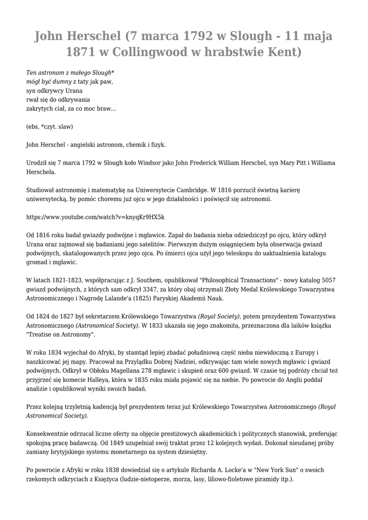 John Herschel (7 marca 1792 w Slough - 11 maja 1871 w Collingwood w hrabstwie Kent) Ten astronom z małego Slough* mógł być dumny z taty jak paw, syn odkrywcy Urana rwał się do odkrywania zakrytych ciał, za co moc braw... (ebs, *czyt. slaw) John Herschel - angielski astronom, chemik i fizyk. Urodził się 7 marca 1792 w Slough koło Windsor jako John Frederick William Herschel, syn Mary Pitt i Williama Herschela. Studiował astronomię i matematykę na Uniwersytecie Cambridge. W 1816 porzucił świetną karierę uniwersytecką, by pomóc choremu już ojcu w jego działalności i poświęcił się astronomii. https://www.youtube.com/watch?v=knyqKr9HX5k Od 1816 roku badał gwiazdy podwójne i mgławice. Zapał do badania nieba odziedziczył po ojcu, który odkrył Urana oraz zajmował się badaniami jego satelitów. Pierwszym dużym osiągnięciem była obserwacja gwiazd podwójnych, skatalogowanych przez jego ojca. Po śmierci ojca użył jego teleskopu do uaktualnienia katalogu gromad i mgławic. W latach 1821-1823, współpracując z J. Southem, opublikował "Philosophical Transactions" - nowy katalog 5057 gwiazd podwójnych, z których sam odkrył 3347, za który obaj otrzymali Złoty Medal Królewskiego Towarzystwa Astronomicznego i Nagrodę Lalande'a (1825) Paryskiej Akademii Nauk. Od 1824 do 1827 był sekretarzem Królewskiego Towarzystwa (Royal Society), potem prezydentem Towarzystwa Astronomicznego (Astronomical Society). W 1833 ukazała się jego znakomita, przeznaczona dla laików książka "Treatise on Astronomy". W roku 1834 wyjechał do Afryki, by stamtąd lepiej zbadać południową część nieba niewidoczną z Europy i naszkicować jej mapy. Pracował na Przylądku Dobrej Nadziei, odkrywając tam wiele nowych mgławic i gwiazd podwójnych. Odkrył w Obłoku Magellana 278 mgławic i skupień oraz 600 gwiazd. W czasie tej podróży chciał też przyjrzeć się komecie Halleya, która w 1835 roku miała pojawić się na niebie. Po powrocie do Anglii poddał analizie i opublikował wyniki swoich badań. Przez kolejną trzyletnią kadencją był prezydentem teraz już Królewskiego Towarzystwa Astronomicznego (Royal Astronomical Society). Konsekwentnie odrzucał liczne oferty na objęcie prestiżowych akademickich i politycznych stanowisk, preferując spokojną pracę badawczą. Od 1849 uzupełniał swój traktat przez 12 kolejnych wydań. Dokonał nieudanej próby zamiany brytyjskiego systemu monetarnego na system dziesiętny. Po powrocie z Afryki w roku 1838 dowiedział się o artykule Richarda A. Locke'a w "New York Sun" o swoich rzekomych odkryciach z Księżyca (ludzie-nietoperze, morza, lasy, liliowo-fioletowe piramidy itp.). W 1864 roku wydał "General Catalague of Nebulae and Clusters of Stars", zawierający wszystkie dotychczas znane (5079) mgławice. Prowadził także prace z optyki i teorii nauk przyrodniczych. Był jednym z pionierów fotografii. Do fotografii wprowadził takie terminy jak: negatyw, pozytyw i przede wszystkim samą nazwę dziedziny - fotografia. Odkrył tiosiarczan sodu, wynalazł cyjanotypię. Odkrył zjawisko nazwane zjawiskiem Herschela. Zmarł 11 maja 1871 w Collingwood w pobliżu Hawkhurst w hrabstwie Kent. Został pochowany w opactwie westminsterskim obok Isaaca Newtona. Po śmierci uznano go za największego naukowca stulecia. W wielu miejscach na Ziemi i w Kosmosie można znaleźć nazwisko "Herschel". https://www.youtube.com/watch?v=KpVe6HczKAo "Dla mnie najbardziej przyjemne byłoby oglądanie niewidocznej strony księżyca."
