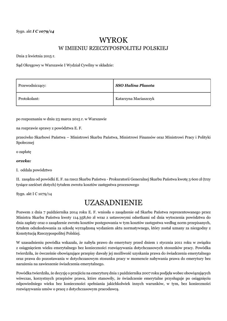 Sygn. akt I C 1079/14 WYROK W IMIENIU RZECZYPOSPOLITEJ POLSKIEJ Dnia 2 kwietnia 2015 r. Sąd Okręgowy w Warszawie I Wydział Cywilny w składzie: Przewodniczący: SSO Halina Plasota Protokolant: Katarzyna Maciaszczyk po rozpoznaniu w dniu 23 marca 2015 r. w Warszawie na rozprawie sprawy z powództwa E. F. przeciwko Skarbowi Państwa – Ministrowi Skarbu Państwa, Ministrowi Finansów oraz Ministrowi Pracy i Polityki Społecznej o zapłatę orzeka: I. oddala powództwo II. zasądza od powódki E. F. na rzecz Skarbu Państwa - Prokuratorii Generalnej Skarbu Państwa kwotę 3 600 zł (trzy tysiące sześćset złotych) tytułem zwrotu kosztów zastępstwa procesowego Sygn. akt I C 1079/14 UZASADNIENIE Pozwem z dnia 7 października 2014 roku E. F. wniosła o zasądzenie od Skarbu Państwa reprezentowanego przez Ministra Skarbu Państwa kwoty 114.358,60 zł wraz z ustawowymi odsetkami od dnia wytoczenia powództwa do dnia zapłaty oraz o zasądzenie zwrotu kosztów postępowania w tym kosztów zastępstwa według norm przepisanych, tytułem odszkodowania za szkodę wyrządzoną wydaniem aktu normatywnego, który został uznany za niezgodny z Konstytucją Rzeczypospolitej Polskiej. W uzasadnieniu powódka wskazała, że nabyła prawo do emerytury przed dniem 1 stycznia 2011 roku w związku z osiągnięciem wieku emerytalnego bez konieczności rozwiązywania dotychczasowych stosunków pracy. Powódka twierdziła, że ówcześnie obowiązujące przepisy dawały jej możliwość uzyskania prawa do świadczenia emerytalnego oraz prawa do pozostawania w dotychczasowym stosunku pracy w momencie nabywania prawa do emerytury bez narażenia na zawieszenie świadczenia emerytalnego. Powódka twierdziła, że decyzję o przejściu na emeryturę dnia 1 października 2007 roku podjęła wobec obowiązujących wówczas, korzystnych przepisów prawa, które stanowiły, że świadczenie emerytalne przysługuje po osiągnięciu odpowiedniego wieku bez konieczności spełniania jakichkolwiek innych warunków, w tym, bez konieczności rozwiązywania umów o pracę z dotychczasowym pracodawcą. Powódka wskazała, że w związku z wejściem w życie dnia 1 stycznia 2011 roku art. 6 oraz art. 28 ustawy z dnia 16 grudnia 2010 roku o zmianie ustawy o finansach publicznych oraz niektórych innych ustaw ponownie nie mogła jednocześnie pobierać przyznanej jej emerytury i pozostawać w stosunku pracy z pracodawcą, na rzecz którego praca była wykonywana bezpośrednio przed dniem nabycia prawa do emerytury. Powódka w uzasadnieniu pozwu wskazała, że wobec niekorzystnej nowelizacji prawa, która de facto wymusiła na niej wybór między pobieraniem świadczenia a pobieraniem wynagrodzenia z tytułu dotychczas zawartej umowy o pracę, dnia 30 czerwca 2010 roku oraz dnia 30 września 2010 roku zmuszona została rozwiązać stosunki pracy z dotychczasowymi pracodawcami celem umożliwienia jednoczesnego pobierania w przyszłości świadczenia emerytalnego oraz pozostawania osobą aktywną zawodowo. Brak rozwiązania umów o pracę skutkowałby zawieszeniem prawa do emerytury. Powódka jednocześnie wskazała, że gdyby w momencie złożenia wniosku do organu rentowego wiedziała, iż będzie zmuszona przerwać zatrudnienie, aby uzyskać świadczenie, nie przeszłaby na emeryturę, gdyż nie byłoby to dla niej korzystne. Powódka wskazała, że po rozwiązaniu stosunków pracy nie miała możliwości powrotu na dotychczasowe stanowiska pracy i dnia 3 października 2011 roku nawiązała z Urzędem Miejskim Gminy R. stosunek zlecenia, z tytułu którego pobierała miesięczne wynagrodzenie w dwukrotnie niższej niż poprzednio wysokości. Następnie Trybunał Konstytucyjny z dnia 13 listopada 2012 roku (sygn. akt K 2/12), orzekł, że art. 28 ustawy z dnia 16 grudnia 2010 roku o zmianie ustawy o finansach publicznych oraz niektórych innych ustaw w związku z art. 103a ustawy o emeryturach i rentach z Funduszu Ubezpieczeń Społecznych w zakresie, w jakim znajduje zastosowanie do osób, które nabyły prawo do emerytury przed dniem 1 stycznia 2011 roku bez konieczności rozwiązania stosunku pracy, jest niezgodny z zasadą ochrony zaufania obywatela do państwa i stanowionego przez nie prawa wynikającą z art. 2 Konstytucji Rzeczypospolitej Polskiej. Powódka wskazała, że wskutek wprowadzenia niekorzystnych przepisów, które następnie zostały częściowo uznane za niezgodne z Konstytucją, poniosła szkodę, która polega na tym, że nie mogła kontynuować zatrudnienia u dotychczasowych pracodawców i osiągnąć z tego tytułu należnego wynagrodzenia jednocześnie pobierając emeryturę bez rozwiązywania dotychczasowych umów o pracę. Jako podstawę prawną wskazała art. 417 § 1 k.c w zw. z art. 4171 § 1 k.c. W uzasadnieniu pozwu powódka twierdziła, że szkodę w zakresie lucrum cessans poniosła w okresie od dnia 1 października 2011 roku do dnia 30 września 2013 roku, w związku z zastosowaniem się do uchylonych później przepisów, w wysokości 114.358,60 zł, a składały się na nią następujące kwoty: 1. tytułem utraconych korzyści w związku z koniecznością rozwiązania dnia 30 września 2010 roku stosunku pracy z Urzędem Miejskim Gminy R. i nawiązania zeń umowy zlecenie: 66.844,80 zł, tytułem różnicy między osiągniętą w tym czasie sumą miesięcznego wynagrodzenia, a wysokością zarobku, jaki osiągnęłaby pozostając w stosunku pracy; a) 16.710,60 zł, tytułem utraconej korzyści w postaci niewypłacenia nagrody jubileuszowej za 40-letni staż pracy, jaką otrzymałaby pozostając w stosunku pracy; b) 11.363,20 zł, tytułem utraconych korzyści w postaci nieotrzymania dodatkowego wynagrodzenia („13 pensji”) za lata 2011-2013; 2. tytułem utraconych korzyści w związku z koniecznością rozwiązania dnia 30 czerwca 2010 roku stosunku pracy ze spółką Gospodarstwo Rolne (...) sp. z o.o. tj. kwotę 19.440,00 zł brutto tytułem niewypłaconej pensji za okres od dnia 