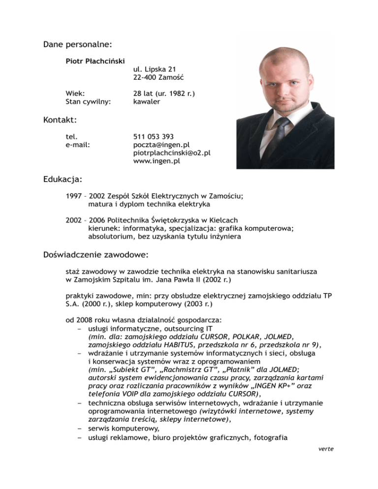 Dane personalne: Piotr Płachciński ul. Lipska 21 22-400 Zamość Wiek: Stan cywilny: 28 lat (ur. 1982 r.) kawaler Kontakt: tel. e-mail: 511 053 393 [email protected] [email protected] www.ingen.pl Edukacja: 1997 – 2002 Zespół Szkół Elektrycznych w Zamościu; matura i dyplom technika elektryka 2002 – 2006 Politechnika Świętokrzyska w Kielcach kierunek: informatyka, specjalizacja: grafika komputerowa; absolutorium, bez uzyskania tytułu inżyniera Doświadczenie zawodowe: staż zawodowy w zawodzie technika elektryka na stanowisku sanitariusza w Zamojskim Szpitalu im. Jana Pawła II (2002 r.) praktyki zawodowe, min: przy obsłudze elektrycznej zamojskiego oddziału TP S.A. (2000 r.), sklep komputerowy (2003 r.) od 2008 roku własna działalność gospodarcza: − usługi informatyczne, outsourcing IT (min. dla: zamojskiego oddziału CURSOR, POLKAR, JOLMED, zamojskiego oddziału HABITUS, przedszkola nr 6, przedszkola nr 9), − wdrażanie i utrzymanie systemów informatycznych i sieci, obsługa i konserwacja systemów wraz z oprogramowaniem (min. „Subiekt GT”, „Rachmistrz GT”, „Płatnik” dla JOLMED; autorski system ewidencjonowania czasu pracy, zarządzania kartami pracy oraz rozliczania pracowników z wyników „INGEN KP+” oraz telefonia VOIP dla zamojskiego oddziału CURSOR), − techniczna obsługa serwisów internetowych, wdrażanie i utrzymanie oprogramowania internetowego (wizytówki internetowe, systemy zarządzania treścią, sklepy internetowe), − serwis komputerowy, − usługi reklamowe, biuro projektów graficznych, fotografia verte przeprowadzanie szkoleń z zakresu informatyki, grafiki komputerowej oraz fotografii dla: – Zamojskiego Towarzystwa Brata Alberta (2009 r.); a) kurs informatyczny: cel szkolenia: aktywizacja osób bezdomnych, przystosowanie do wymagań współczesnego rynku pracy oraz zapoznanie z bieżącymi metodami pozyskiwania i wymiany informacji; zakres szkolenia: wprowadzenie do świata IT, zapoznanie z systemem operacyjnym (Windows XP), jego funkcjami i elementarnym oprogramowaniem, Idea i możliwości internetu, integracja przez popularne portale społecznościowe i grupy/fora regionalne i tematyczne, podstawy obsługi oprogramowania biurowego (tworzenie CV, listów motywacyjnych i podań), podstawy obróbki graficznej na potrzeby kursu fotograficznego; b) kurs fotograficzny: cel szkolenia: aktywizacja osób bezdomnych przez kontakt z fotografią, uwrażliwienie ich na otoczenie oraz danie możliwości pokazania emocji i świata z punktu widzenia osoby bezdomnej; zakres szkolenia: idea fotografii, zapoznanie z twórczością kilku znaczących fotografów, praca z aparatem, reguły rządzące fotografią, praca ze światłem (ćwiczenia w studio z oświetleniem studyjnym), ćwiczenia z portretu, reportażu i fotografii ulicznej, współpraca przy organizacji i realizacja wernisażu w Zamojskim Domu Kultury. – Gimnazjum nr 5 w Zamościu (2009 r.) cel szkolenia: wdrożenie systemu CMS na potrzeby Wojewódzkiego Konkursu Języka Angielskiego – Clickonmaniac; zakres szklenia: systematyzacja wiedzy z zakresu internetu, domen i hostingów, idea CMS, obsługa hostingu, bazy danych i FTP, CMS Joomla, personalizacja wyglądu, tworzenie i modyfikacje interfejsu, dodawanie i aktualizowanie treści. – Europejskiego Centrum Kształcenia „Eureka” (2009 r.) a) kurs grafiki komputerowej: zakres szkolenia: min. wprowadzenie do grafiki komputerowej, narzędzia i organizacja pracy grafika, typy grafik, ich różnice i zastosowanie, pojęcia z zakresu grafiki komputerowej, DTP i poligrafii, cykl powstawania grafik od wytycznych projektu po druk i publikacje (w tym na potrzeby www). b) kurs Corel Draw: zakres szkolenia: min. zapoznanie z pakietem narzędzi firmy Corel, zapoznanie ze środowiskiem graficznym programu Corel Draw, narzędzia dostępne w Corel Draw, technika pracy z poszczególnymi narzędziami, ćwiczenia z zakresu tworzenia podstawowych i zaawansowanych projektów graficznych, tworzenie i publikacja stron internetowych tworzonych w Corel Draw. verte – Zamojskiej Grupy Fotograficznej (2009-2010 r.) cel szkolenia: poszerzanie wiedzy z zakresu klasycznej i cyfrowej fotografii oraz współczesnych technik fotograficznych; zakres szkolenia: cykl wykładów z tematów: technika fotografii, kompozycja fotografii, balans bieli w fotografii cyfrowej, format RAW i jego „wywoływanie”, Adobe Photoshop i obróbka materiału fotograficznego. Umiejętności: biegła obsługa komputera: środowisko Windows, programy biurowe, graficzne i inne podstawowa znajomość systemów uniksowych znajomość sprzętu komputerowego klasy PC oraz sieci komputerowych programowanie: C++ (i podobne), PHP, SQL (i podobne), programowanie obiektowe, HTML, CSS, JAVA SCRIPT, inne umiejętność zarządzania hostingami, domenami i aplikacjami sieciowymi znajomość języka angielskiego (poziom średni) prawo jazdy kategorii B (od 2000 r.) Zainteresowania: fotografia (tworzenie i organizacja pracy Zamojskiej Grupy Fotograficznej), nowoczesne technologie IT oraz multimedialne "Wyrażam zgodę na przetwarzanie moich danych osobowych zawartych w aplikacji dla potrzeb niezbędnych do realizacji procesu rekrutacji zgodnie z ustawą z dn. 29.08.1997r o ochronie danych osobowych (Dz.U. nr 133, poz. 883)."