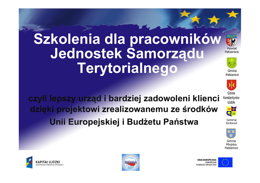 Szkolenia dla pracowników Jednostek Samorządu Terytorialnego czyli lepszy urząd i bardziej zadowoleni klienci dzięki projektowi zrealizowanemu ze środków Unii Europejskiej i Budżetu Państwa Doskonalenie umiejętności pracowników JST z terenu powiatu pabianickiego poprzez kompleksowe szkolenia z zakresu efektywnego wykorzystania programów komputerowych Projekt realizowany w ramach: Priorytetu V POKL - Dobre rządzenie Działanie 5.2 - Wzmacnianie potencjału administracji samorządowej Poddziałanie 5.2.1 - Modernizacja zarządzania w administracji samorządowej Lider projektu Gmina Miejska Pabianice Projekt zrealizowany w partnerstwie 5 Jednostek Samorządu Terytorialnego a swoim zasięgiem objął teren Powiatu Pabianickiego. Cele projektu: - WSPIERANIE USPRAWNIEŃ ZARZĄDCZYCH W JEDNOSTKACH SAMORZĄDU TERYTORIALNEGO - POPORAWA ORGANIZACJI I FUNKCJONOWANIA URZĘDÓW ORAZ PODNIESIENIE JAKOŚCI OBSŁUGI KLIENTA - BUDOWANIE SPOŁECZEŃSTWA INFORMACYJNEGO POPRZEZ WDRAŻANIE ROZWIĄZAŃ ICT Przeszkolonych ponad 250 pracowników 5 JST Zrealizowanych łącznie ponad 2 000 h zajęć 100 uczestników szkolenia aspekty prawne wykorzystania ICT w JST Szkolenia WORD, ACCES, POWERPOINT , EXCEL zakończone egzaminem ECDL Usprawnienie działania komórek odpowiedzialnych za gospodarkę przestrzenną i ochronę środowiska – System Strateg Podniesienie kompetencji kadry informatycznej przez szkolenia dedykowane MCSA , Oracle, Help Desk UMP - Access Starostwo - Word Po więcej informacji o projekcie zapraszamy na stronę internetową: www.pokl.um.pabianice.pl